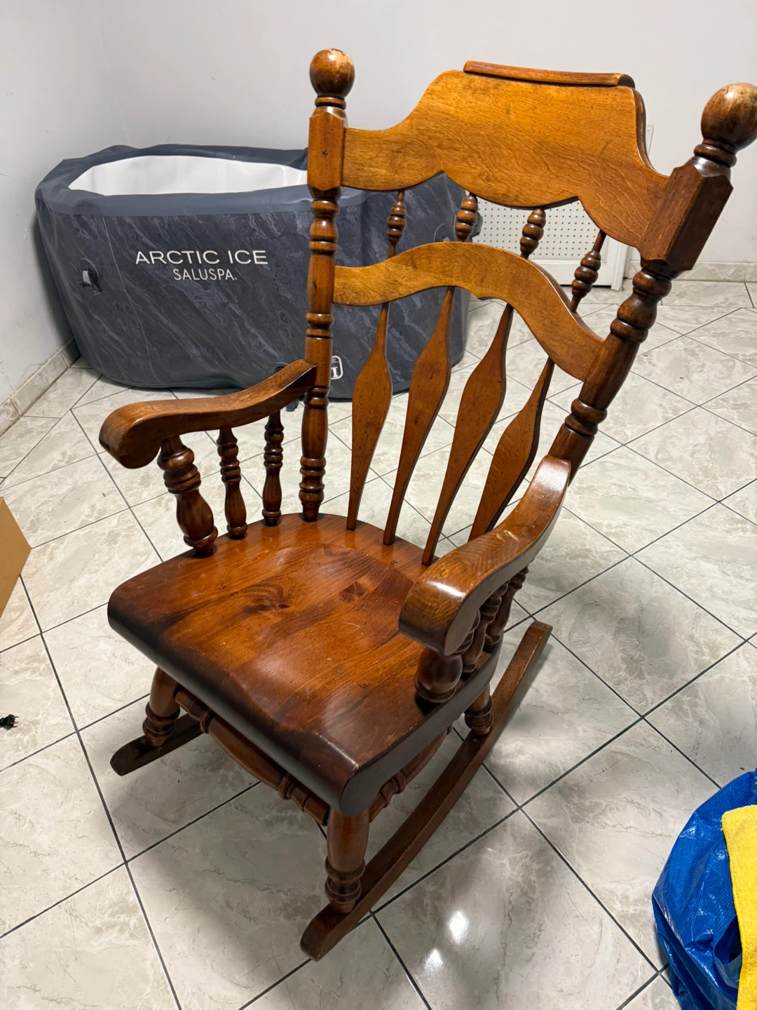 Selling a classic wooden rocking chair. It's in good condition and ready for a new home. Perfect for relaxing on the porch or in the living room!
