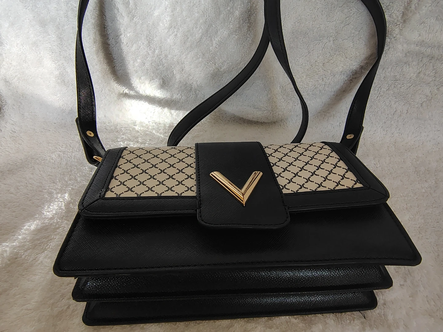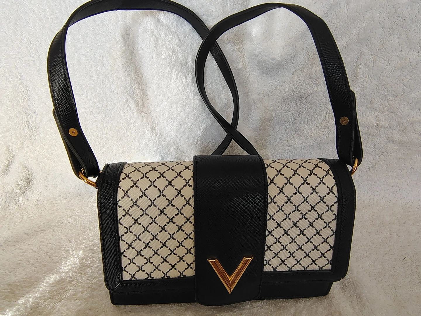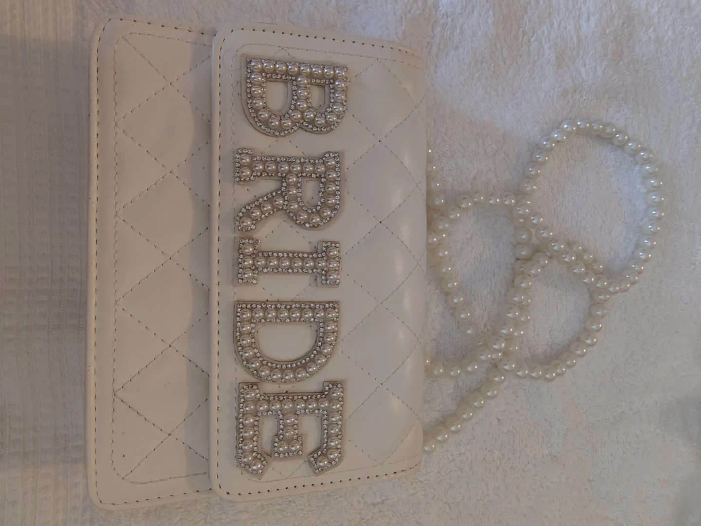 10Here's a cute white quilted clutch with pearl embellishments that spell out "BRIDE"! It comes with a pearl strap. I also have a black and white patterned purse with a gold "V" on the front. It has a black strap.