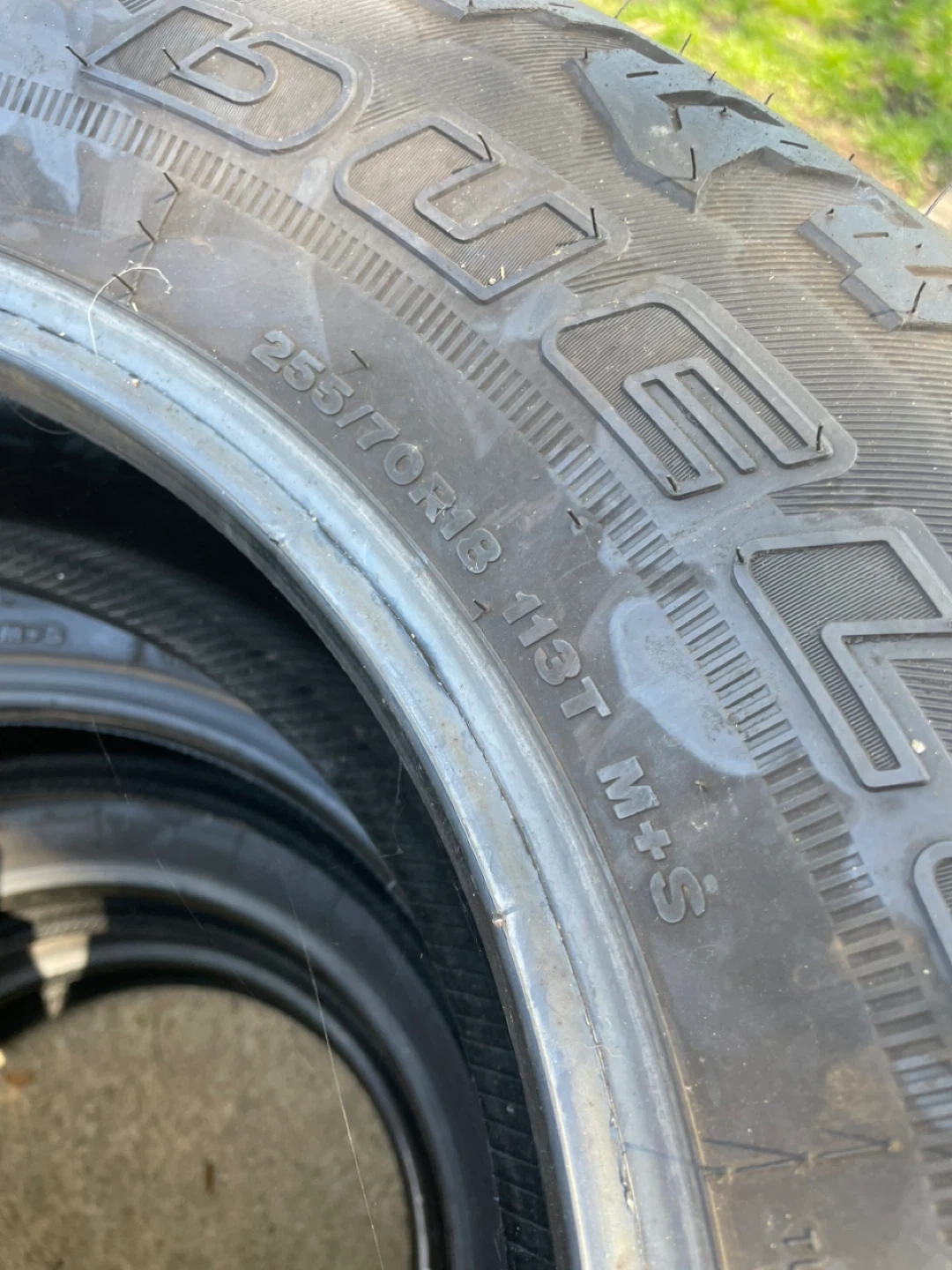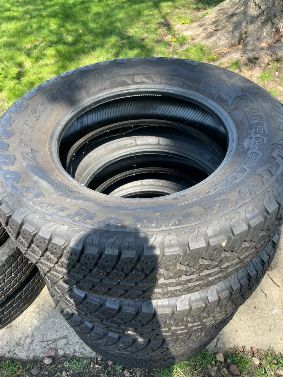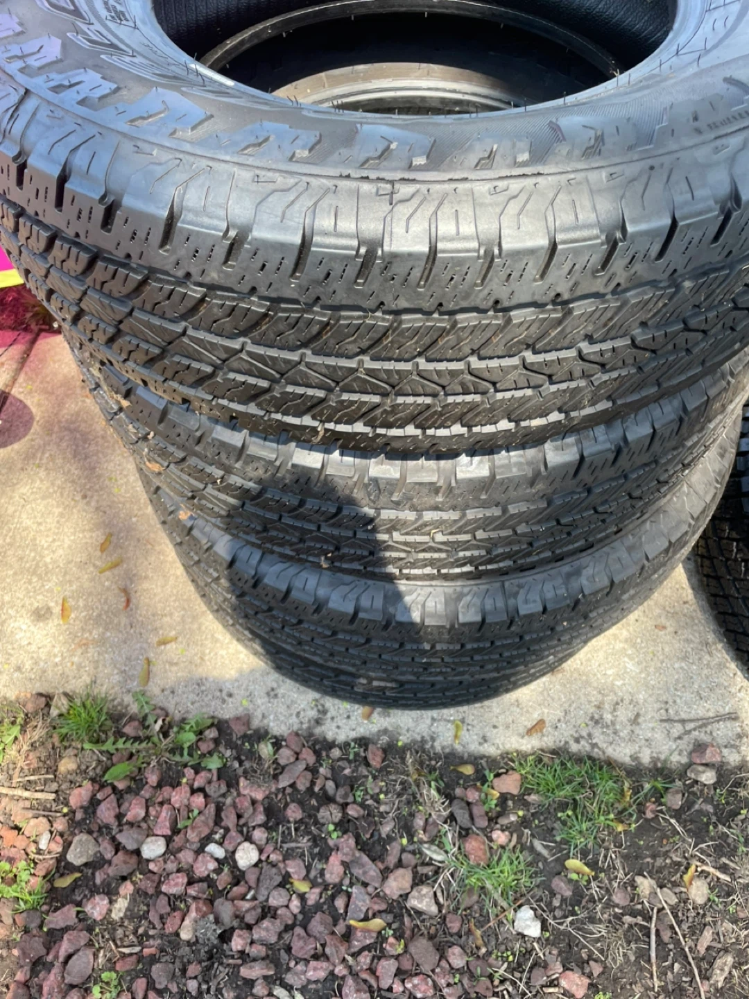 10Selling a set of Bridgestone Dueler A/T tires. There are four tires sized at 255/70R18. They're in used condition, almost new have lots life left in them!