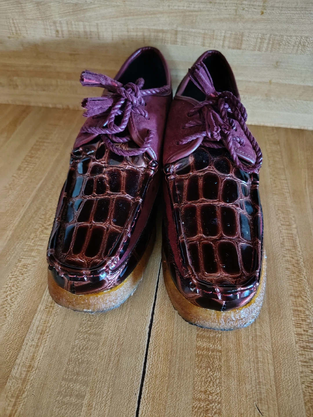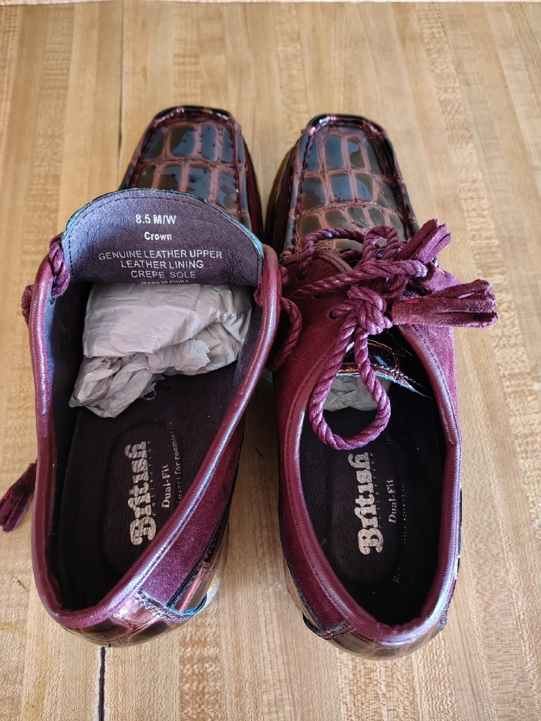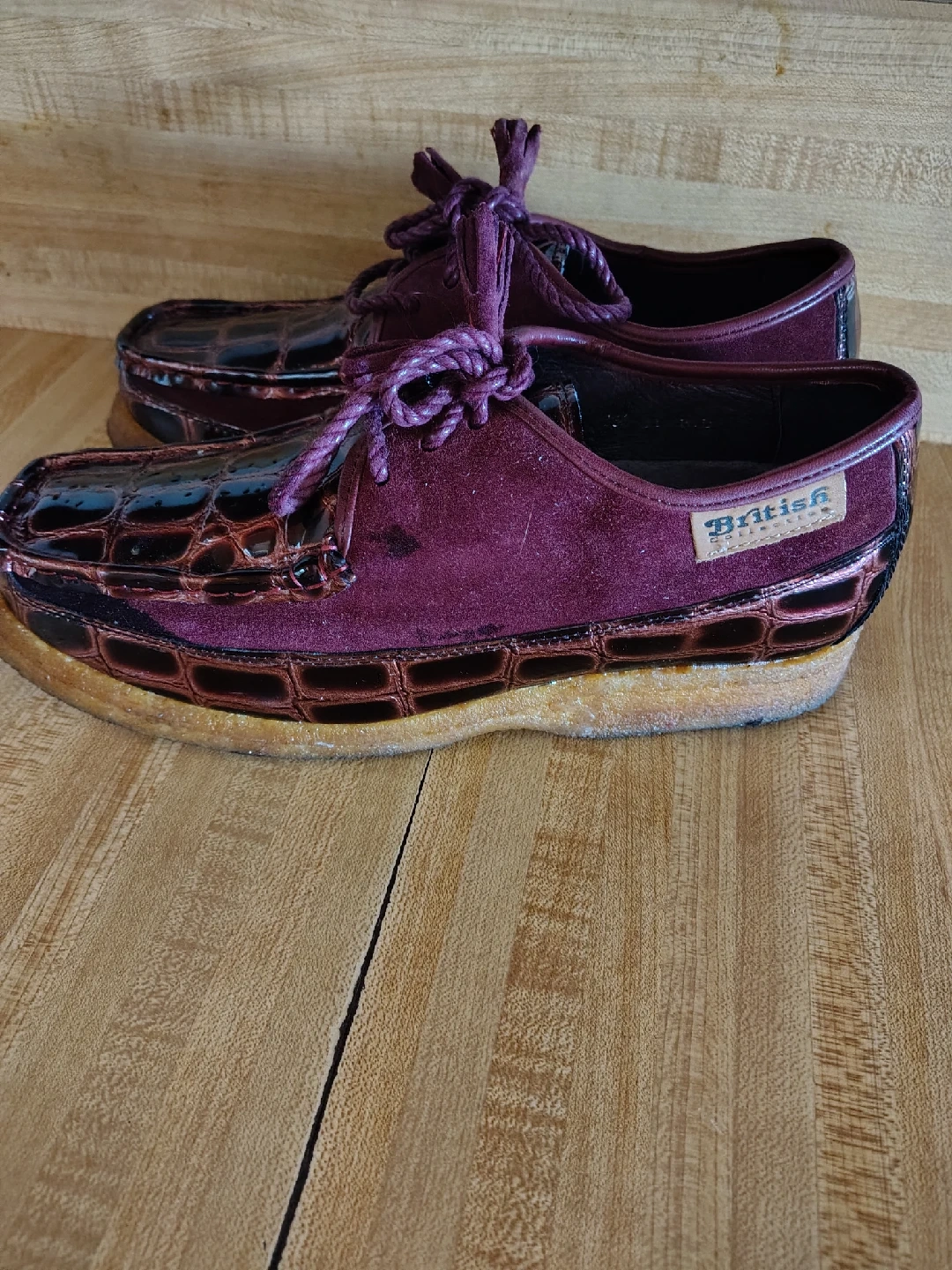 10Selling a pair of British Collection shoes in size 8.5 M/W. They feature a genuine leather upper and a crepe sole. The shoes have a unique design with a suede and crocodile-like texture.
