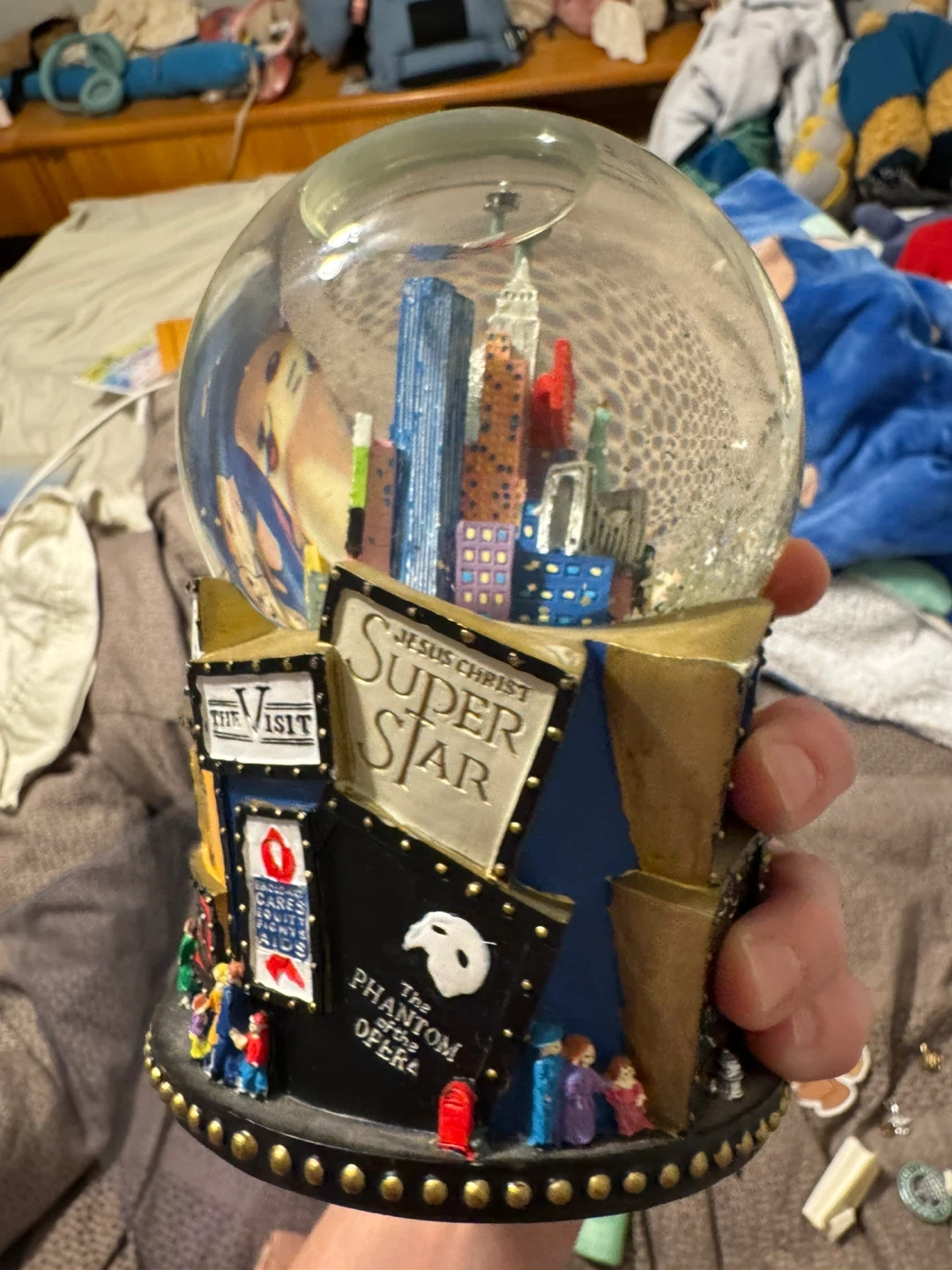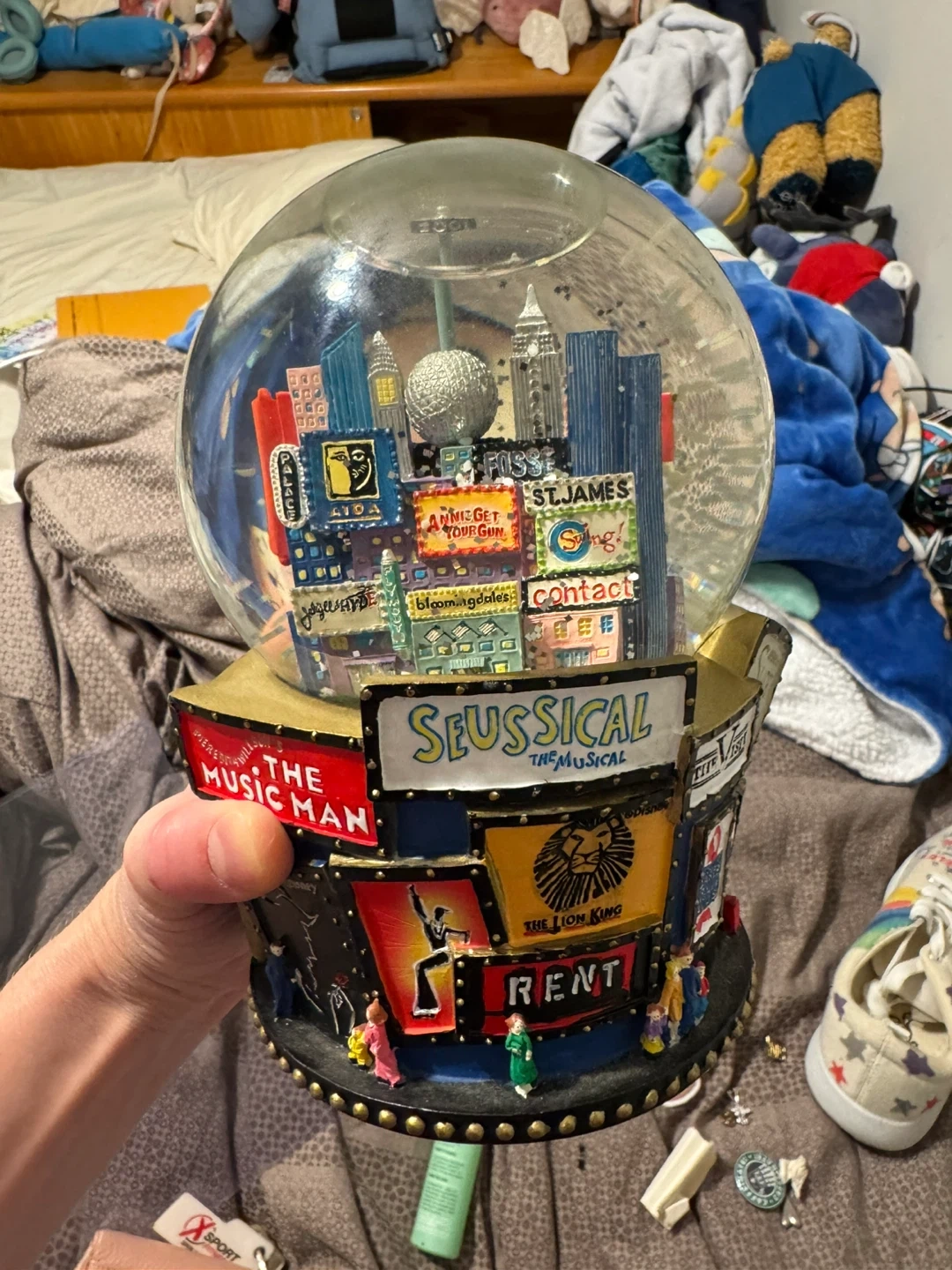 Selling a unique snow globe featuring a variety of Broadway musicals! It includes titles like "The Music Man," "Seussical," "The Lion King," "Rent," "Jesus Christ Superstar," and "The Phantom of the Opera"