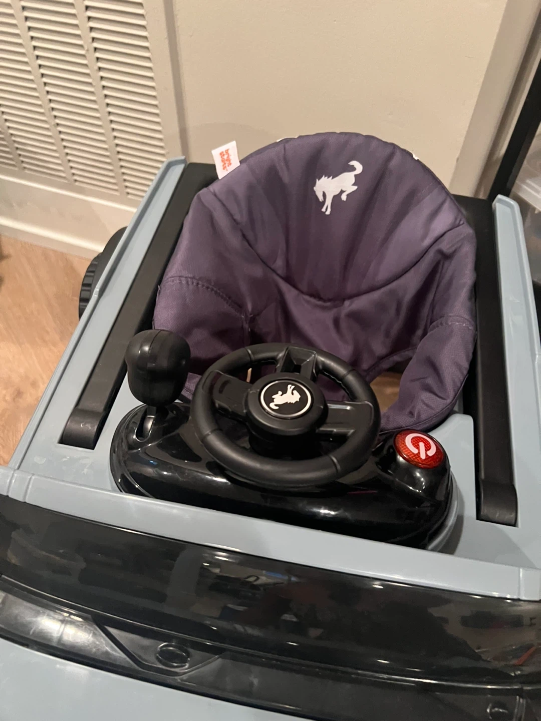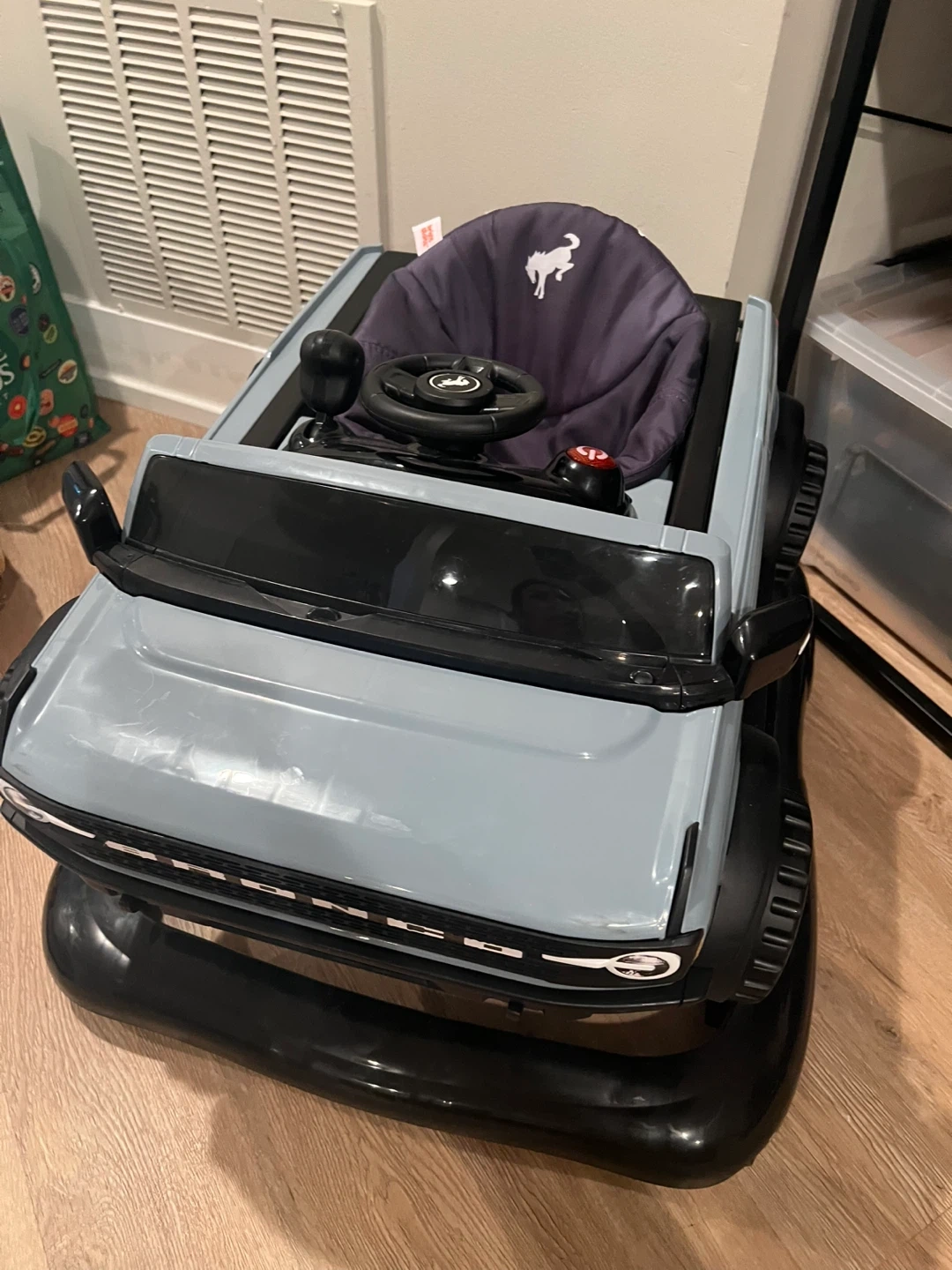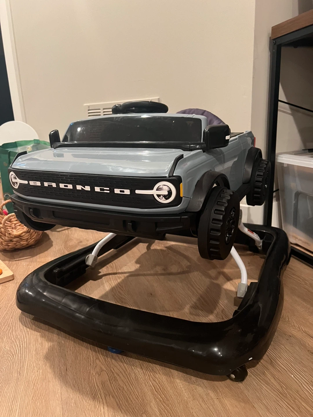 Near new condition bronco walker for babies. Three modes: sitting, walker, push truck! Used by one child who walked very early so it hasn’t been used much! But he loved to play with the steering wheel and turn the sounds on. Has been stored in a finished and clean basement area with no pets, odors, or other issues!