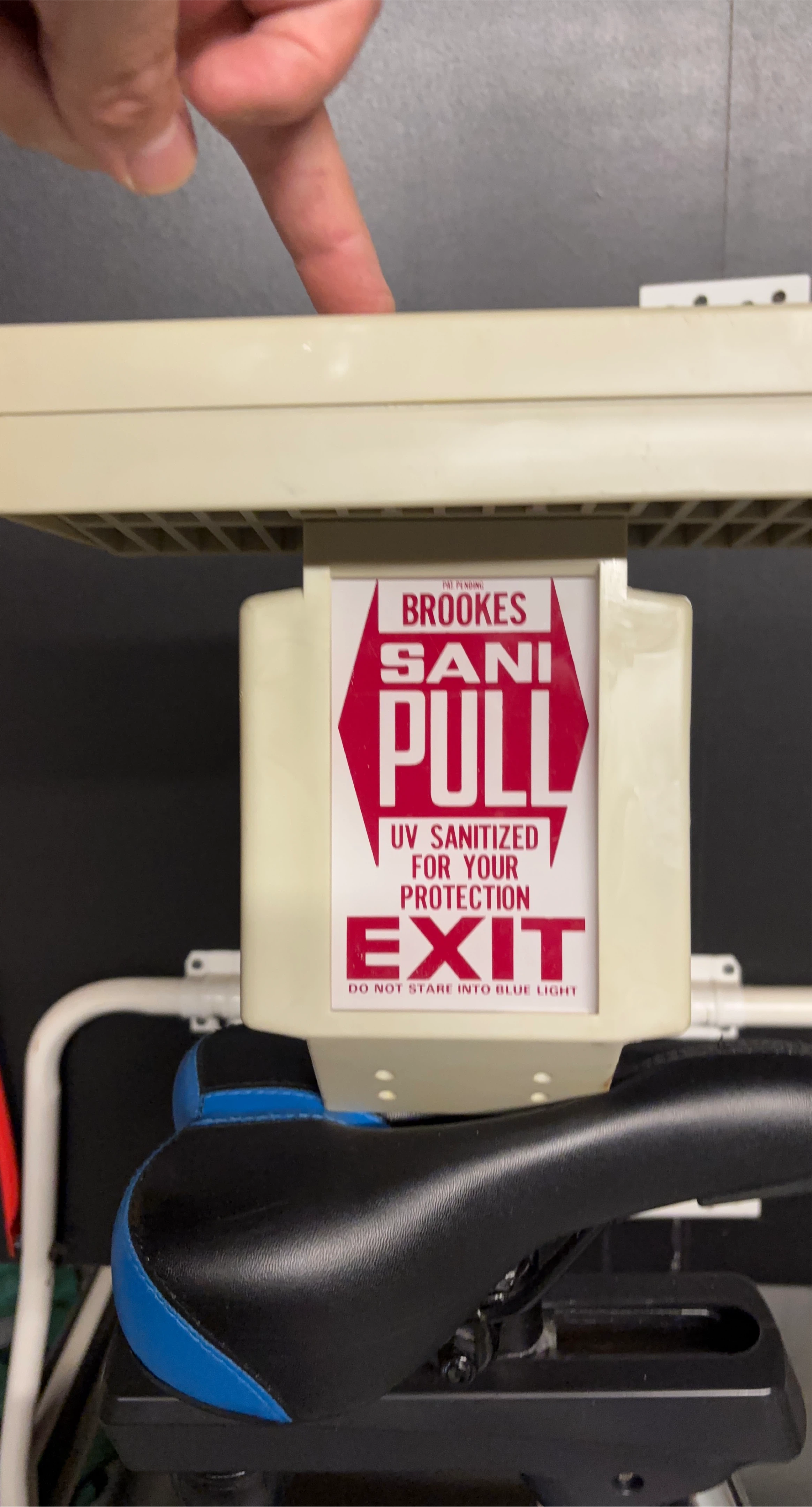 This is a Brookes Sani-Pull UV Sanitized Exit device. It's designed to be UV sanitized for your protection. Please do not stare into the blue light