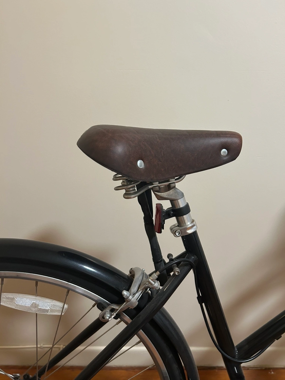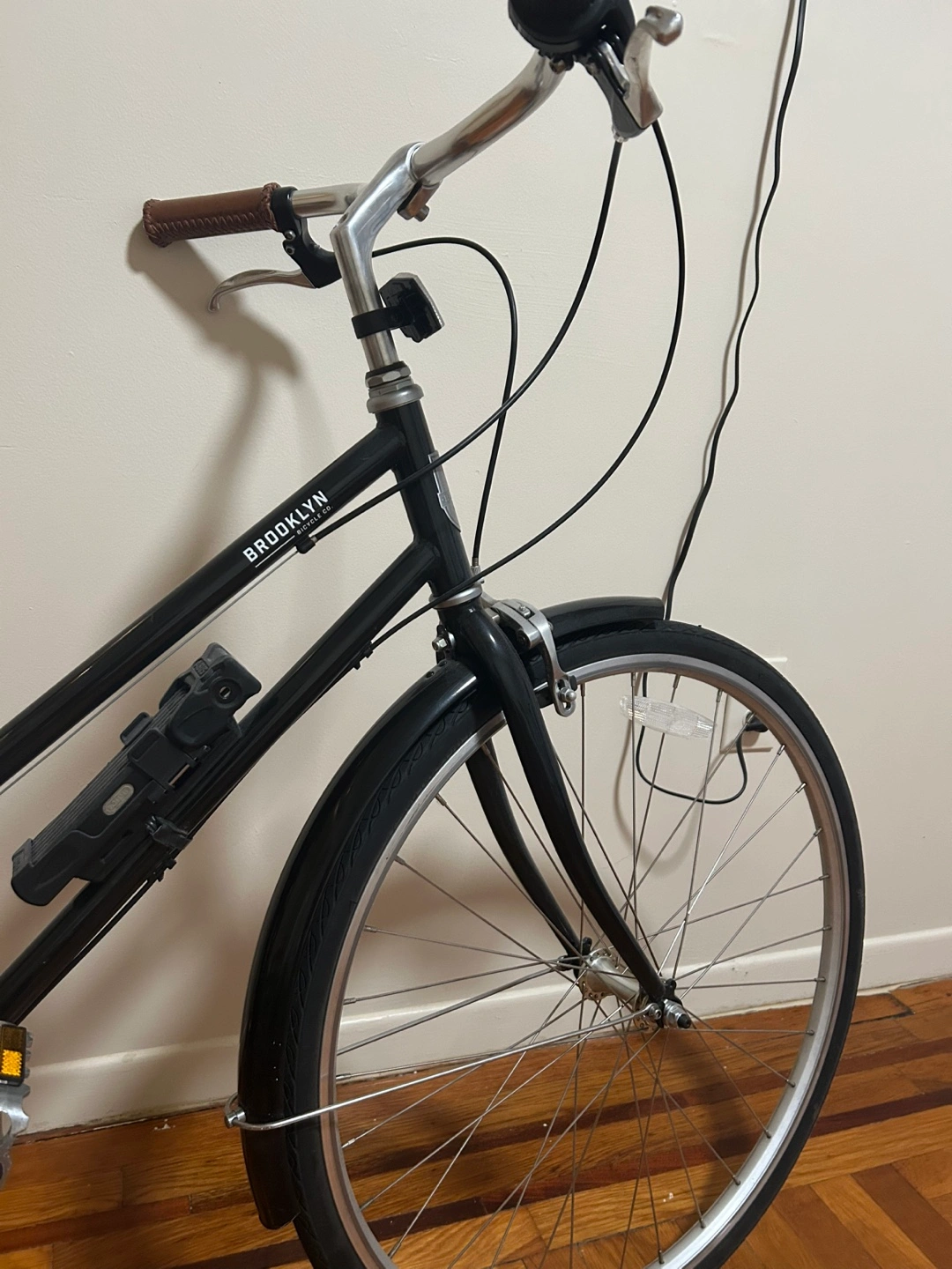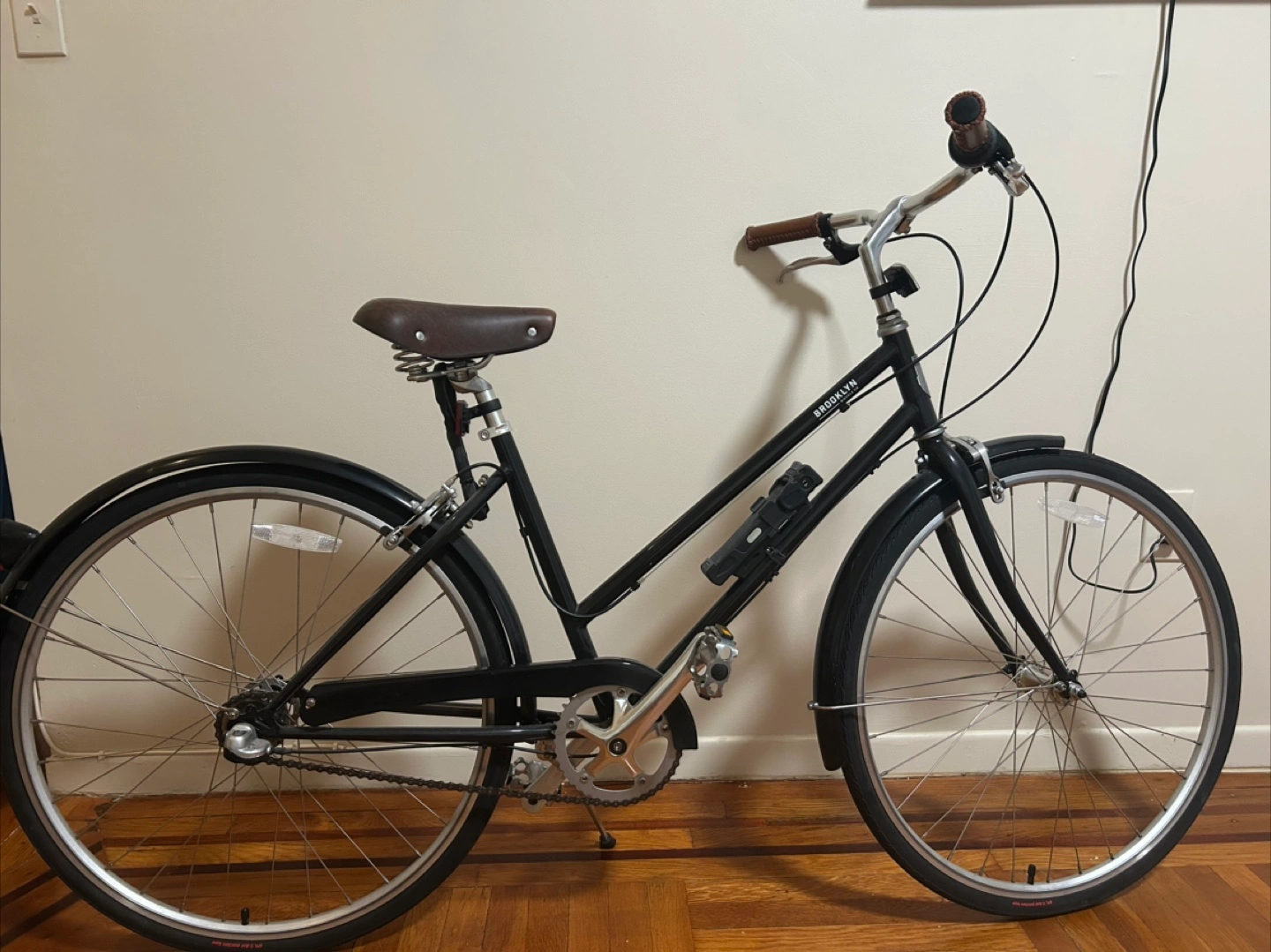 70Black bike with silver wheels. Includes black fenders, a brown seat, and lock. A great way to enjoy a peaceful ride through the city. The bike cover, original saddle, bike lock are all included as extras. * Used less than 10 times *