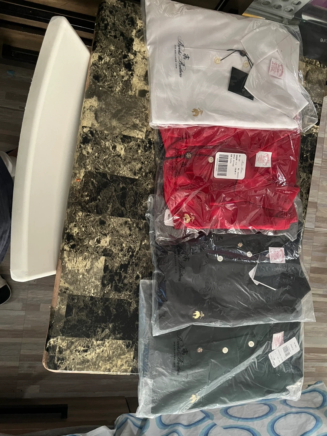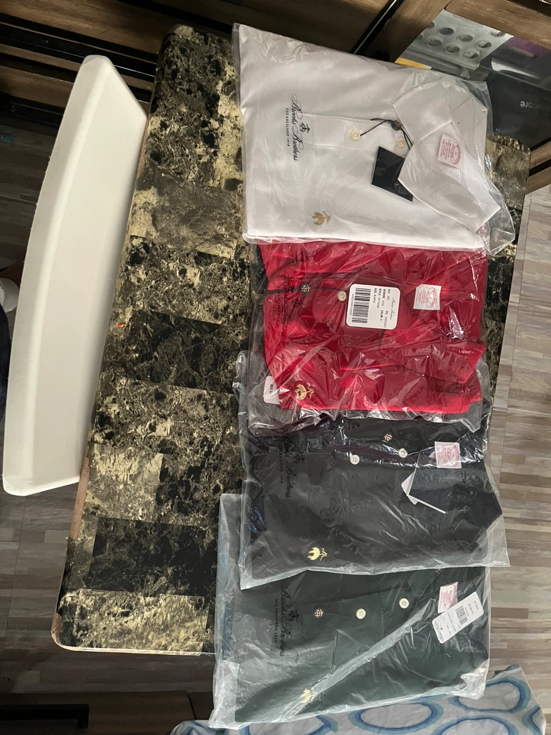 18I have a brand new Brooks Brothers polo shirt for sale! It's a vibrant red white black blue colors and still in its original packaging. The shirt features the classic Brooks Brothers logo. Originally bought for $89.50