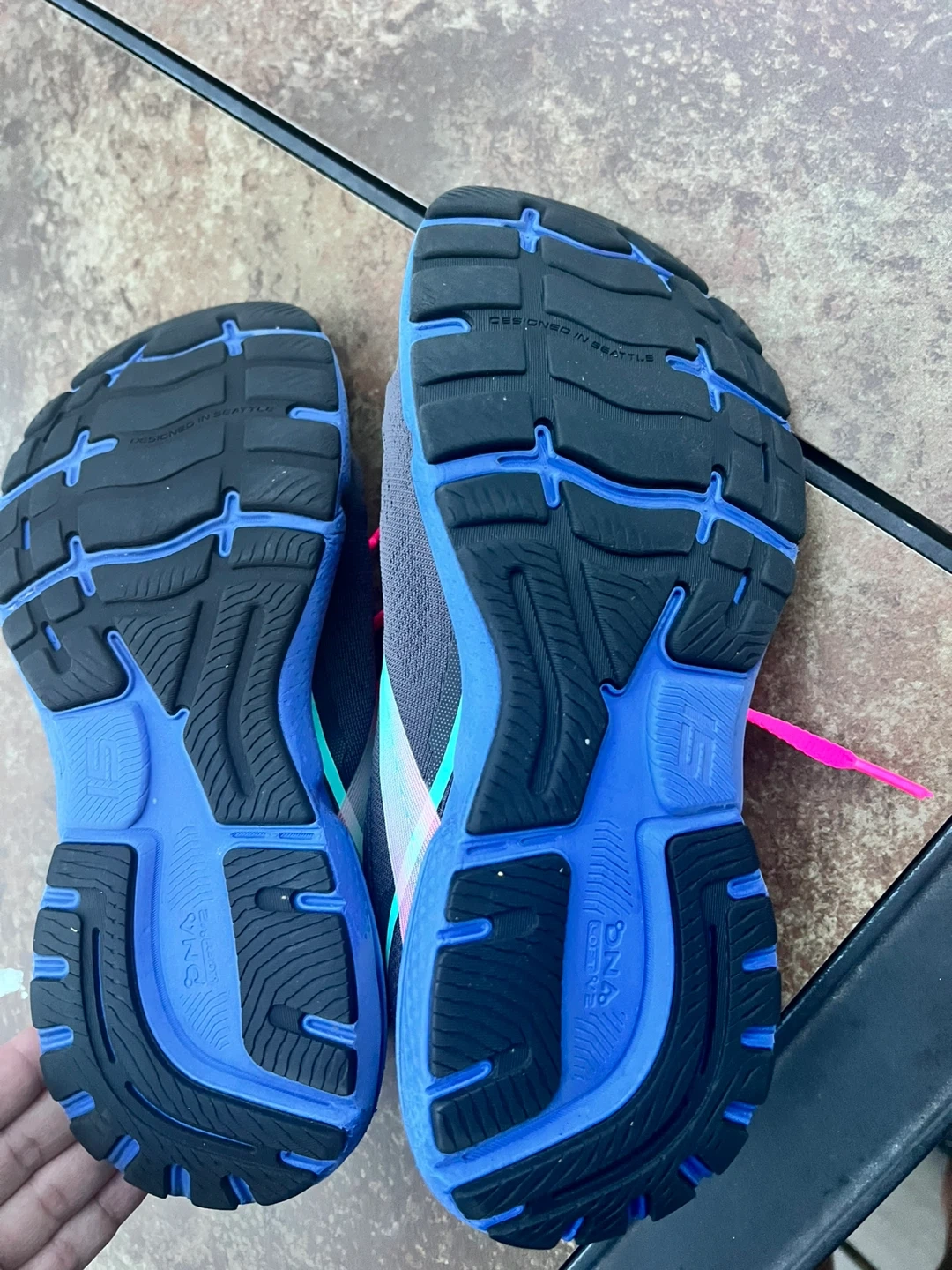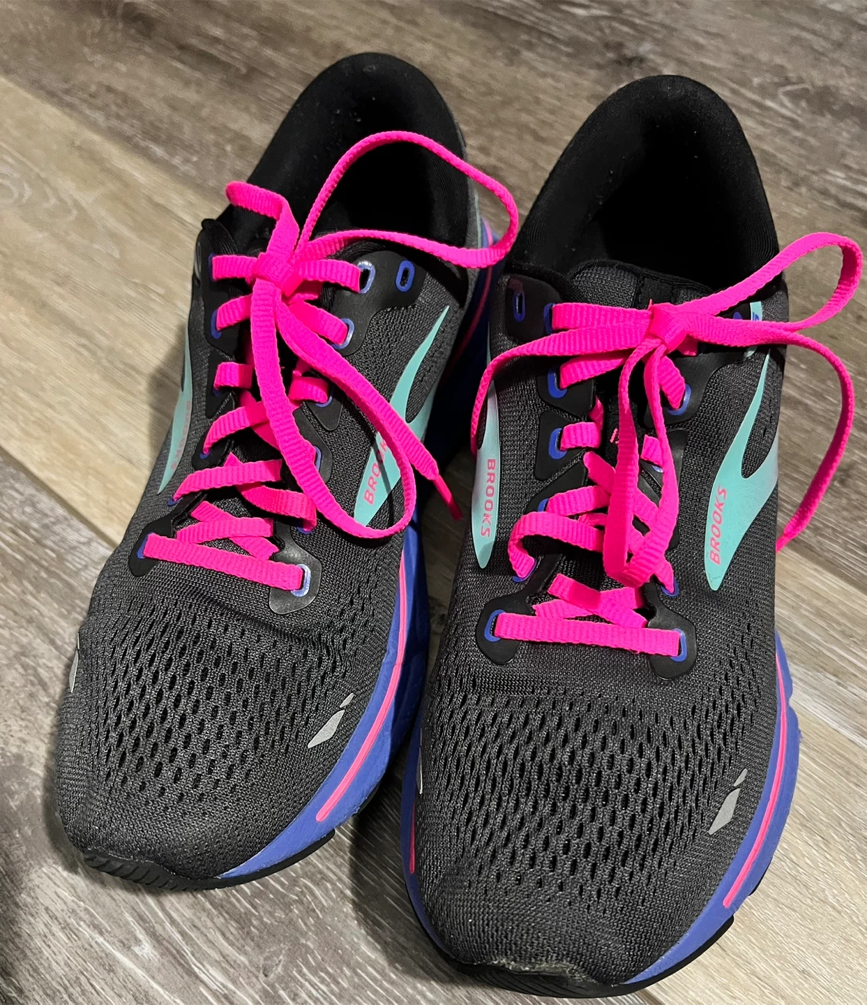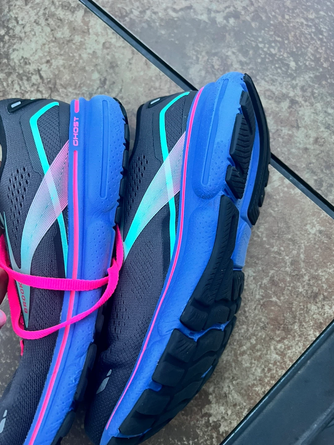 60Selling a pair of Brooks Ghost 14 running shoes! They feature a black, blue, and pink color scheme. Great for running or everyday wear Like NEW