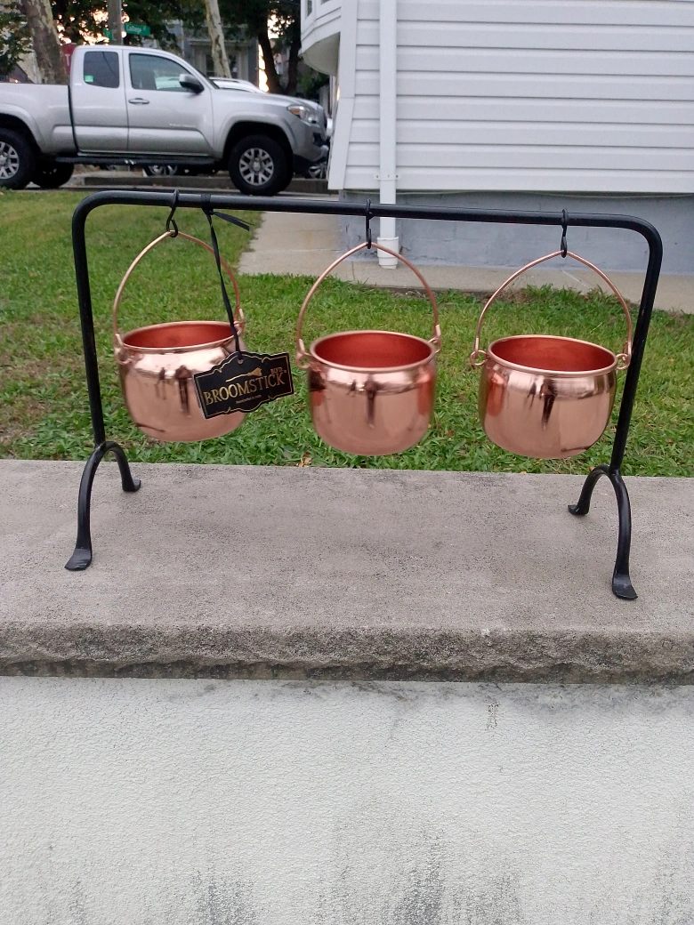 Set of three copper hanging pots with a black metal stand. Perfect for adding a touch of rustic charm to your home or garden!