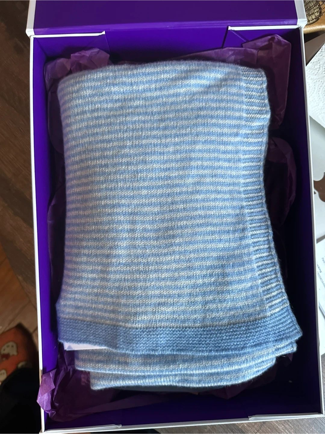 60Selling a brand new Brora cashmere baby blanket in pale blue and pearl! It's 100 x 70 cm and made of 100% cashmere. Comes in the original box, perfect for gifting!