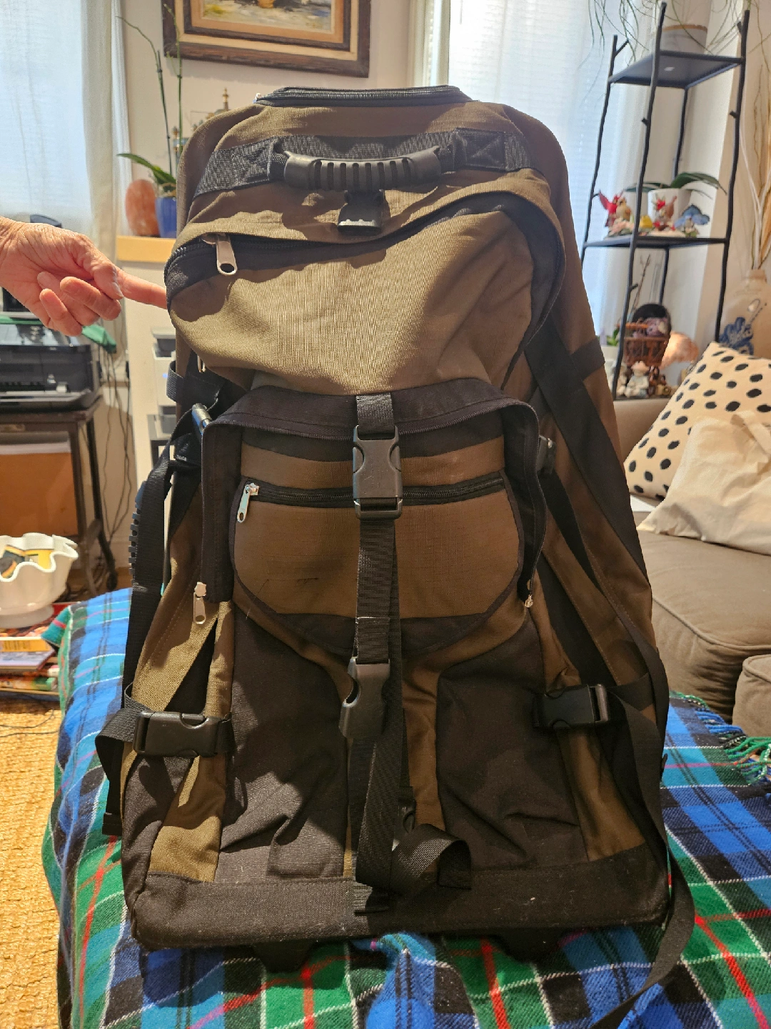 Selling a brown and black backpack. It has multiple compartments and zippers for easy organization. Great for travel or everyday use!