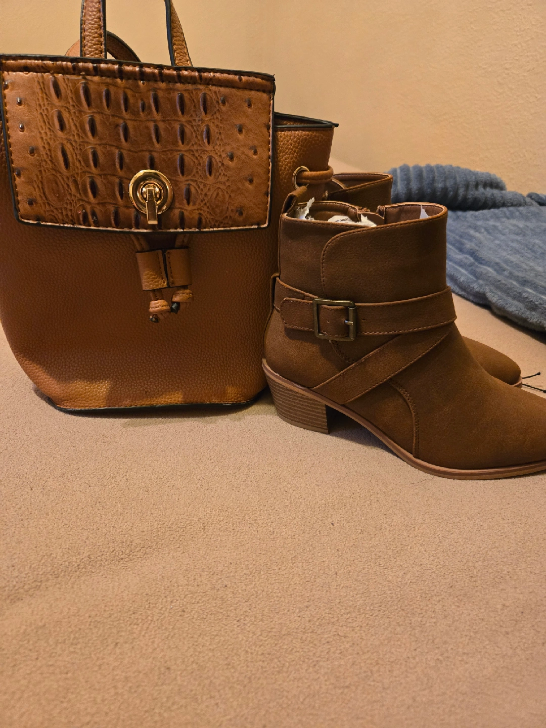 Here's a cute set featuring brown ankle boots and a matching backpack! The boots have a stylish buckle detail, and the backpack features a unique textured design. Perfect for adding a touch of style to your everyday look