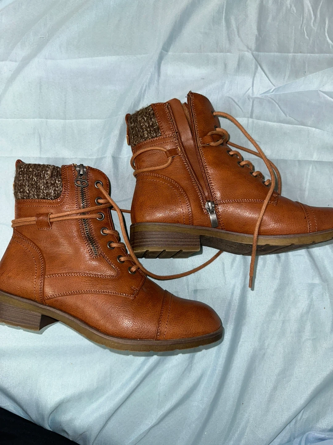10These are a pair of brown ankle boots. They have a lace-up front and a zipper on the side. The boots are in good condition with some signs of wear.