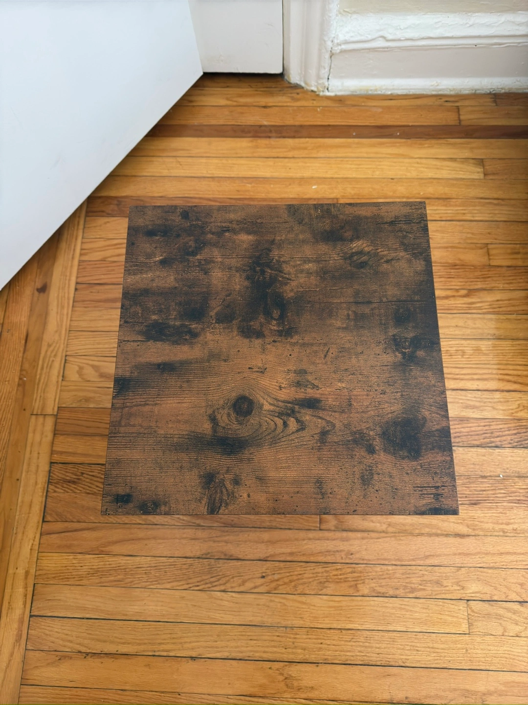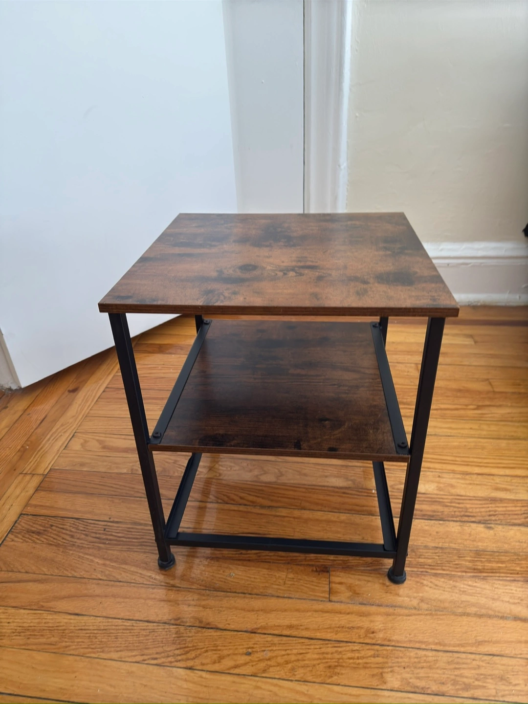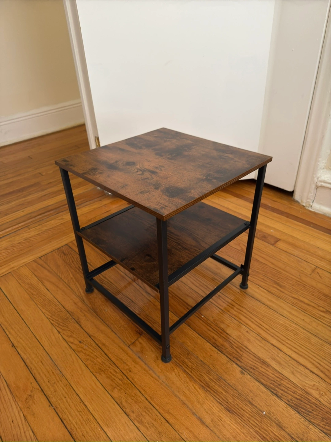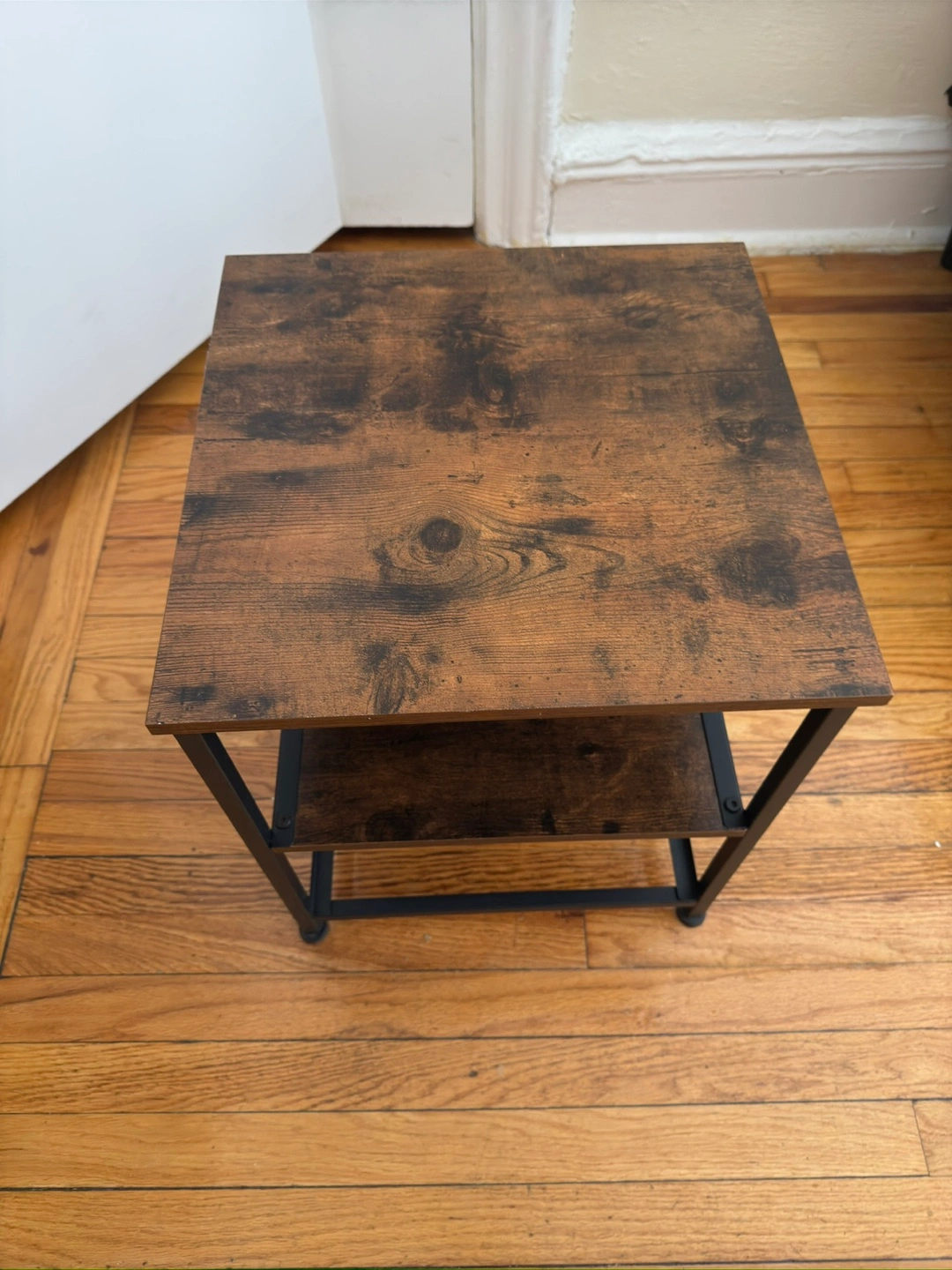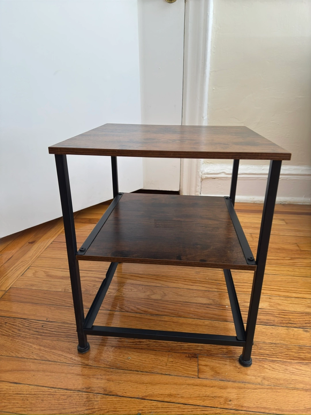 Selling a cute little end table! It has two tiers, perfect for storage or display. The top and shelf are a dark wood grain, and the frame is black metal. It's in great condition and ready for a new home