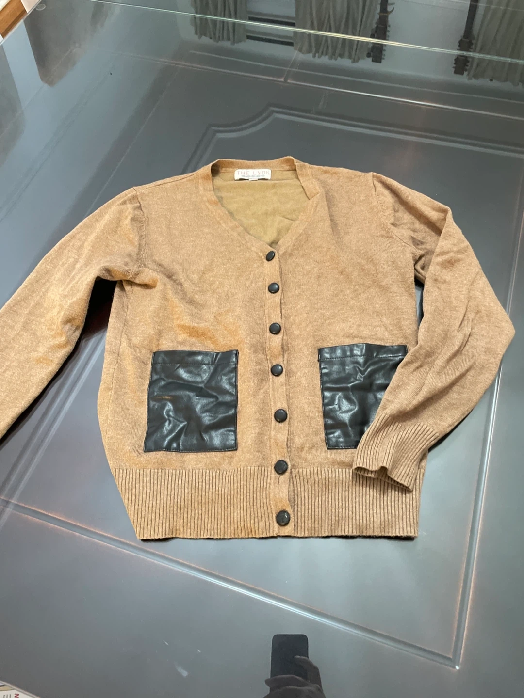 Selling a cardigan in a lovely brown color. It features stylish black pocket details and button-up closure. Perfect for layering or wearing on its own!