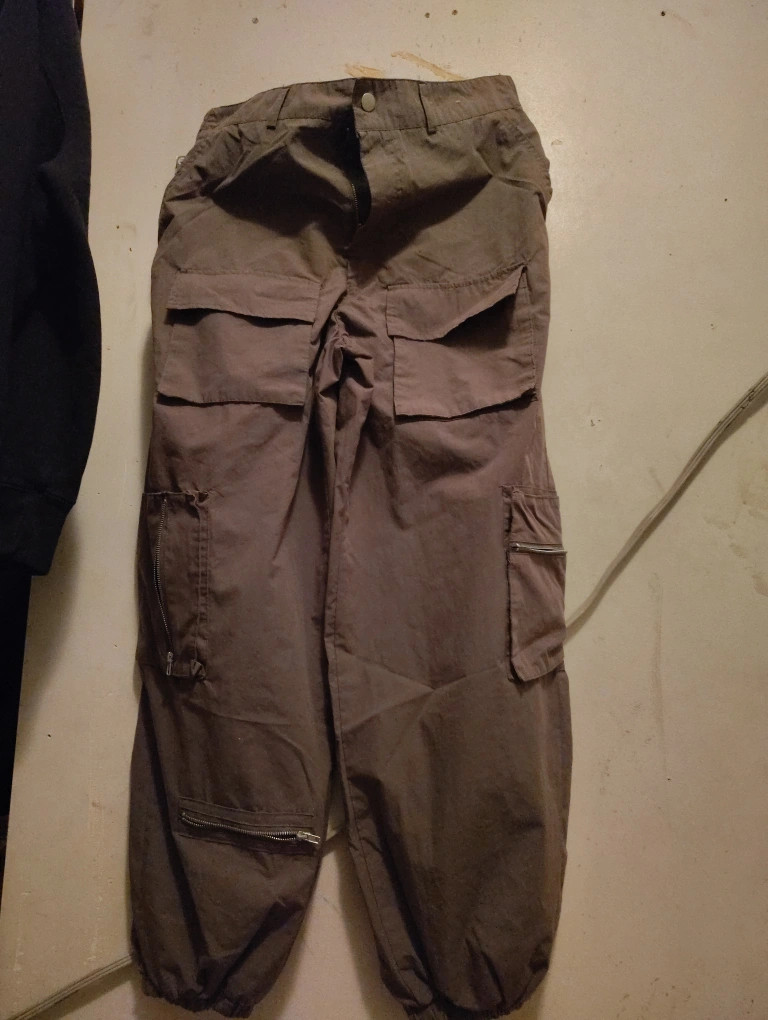 Selling a pair of brown cargo pants. They have a relaxed fit and lots of pockets, perfect for everyday wear