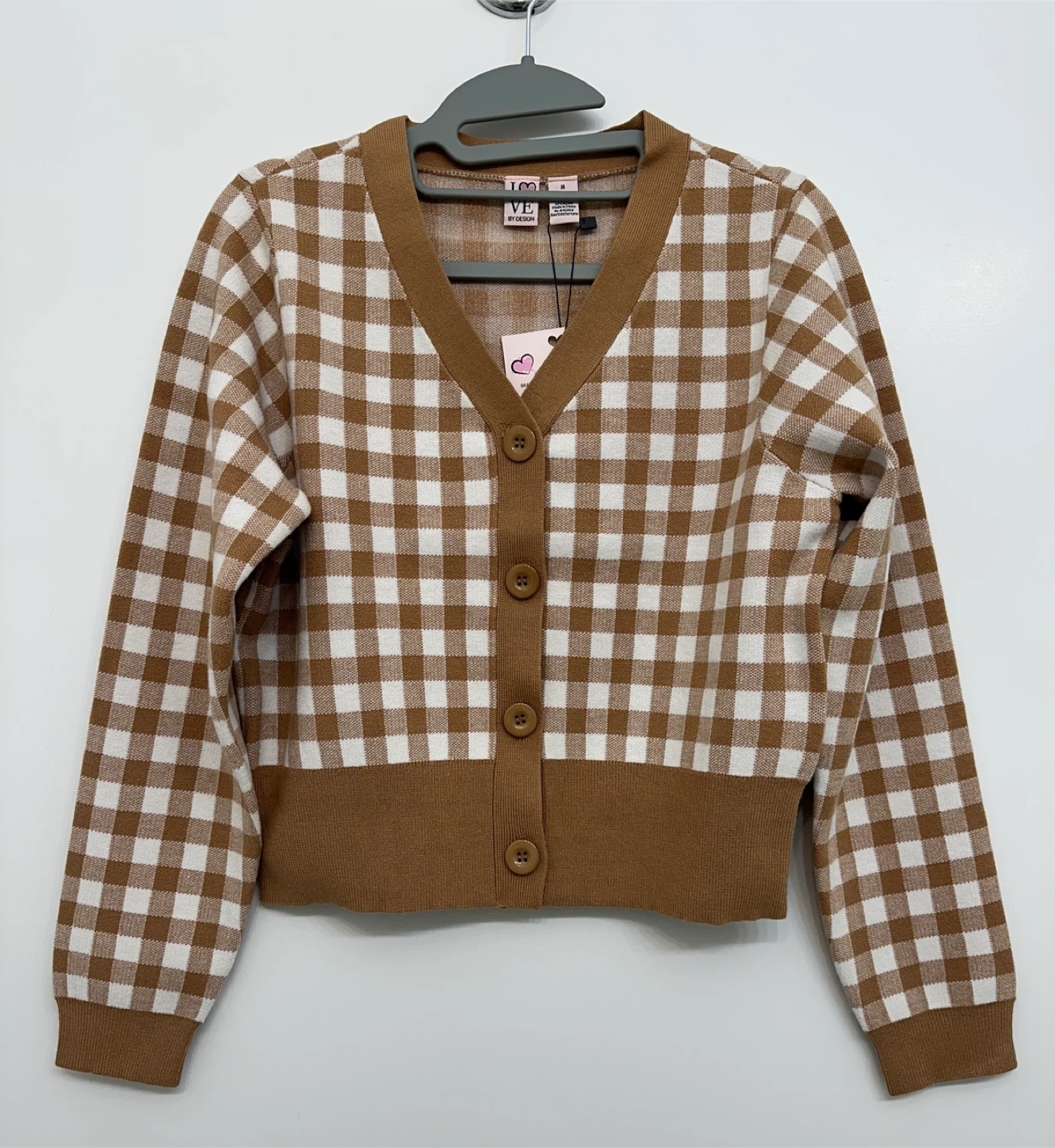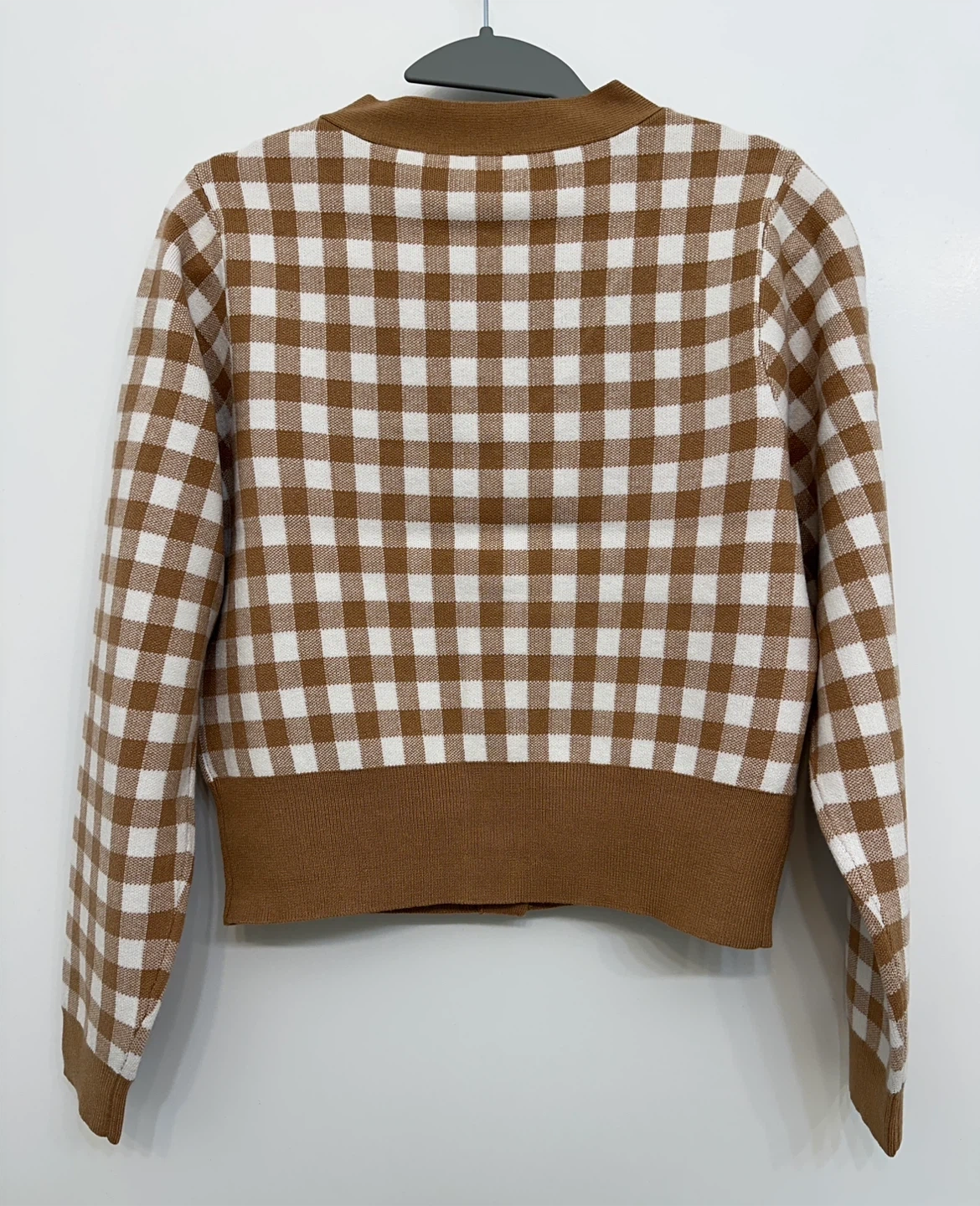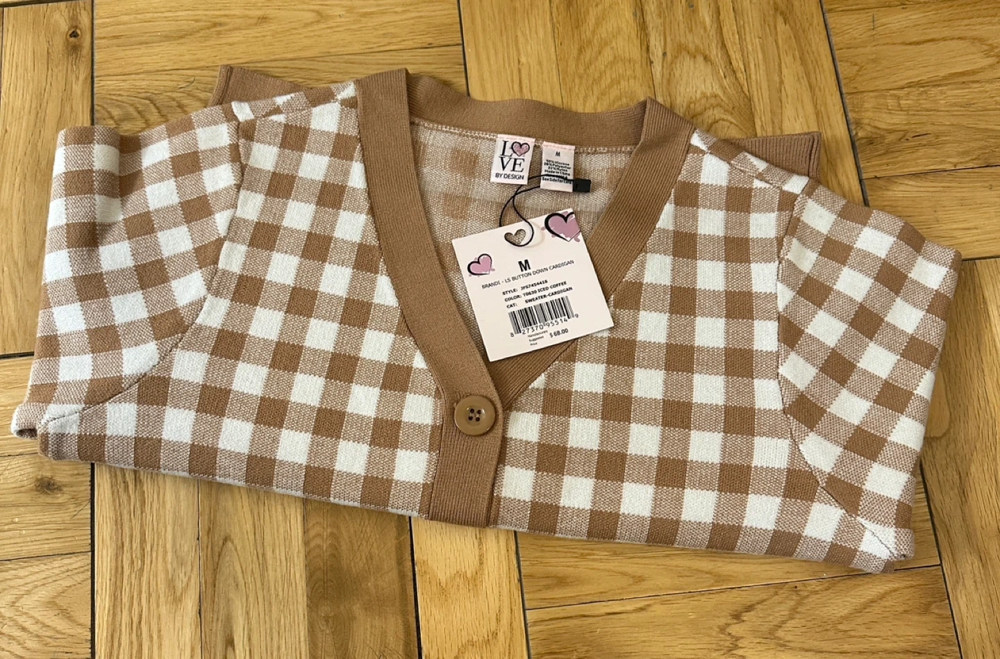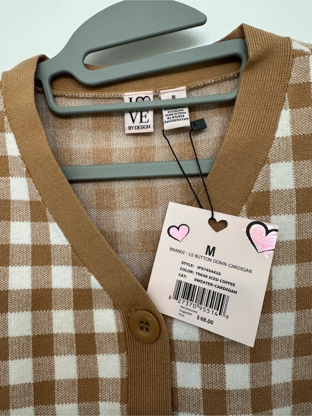 1000+This is a cute button-down cardigan in a brown checkered pattern! It's a size medium. The color is Iced Coffee. Originally priced at $68