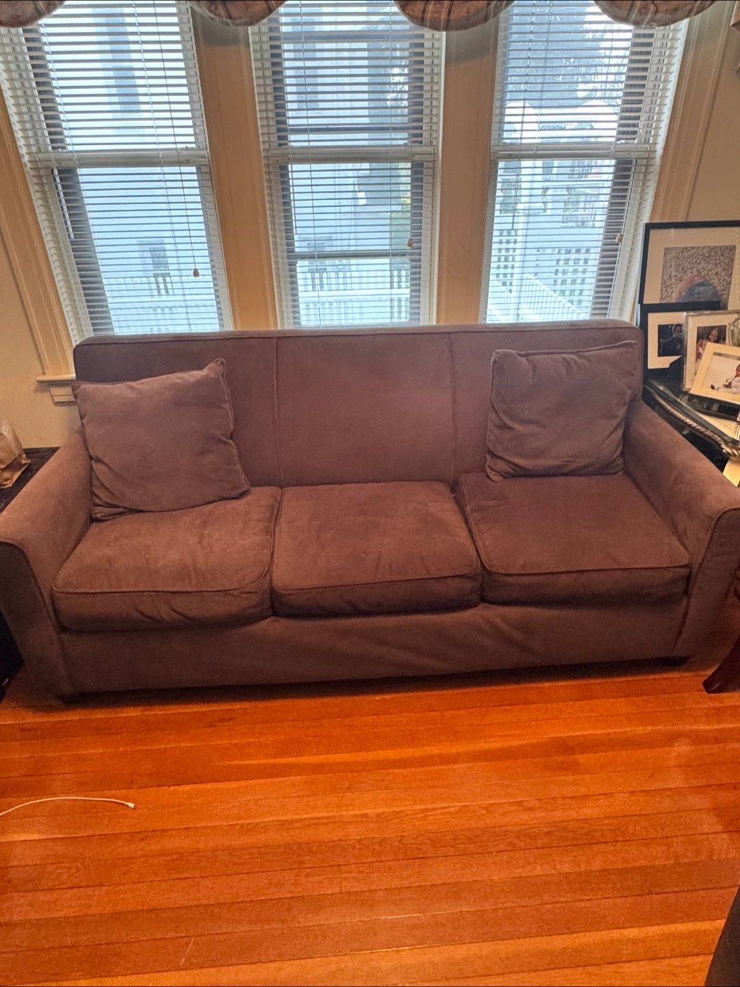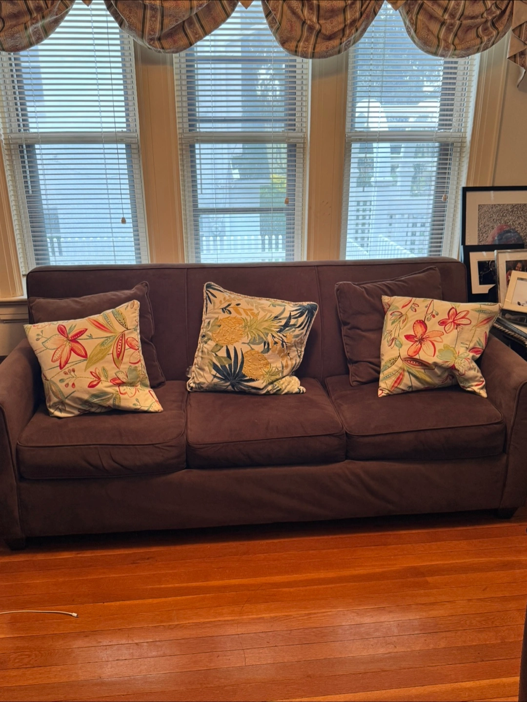 Beautiful brown couch. Three cushioned seats with separate back cushions. Includes three patterned throw pillows and two solid brown pillows. A perfect place to relax after a long day. In Good Condition . Purchased a replacement so would hate to throw out