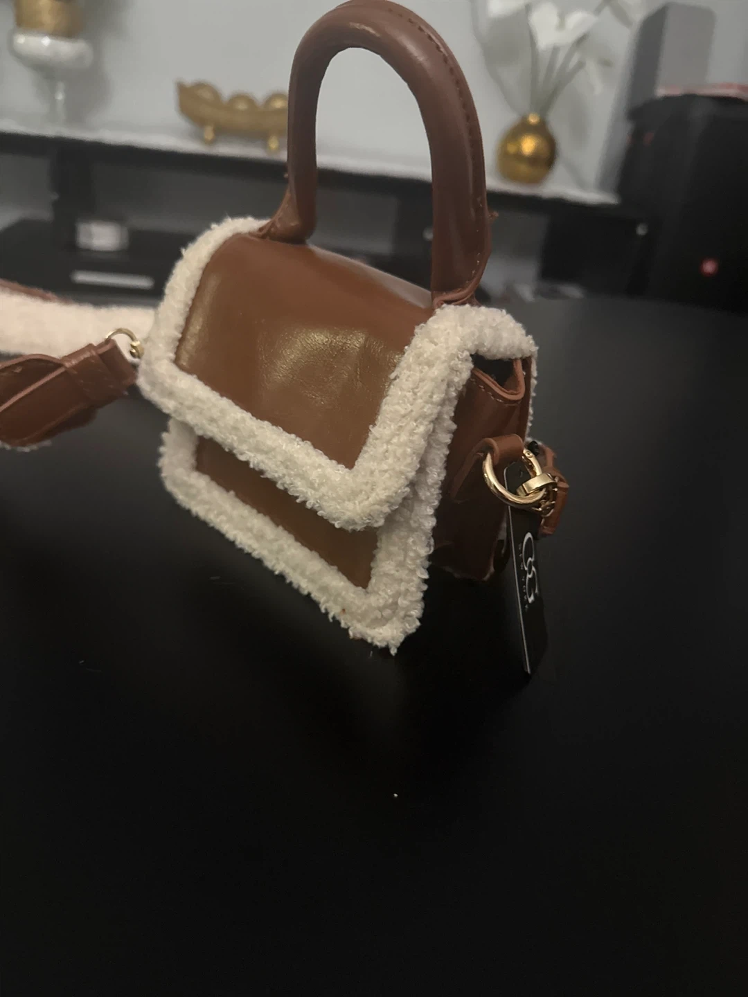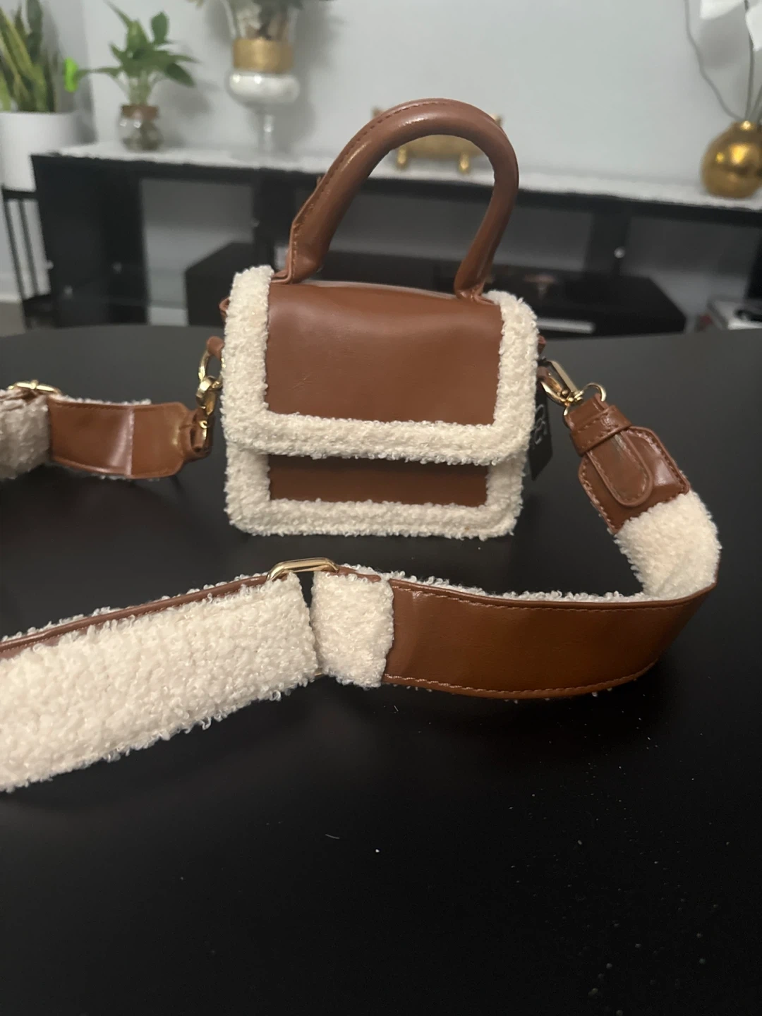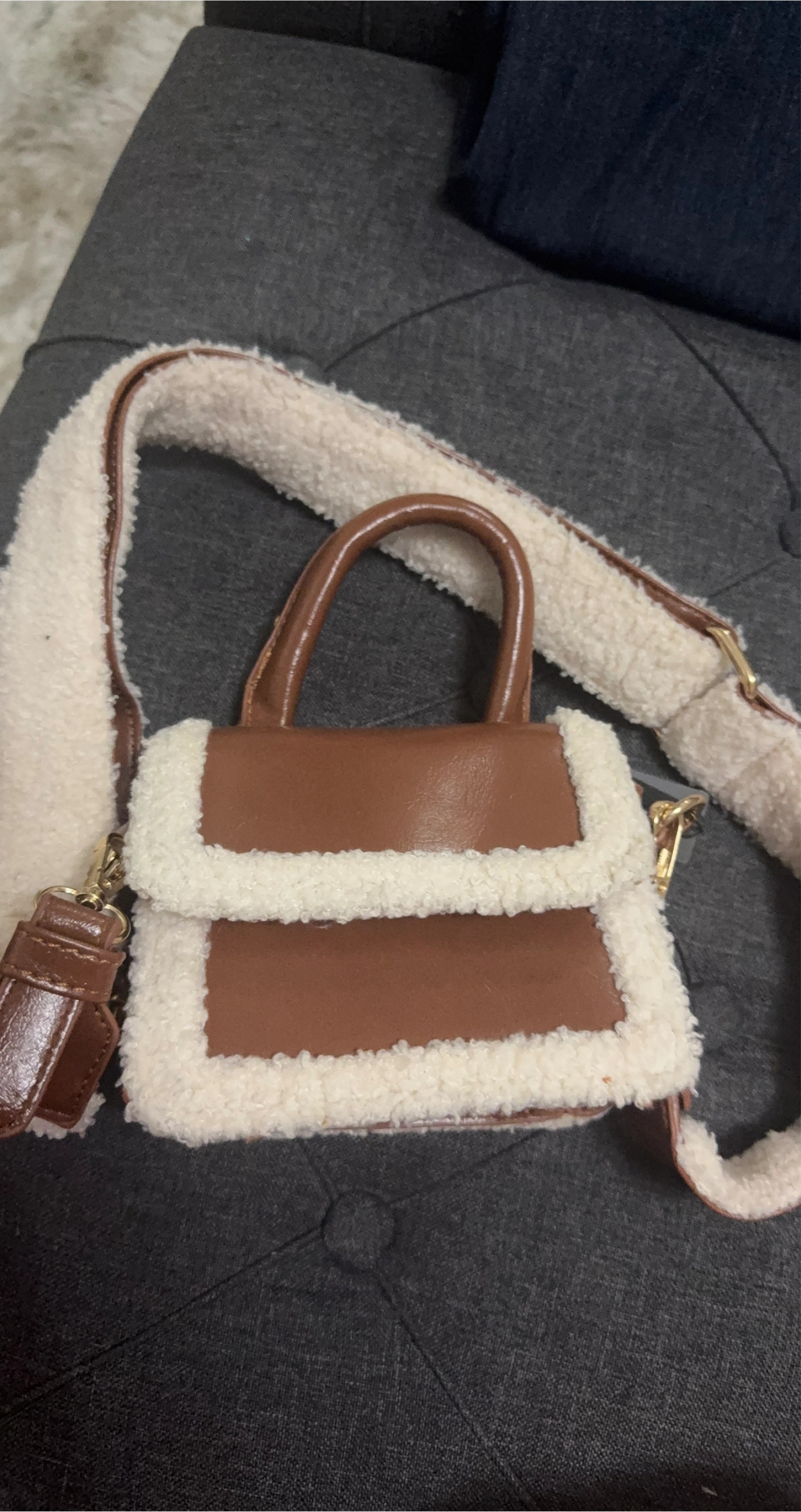 Cute crossbody bag with brown faux leather and cream sherpa trim! It has a short handle and a longer, adjustable strap