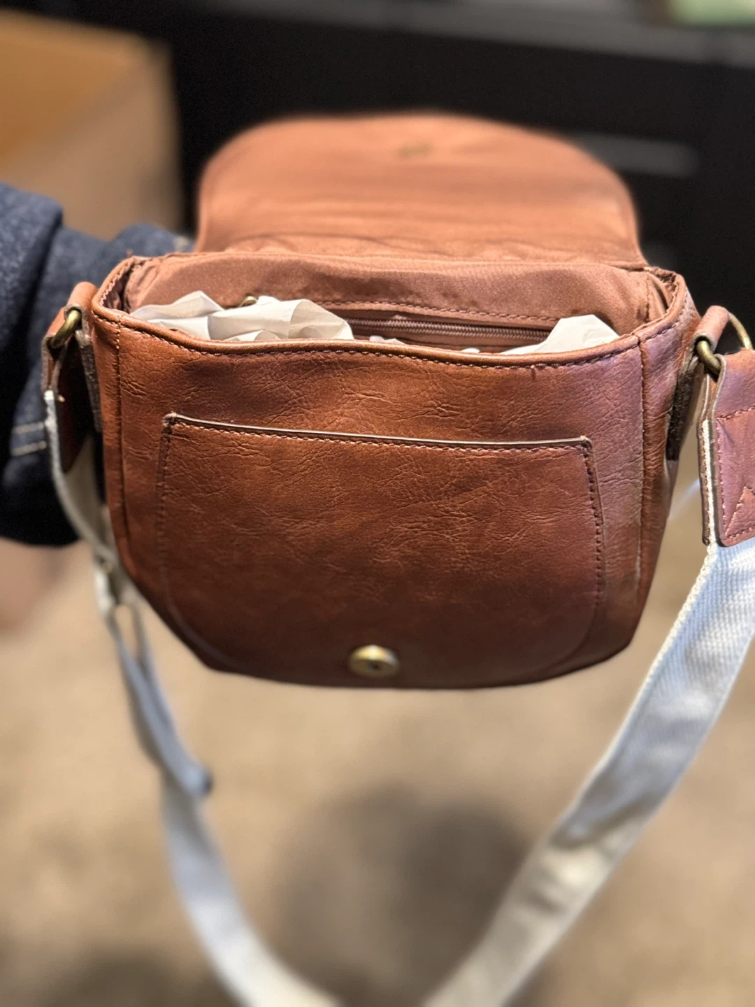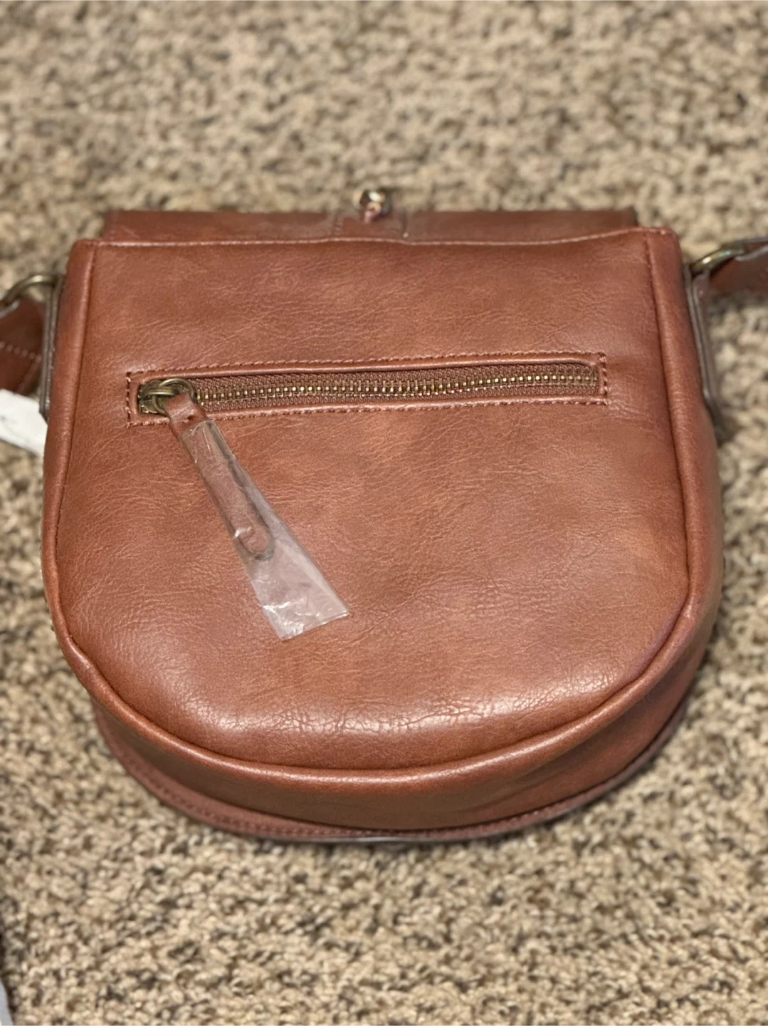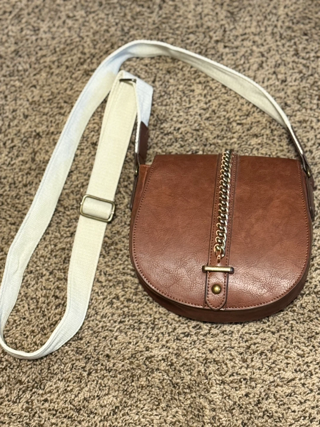 77This is a cute brown crossbody bag! It features a gold chain detail on the front and a white canvas strap. It has a zipper pocket on the back and an interior pocket as well. Perfect for everyday use! From pet friendly home