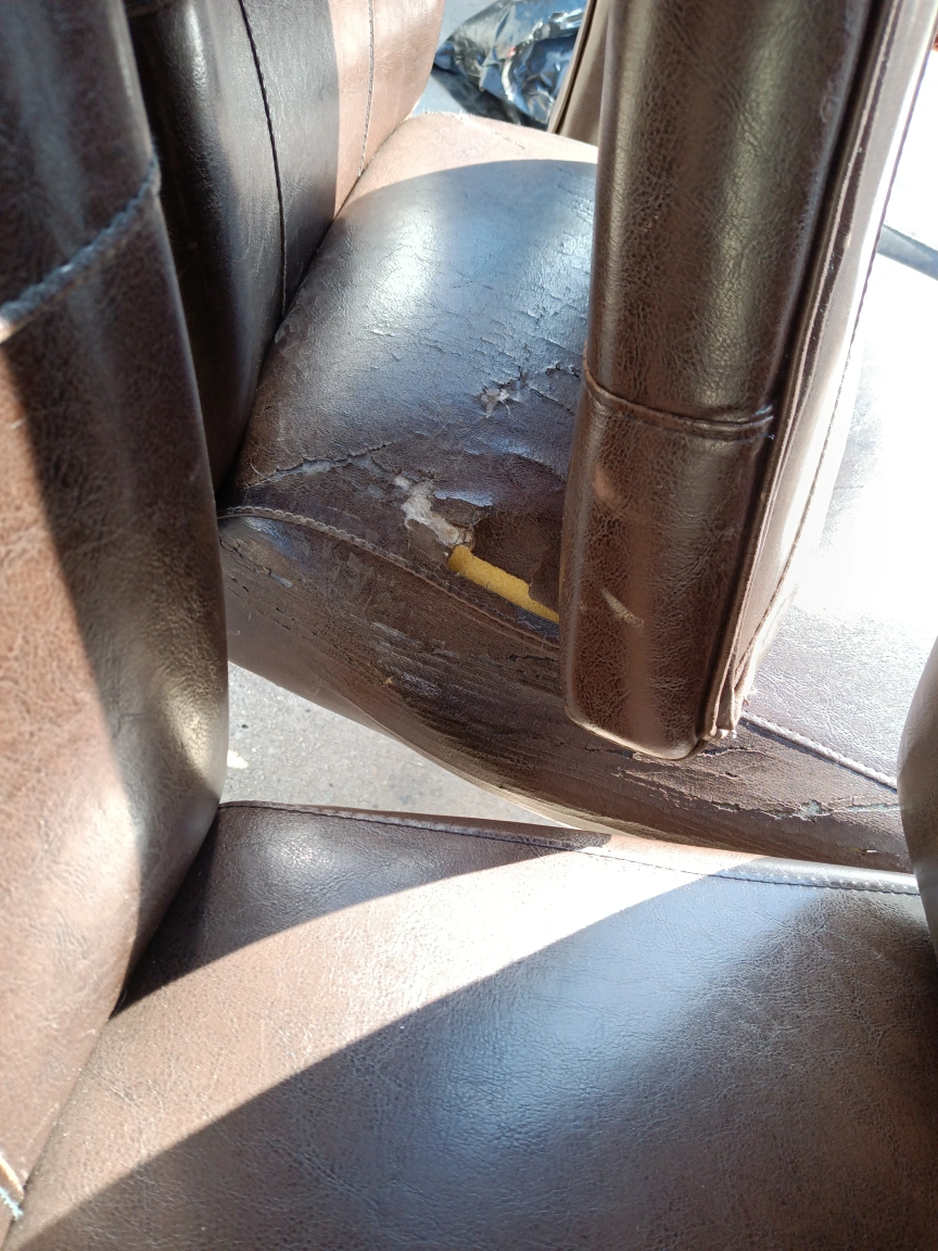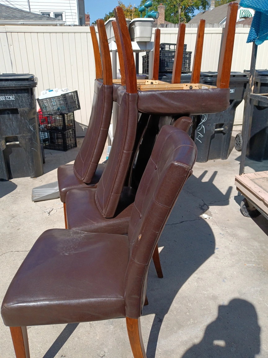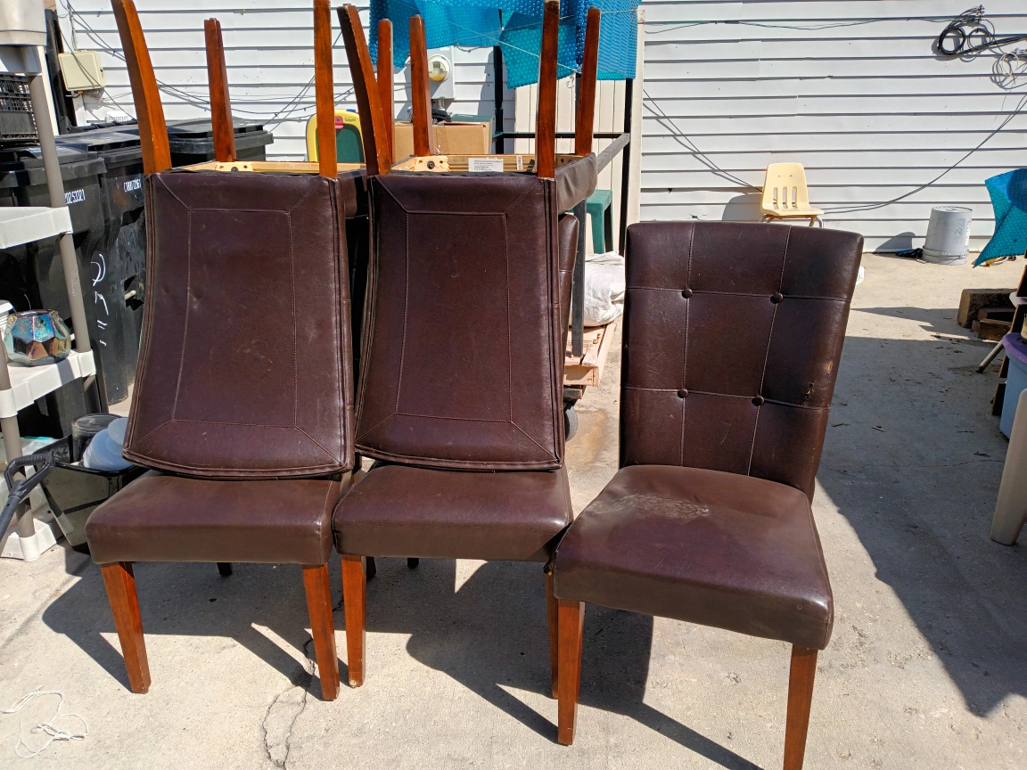 Selling a set of four brown dining chairs. They have some wear and tear, as shown in the pictures, but they're still sturdy and functional. Perfect for a starter home or anyone looking for affordable seating! of 5