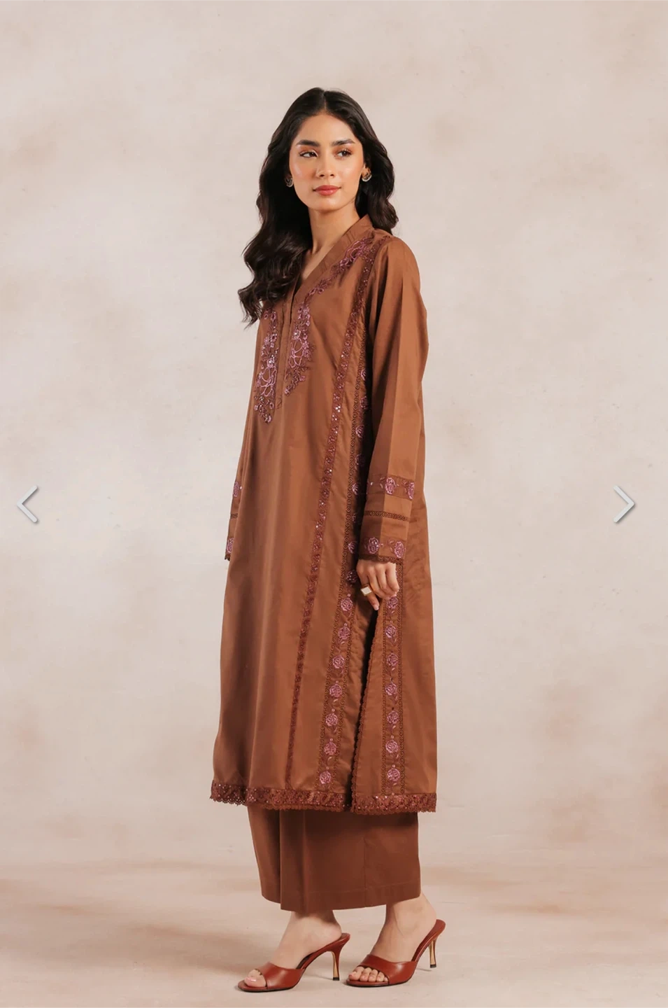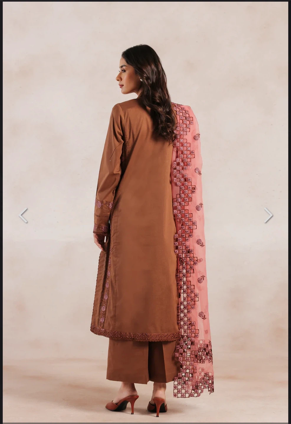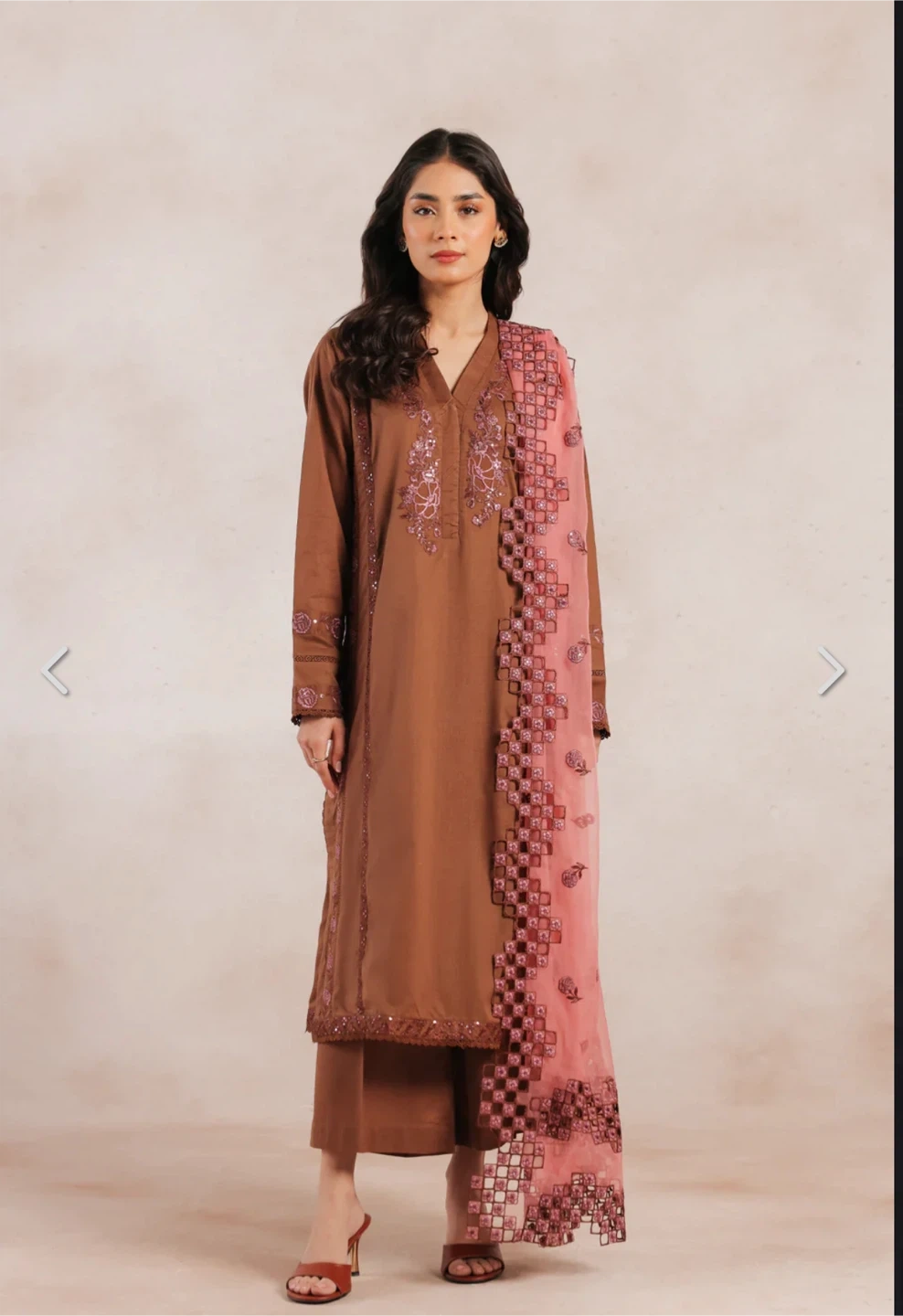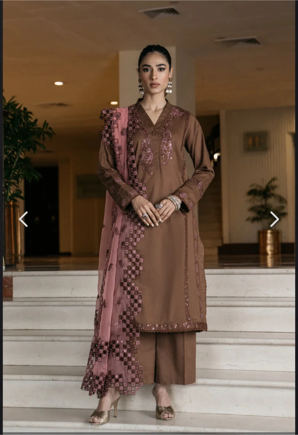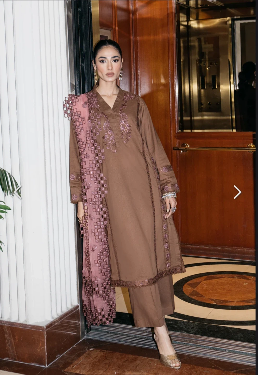 Beautiful brown shalwar kameez with intricate embroidery and a lovely pink dupatta. Perfect for a special occasion or festive wear Fabric Lawn, cotton Dupatta organza Brand Ethnic