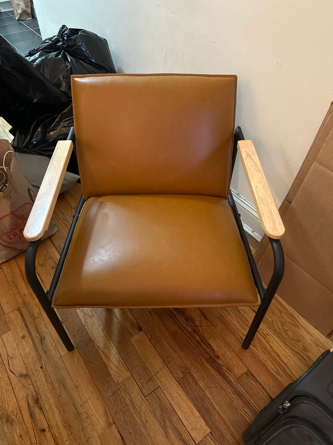 A very comfortable armchair. The chair has a brown faux leather seat and back. Features wooden armrests. Its black metal frame adds a touch of elegance and durability. This armchair will create the perfect reading corner to relax in.