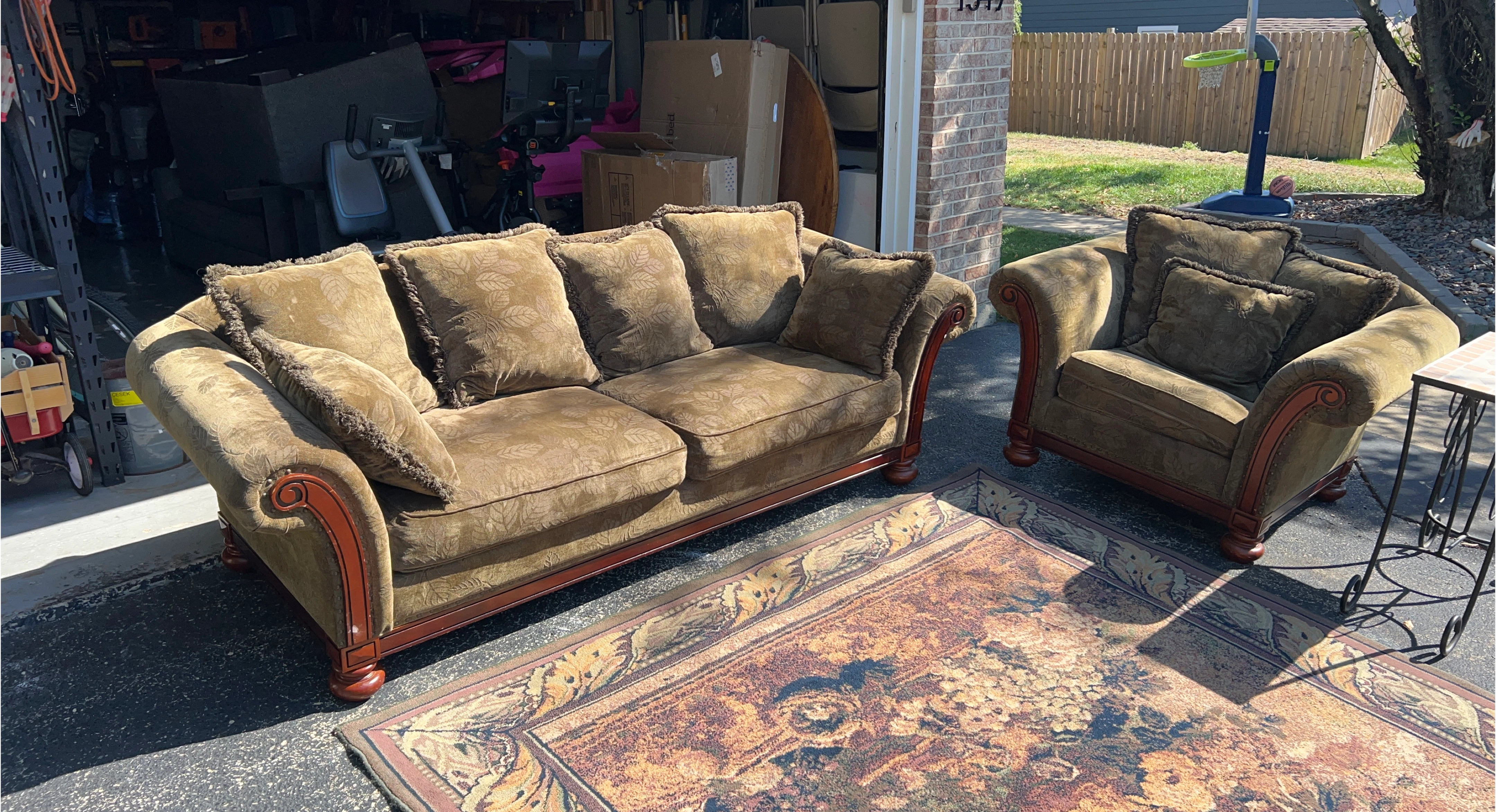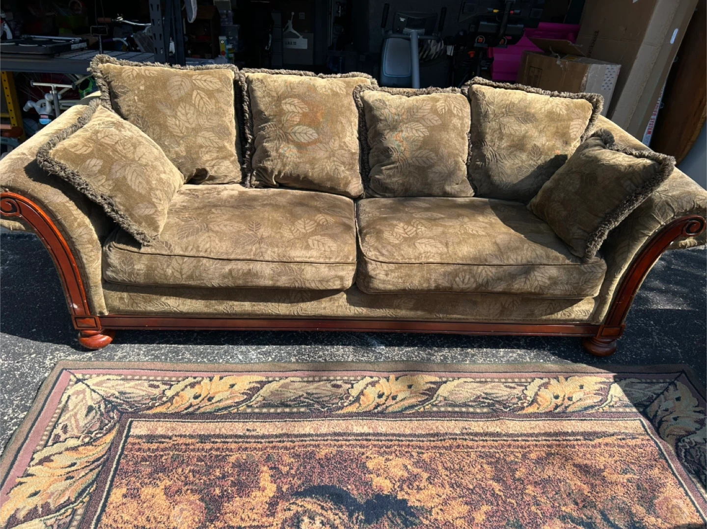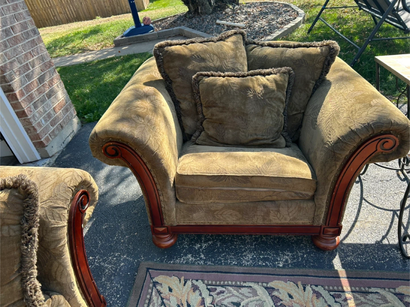 Selling a comfortable brown floral sofa and armchair set. Perfect for a living room or den. The set has a classic design with decorative wood trim and plush cushions. It's in good condition and ready for a new home!