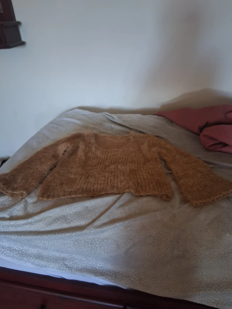 70Selling a cozy brown knit sweater! It has a v-neck and long, wide sleeves. Perfect for layering or wearing on its own for a relaxed look