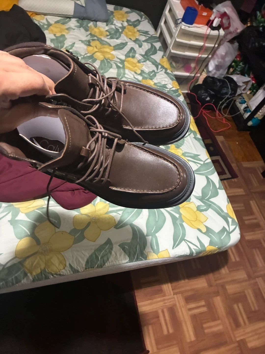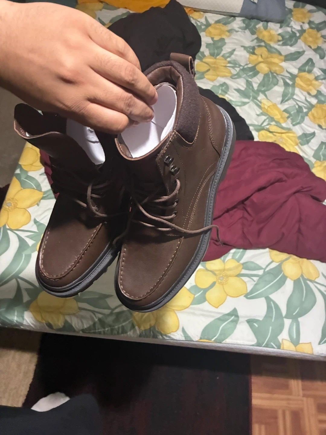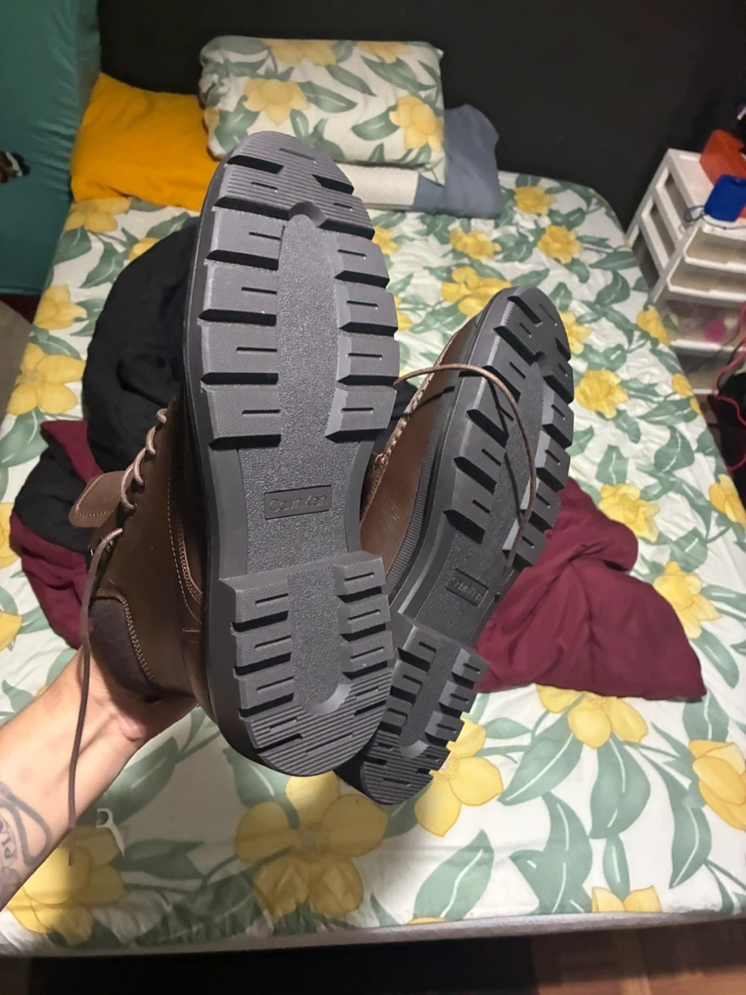 10Selling a pair of brown leather ankle boots. They appear to be in good condition and have a rugged sole for traction. Perfect for everyday wear!