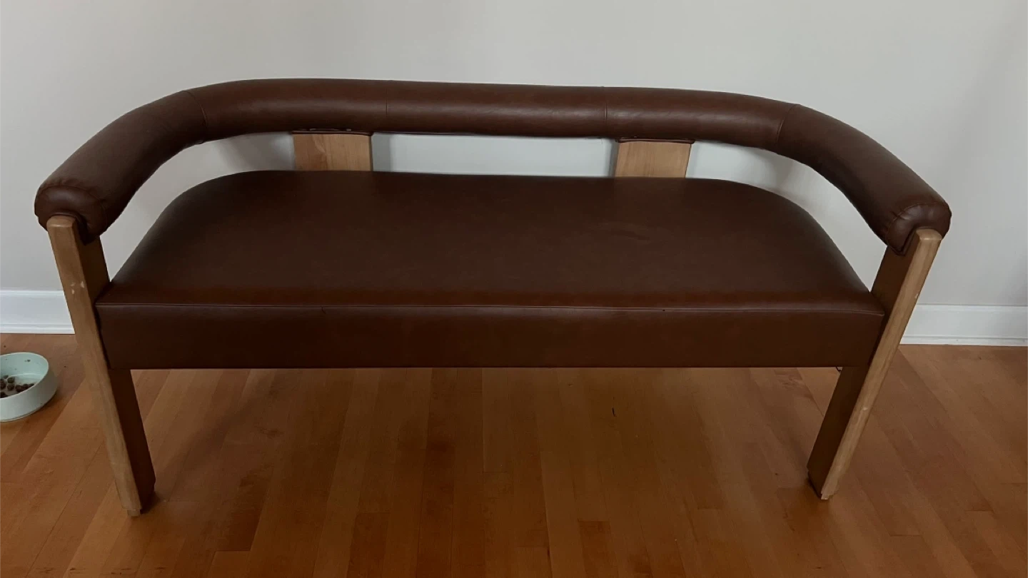 65Selling a stylish brown leather bench with a light wooden frame. It's in good condition and would be a great addition to any room! The bench features a comfortable padded seat and backrest, perfect for relaxing or as an accent piece