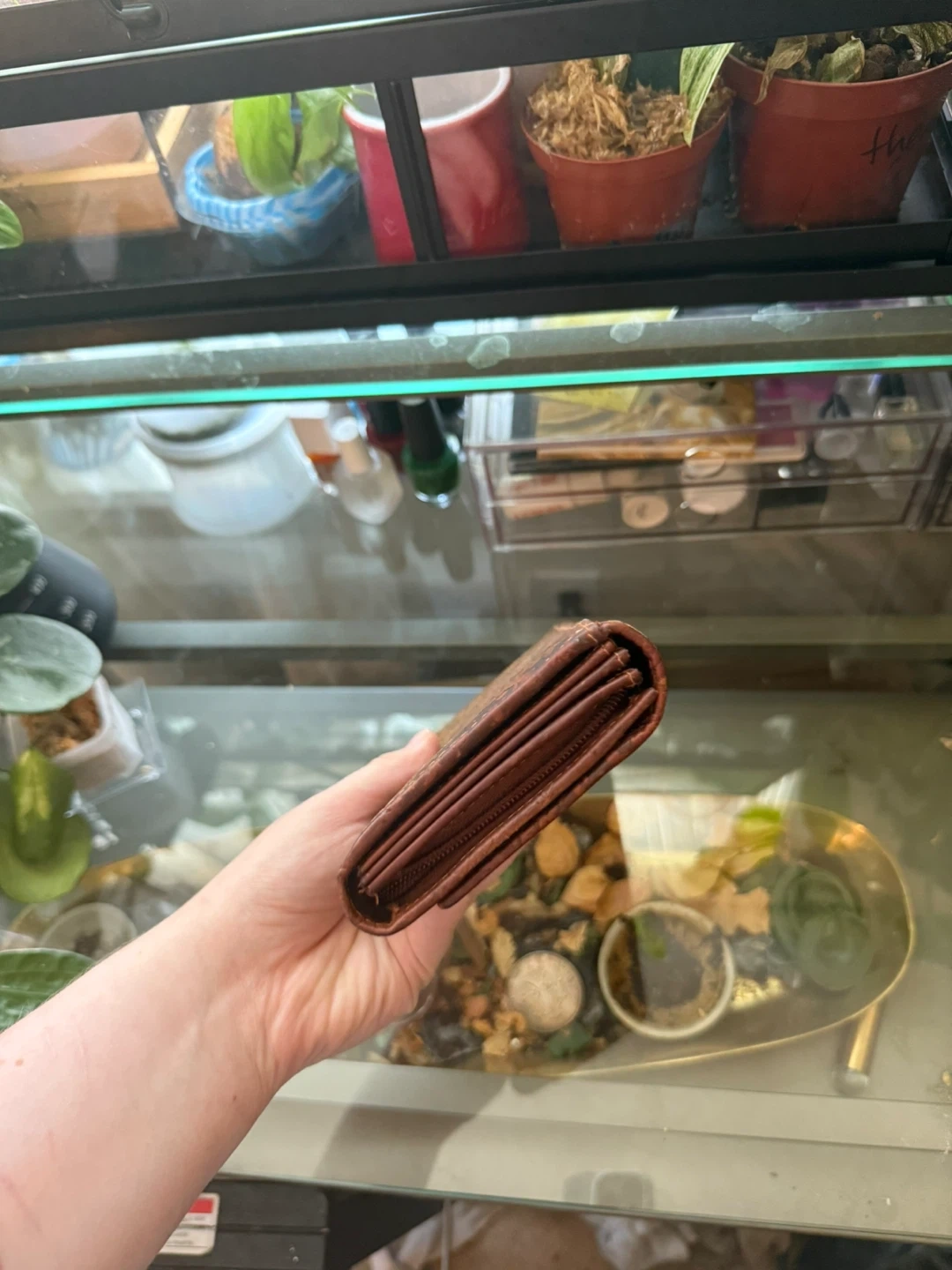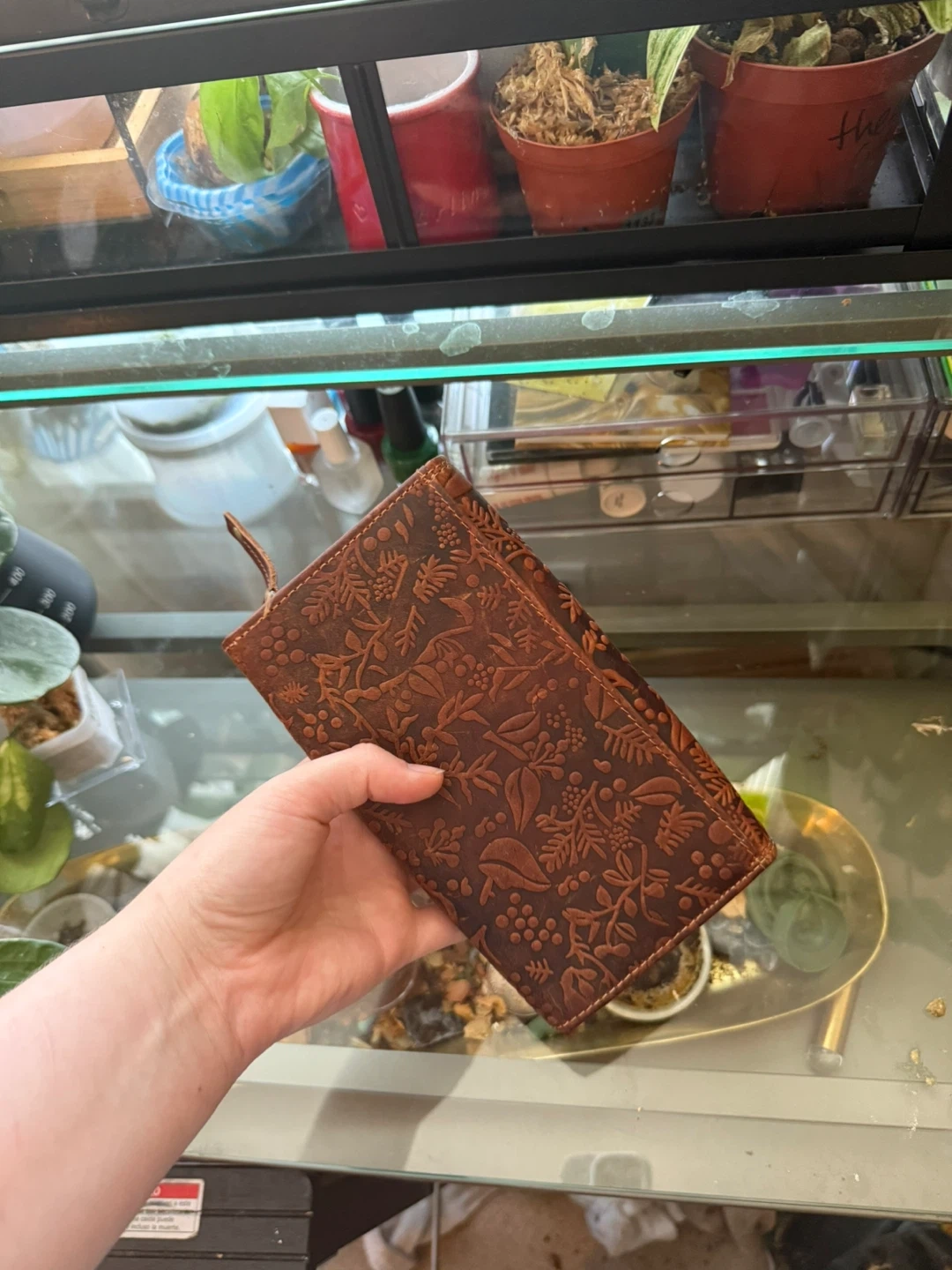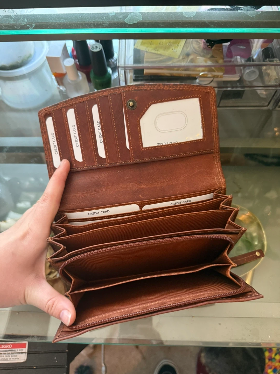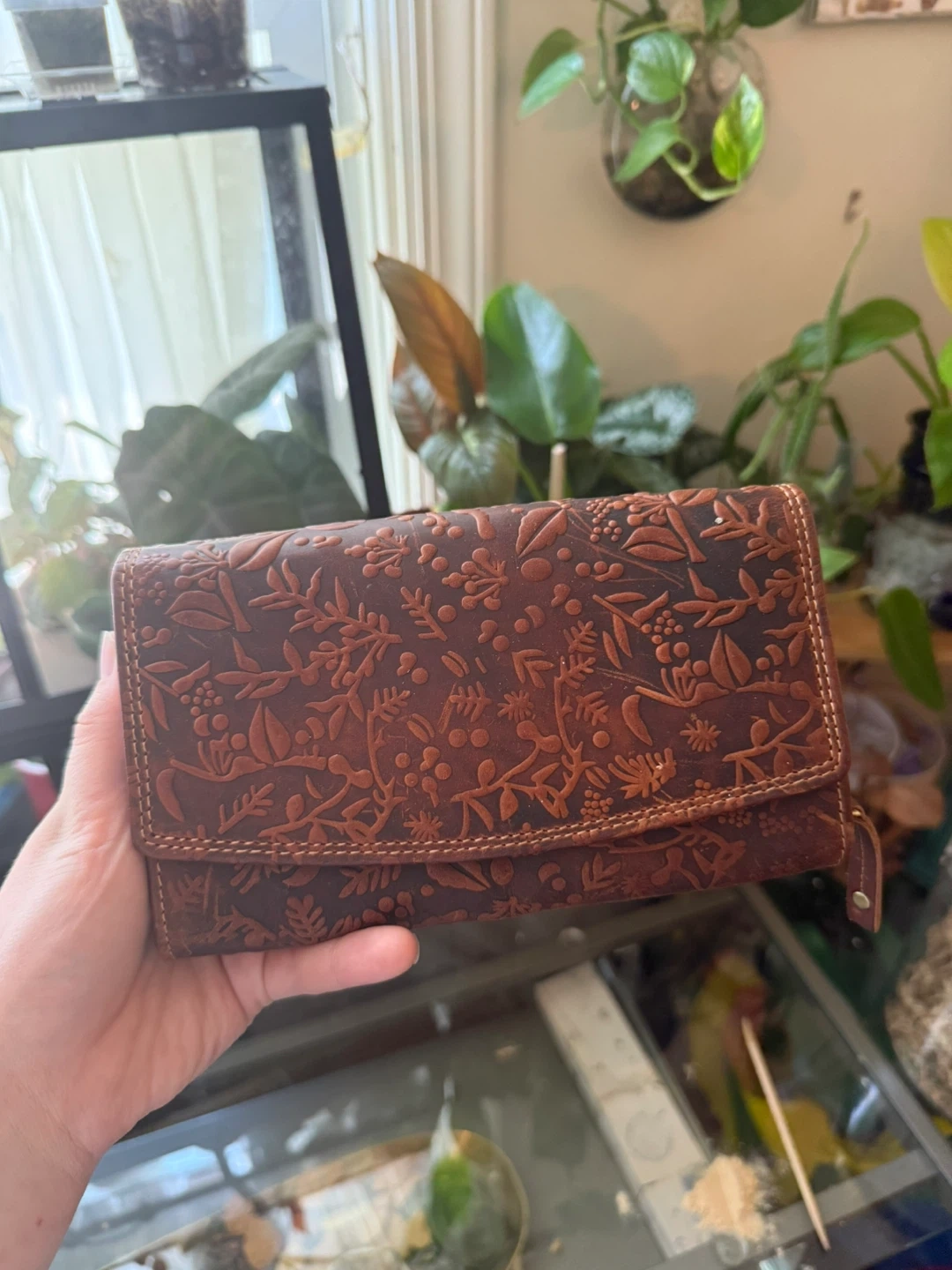 Selling a never used brown leather wallet with a beautiful floral embossed design. It has plenty of slots for cards and cash, plus a zippered compartment for change. Perfect for keeping your essentials organized!