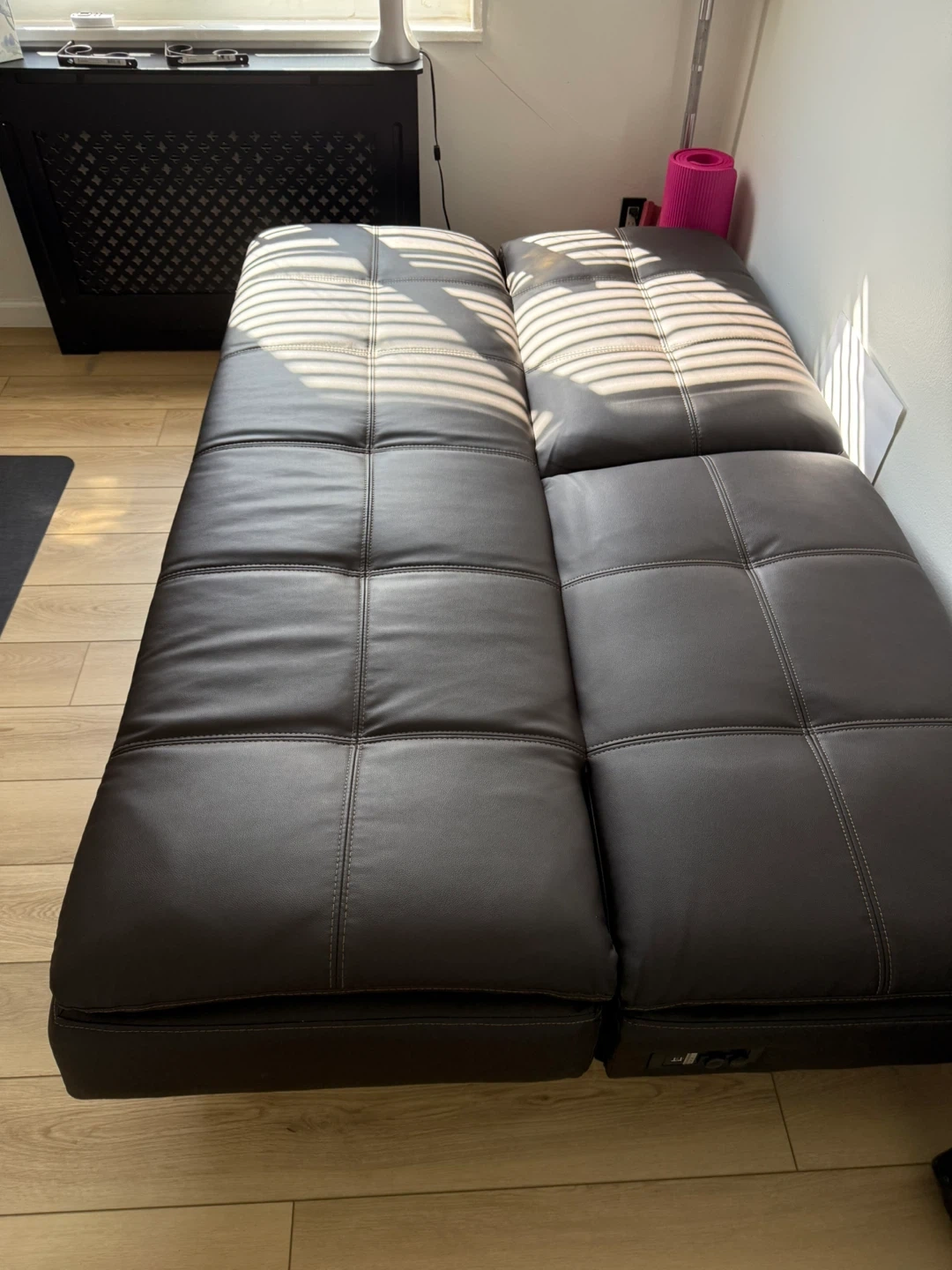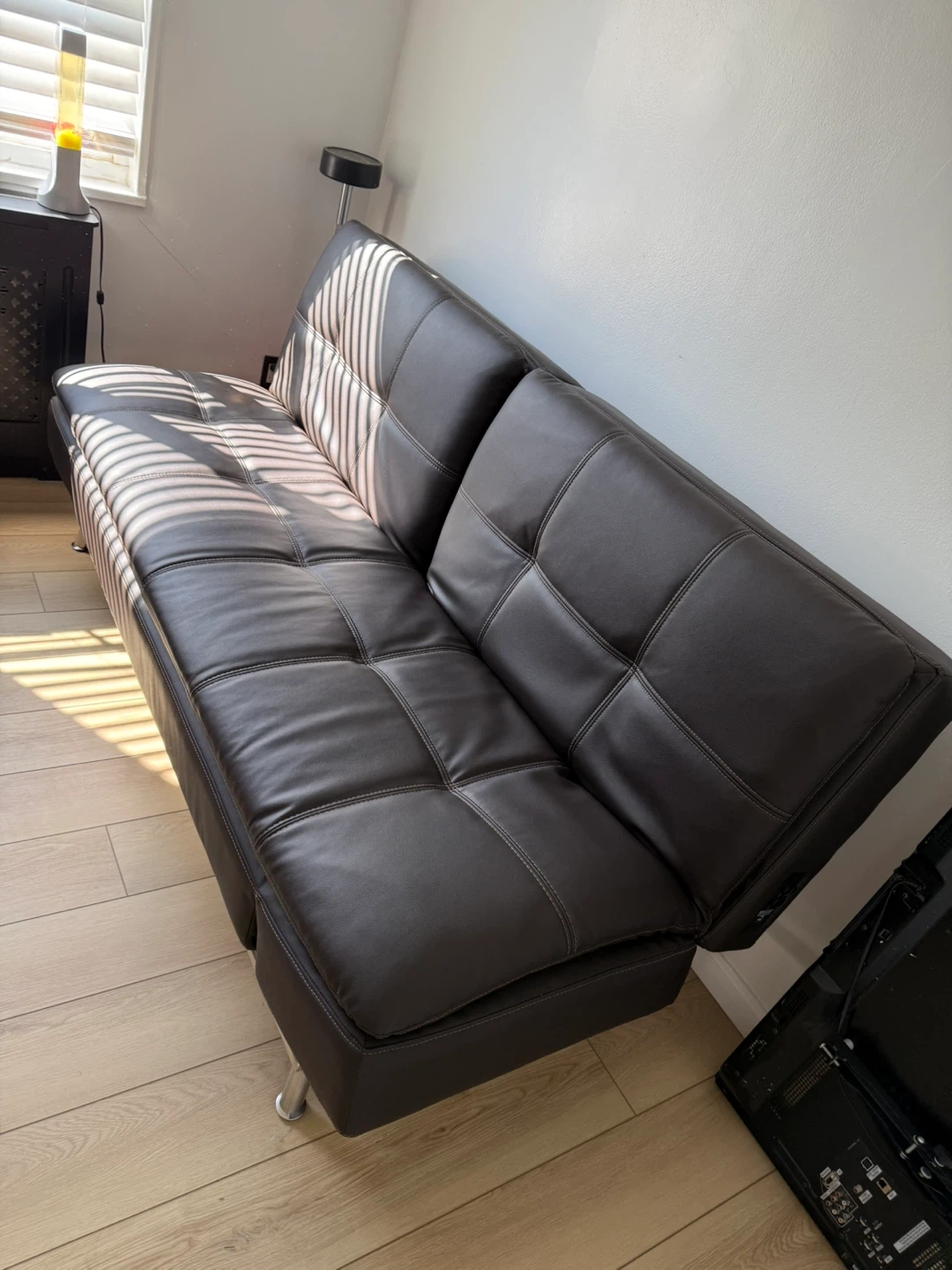 Selling a brown leather futon sofa bed. It's in good condition and perfect for a living room or spare room. The futon easily converts into a bed, making it great for guests or small spaces