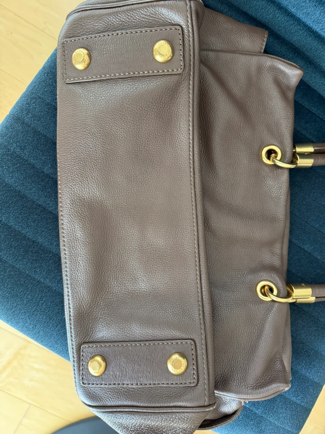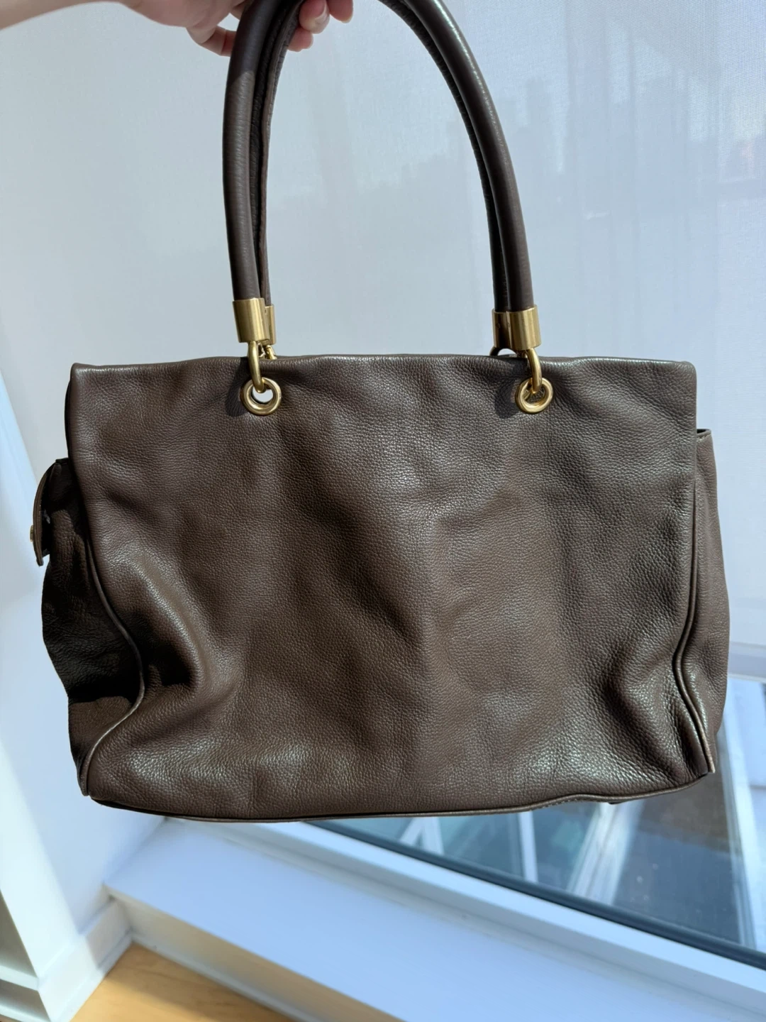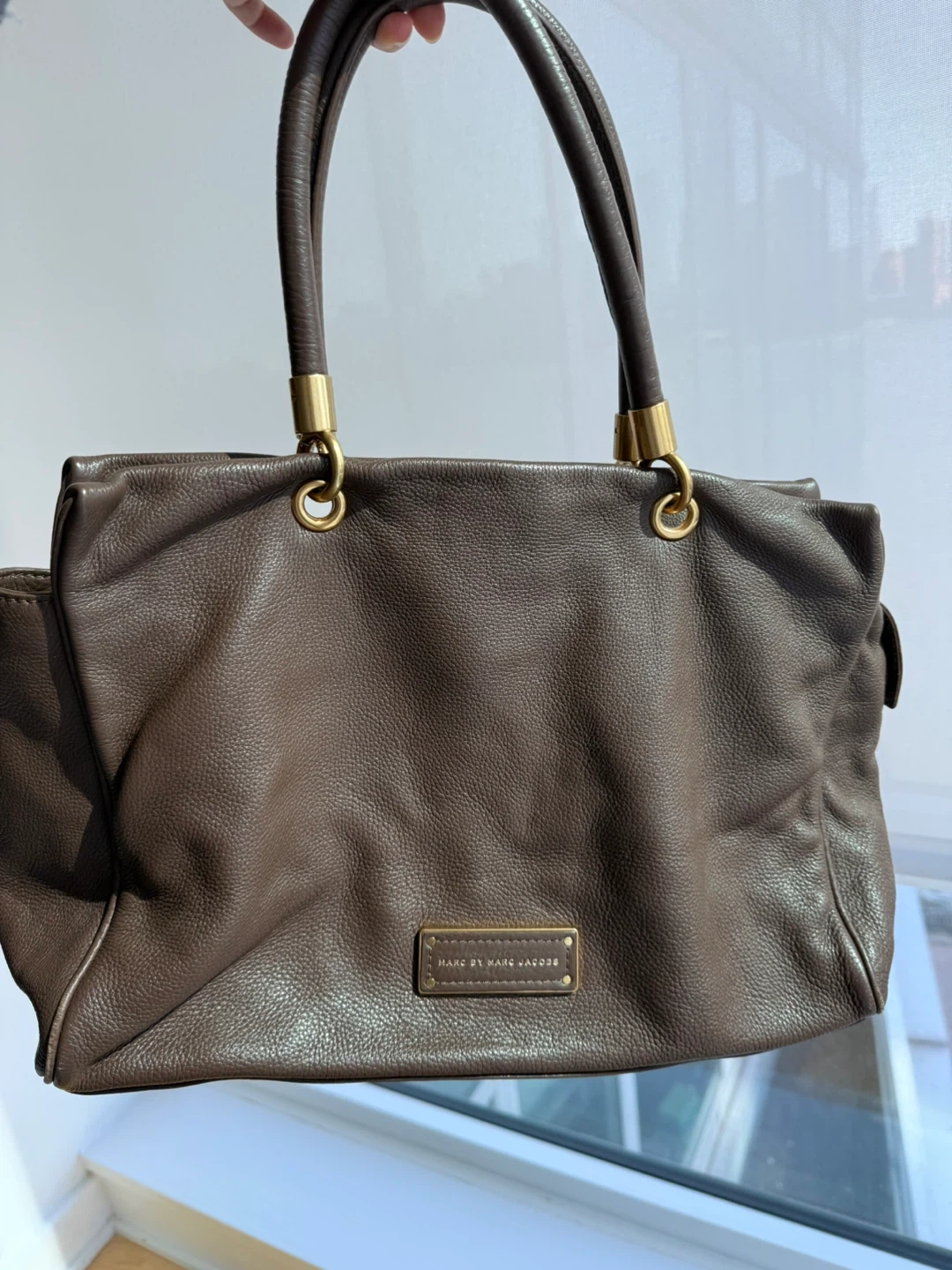 Brown leather marc by marc jacobs tote in good condition. Clean without any stains but some normal wear, including minor scuff marks on bottom corner. Gold plated feet on bottom. Dimensions are 15 x 9 x 6 inches.