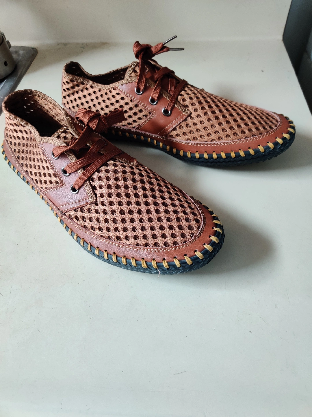 Selling a pair of casual shoes with a unique mesh design and leather-like material. They are a stylish and comfortable option for everyday wear. The color is a nice shade of brown, and they have a lace-up closure. The shoes have a contrasting stitch detail along the edges.
