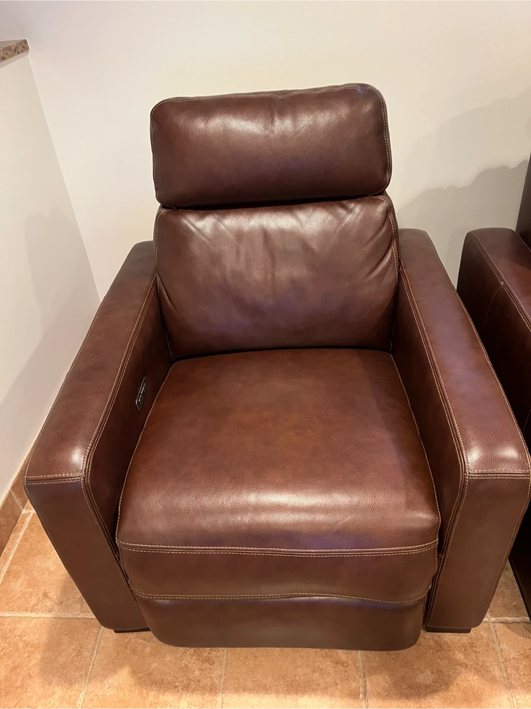 25Selling a comfortable brown leather power recliner chair. It's in good condition and ready for a new home. The chair reclines with ease, making it perfect for relaxing after a long day