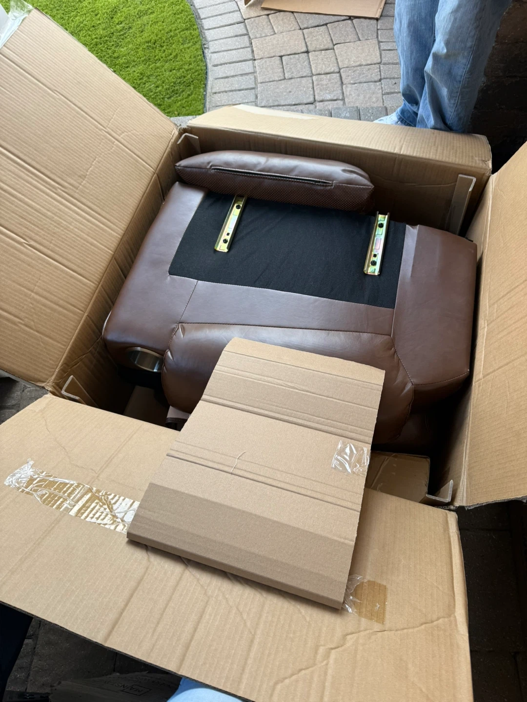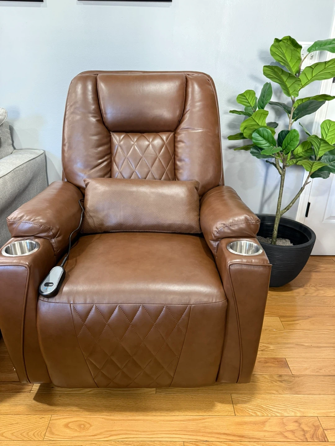 Comfortable brown leather power recliner chair in great condition! It features a padded headrest and armrests for extra comfort, as well as convenient cup holders on both sides. Perfect for relaxing and watching movies!