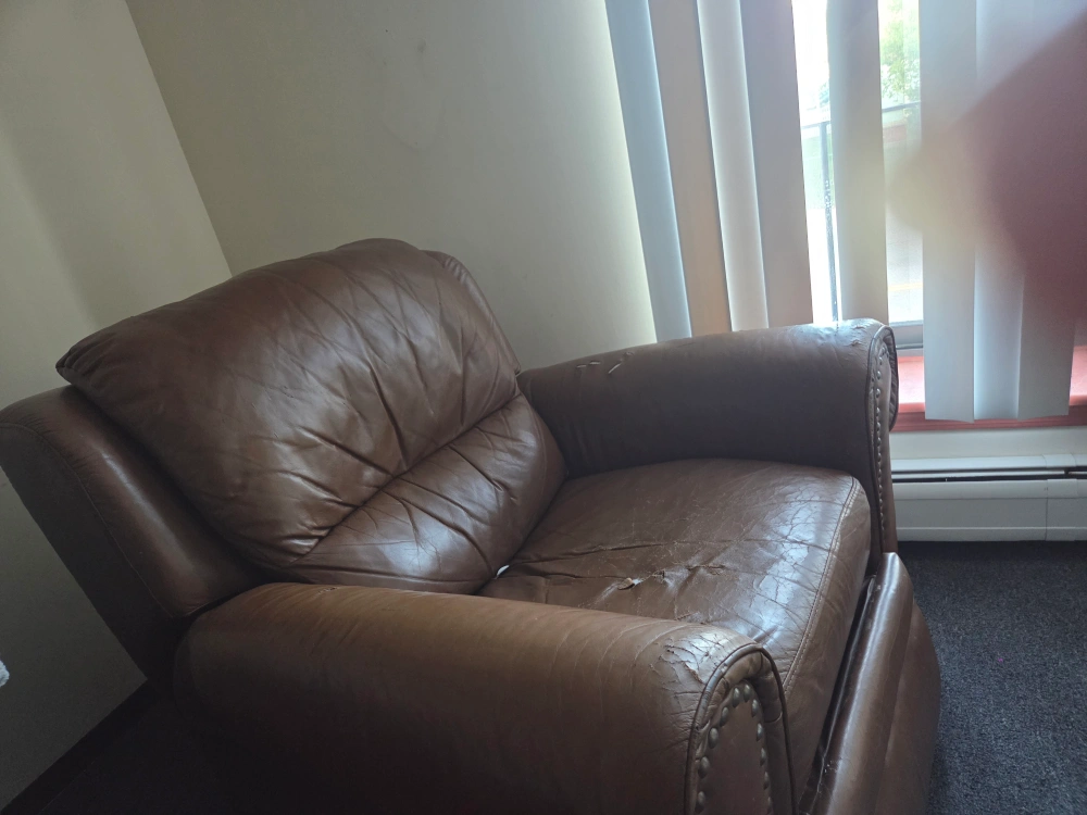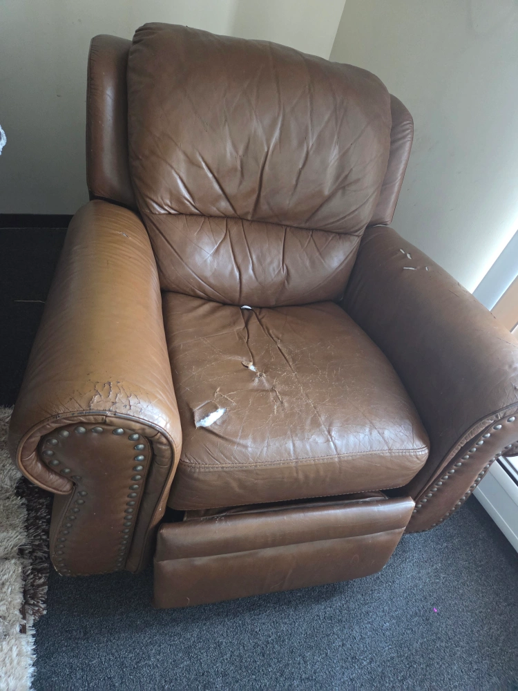 32Selling a brown leather recliner. It has some wear and tear, as you can see in the photos, but it's still comfortable