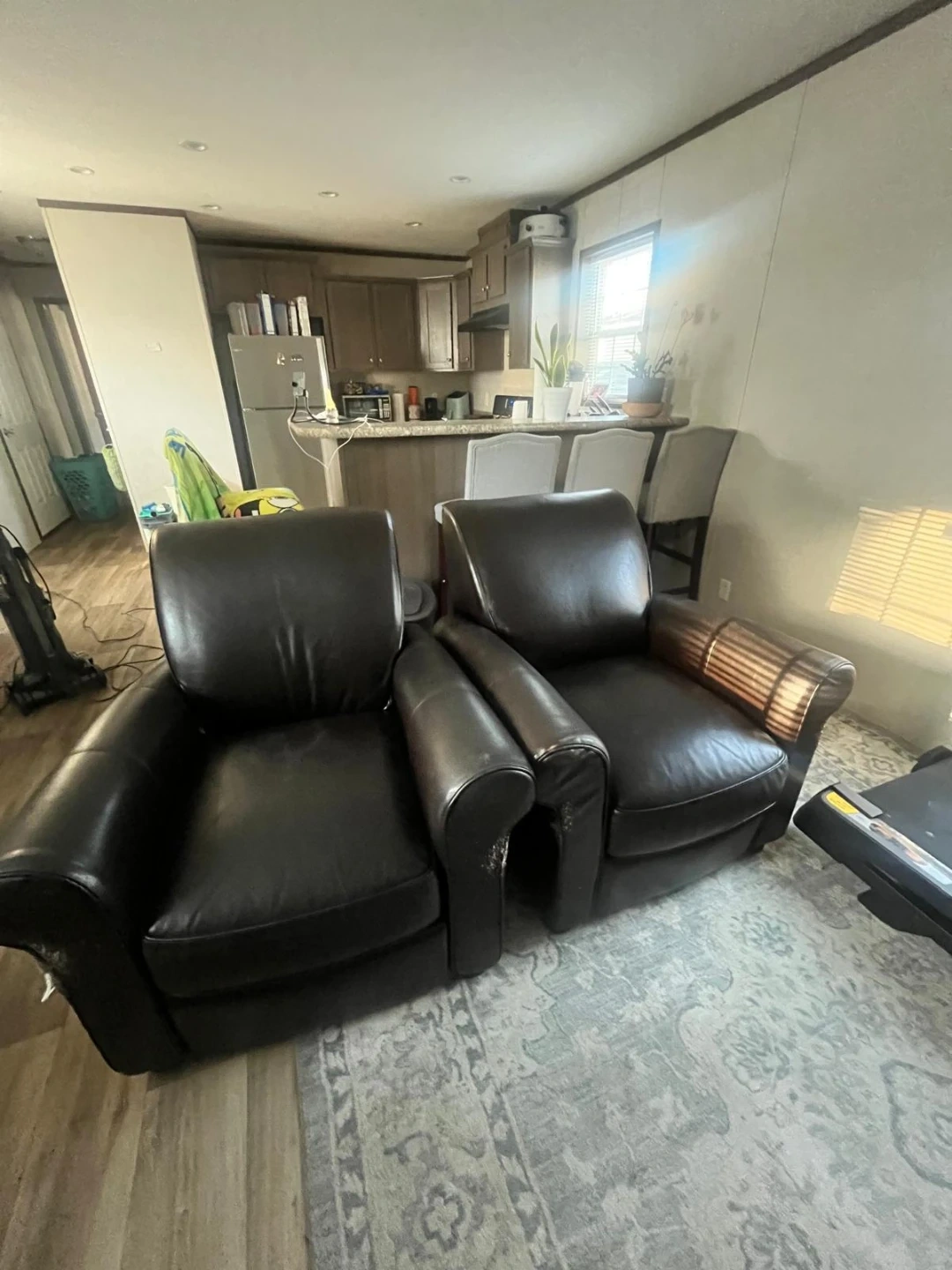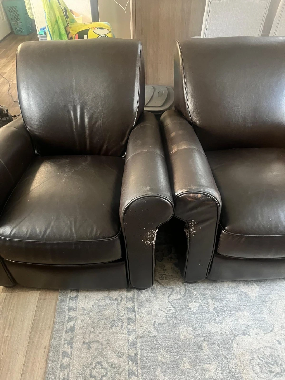10Selling a set of two brown leather recliner chairs. They show some signs of wear, as seen in the photos, but are still comfortable and functional. Perfect for a cozy living room setup!