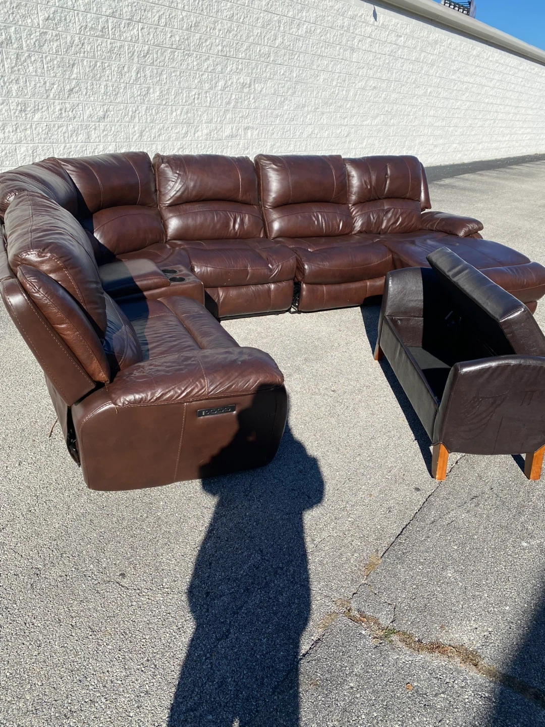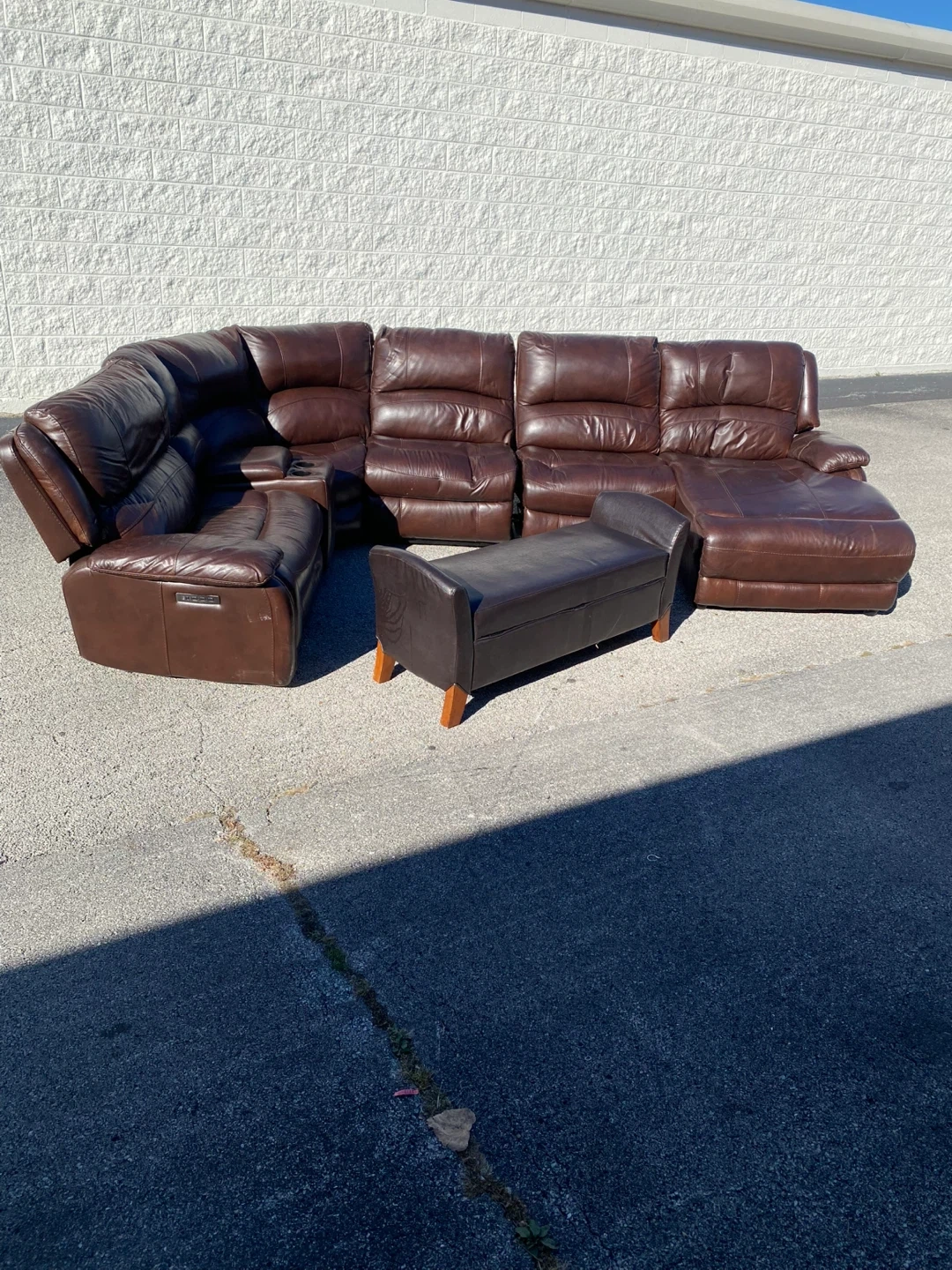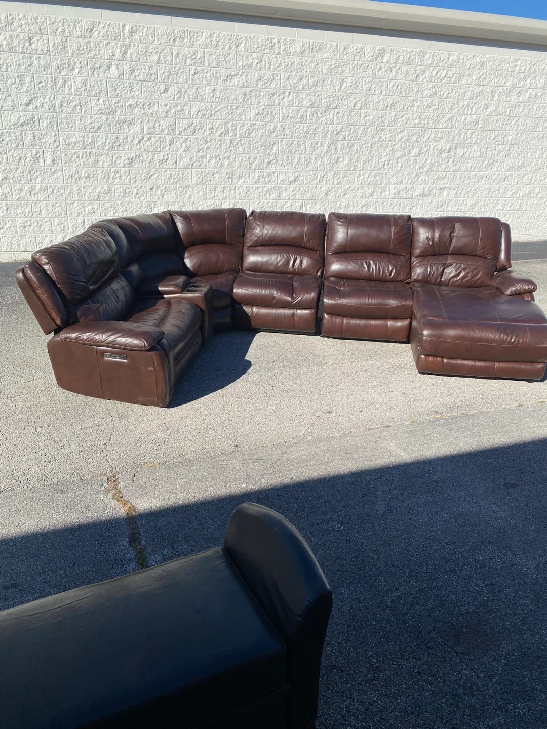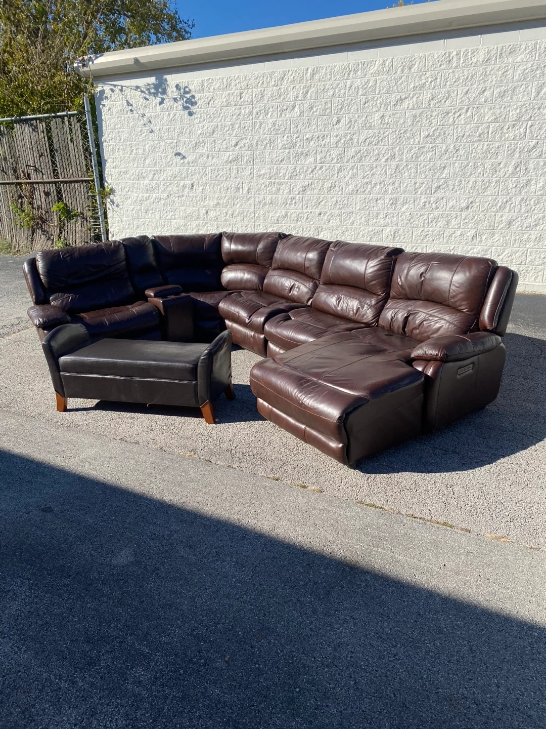 65Selling a comfortable brown leather sectional sofa, perfect for a living room or entertainment area. It comes with a matching ottoman for extra seating or relaxation. The sectional is in good condition and offers plenty of space for family and friends to gather. It has a rich, dark brown color that complements various decor styles. If you're looking for a stylish and functional seating solution, this could be a great fit!