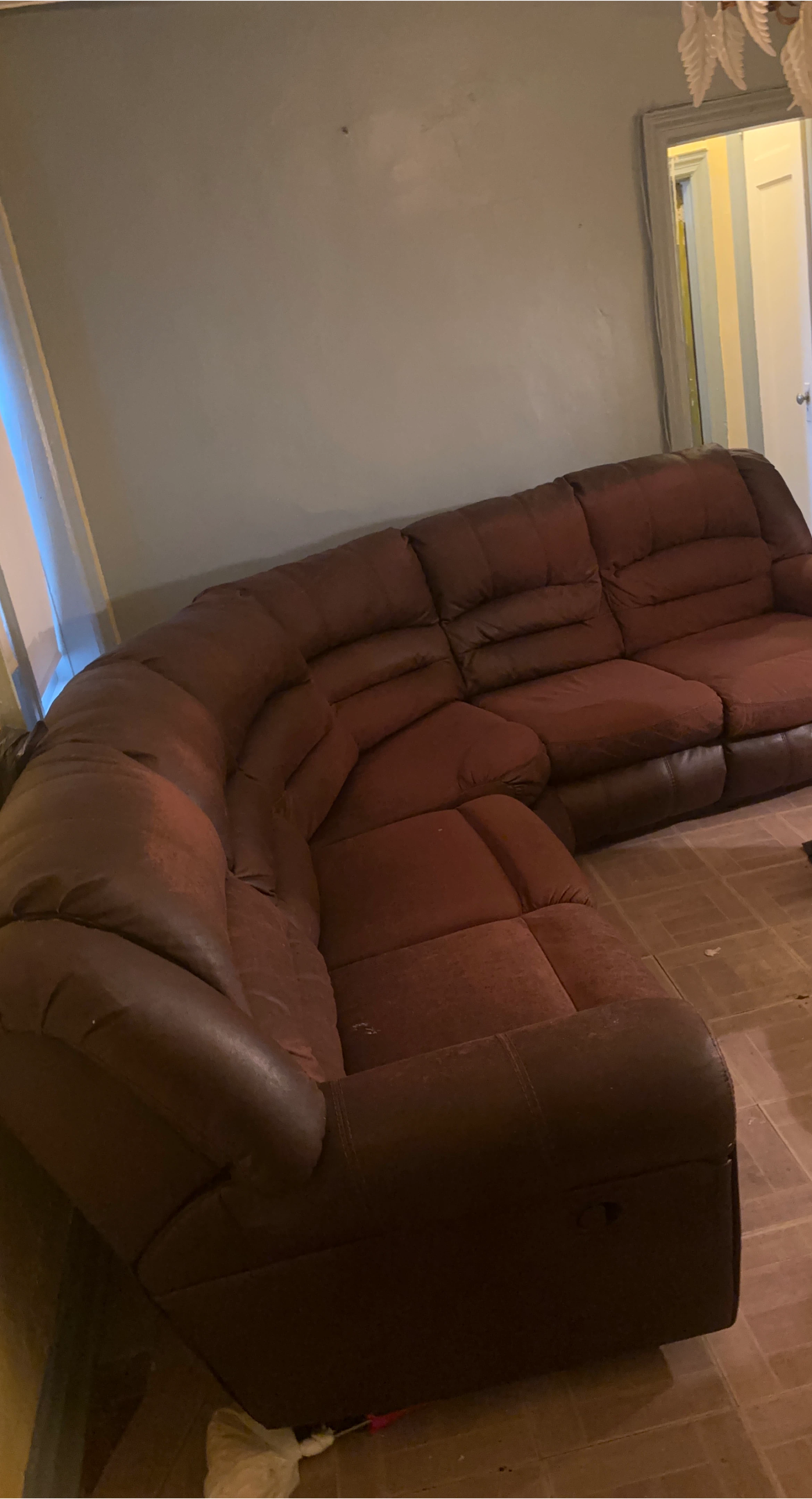 65Selling a brown leather sectional sofa. It's a comfortable and spacious piece of furniture, perfect for a living room or entertainment area. It shows signs of wear and use, but it's still functional and has plenty of life left