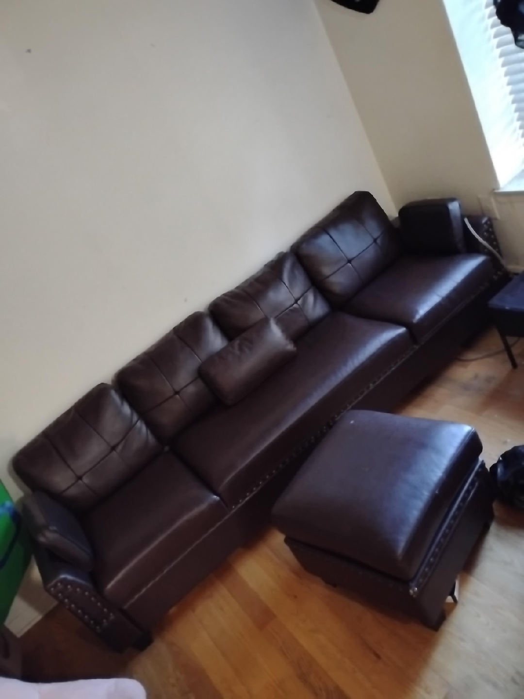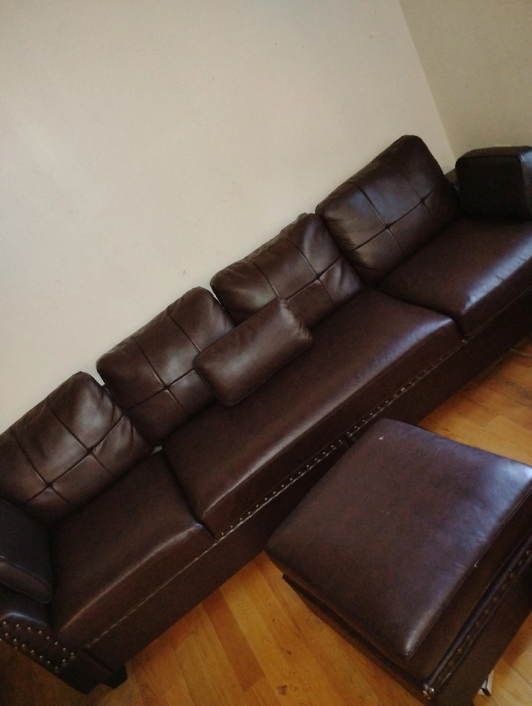 65Selling a comfortable brown leather sofa that comes with a matching ottoman. The sofa is in good condition and has a classic design that would fit well in any living room. The ottoman is perfect for kicking your feet up after a long day. Feel free to reach out if you have any questions!