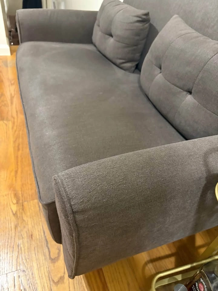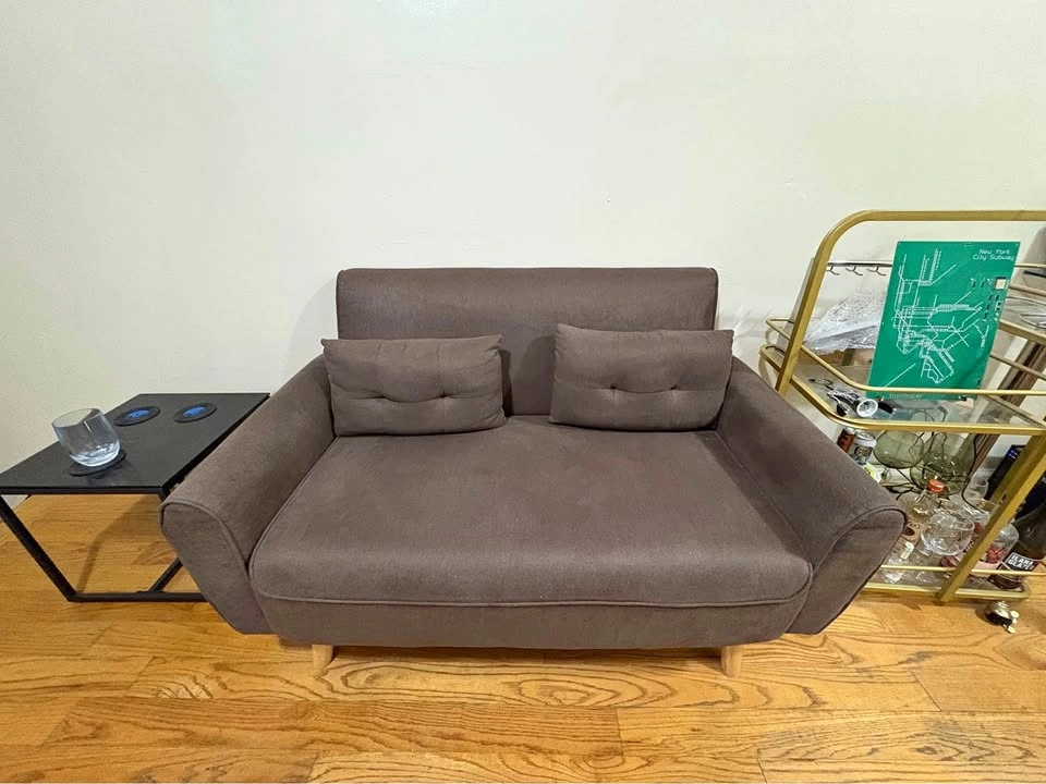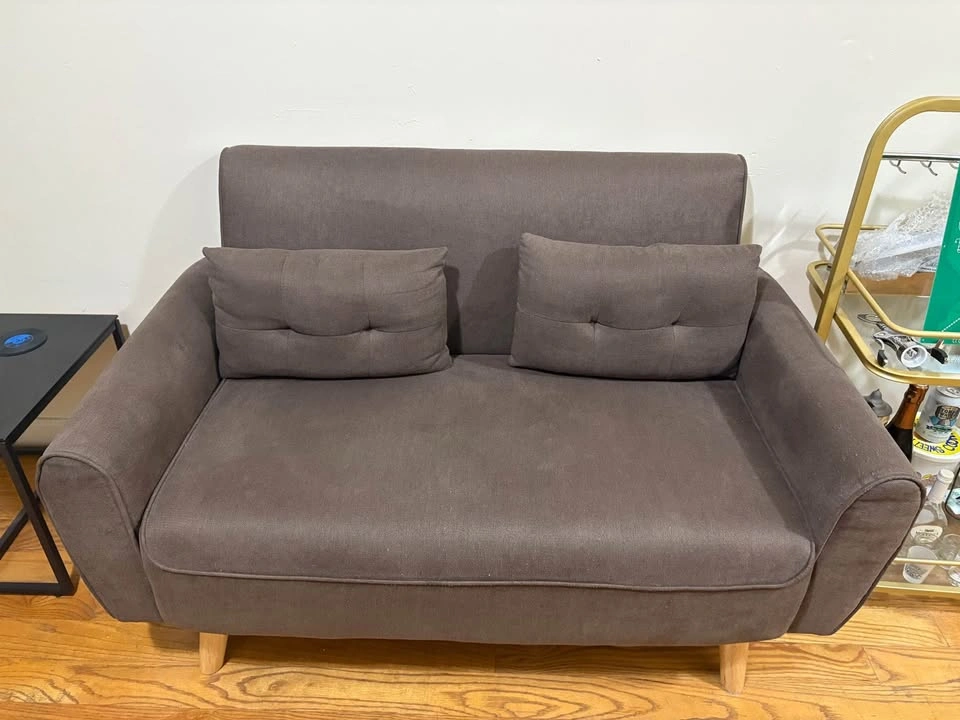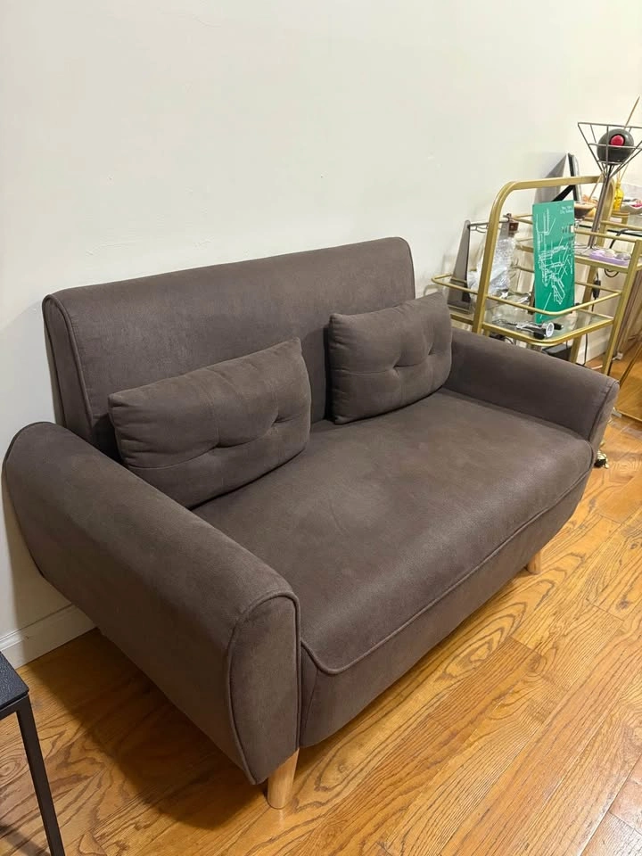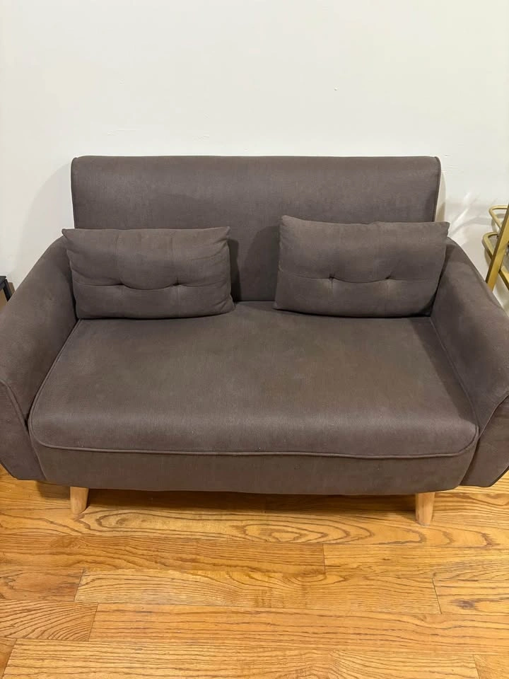 12Brown loveseat with 2 matching pillows perfect for small spaces. Comfy and easy to clean. Light and easy to transport. Minor pilling on arms but can easily be treated. Pickup in the UES (60s)