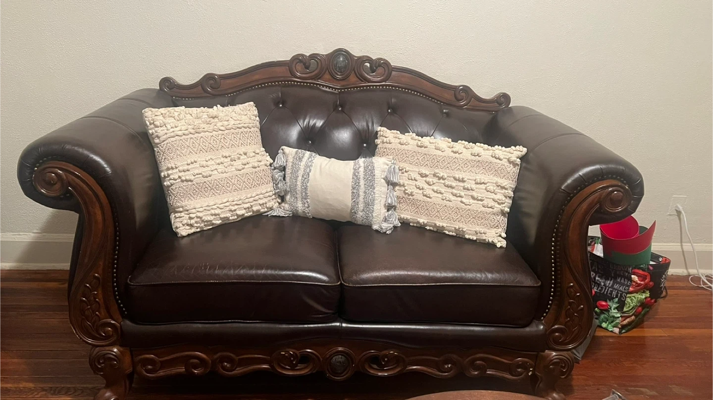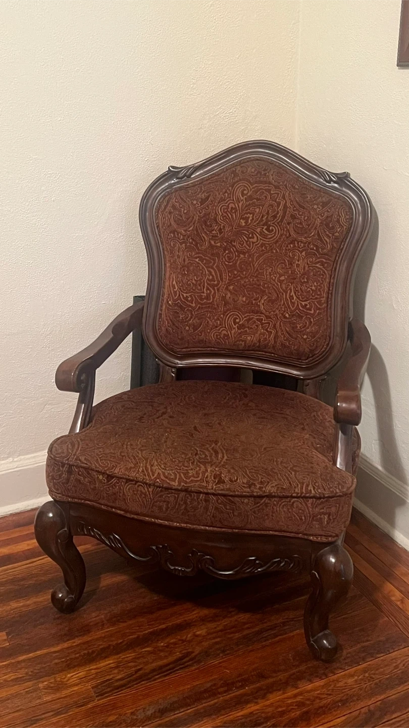 Selling a beautiful ornate sofa and matching chair. The sofa is quite large, measuring approximately 93 cm long, 38 cm wide, and 35 cm high. The chair is a lovely accent piece that complements the sofa perfectly. They're a great addition to any living room!