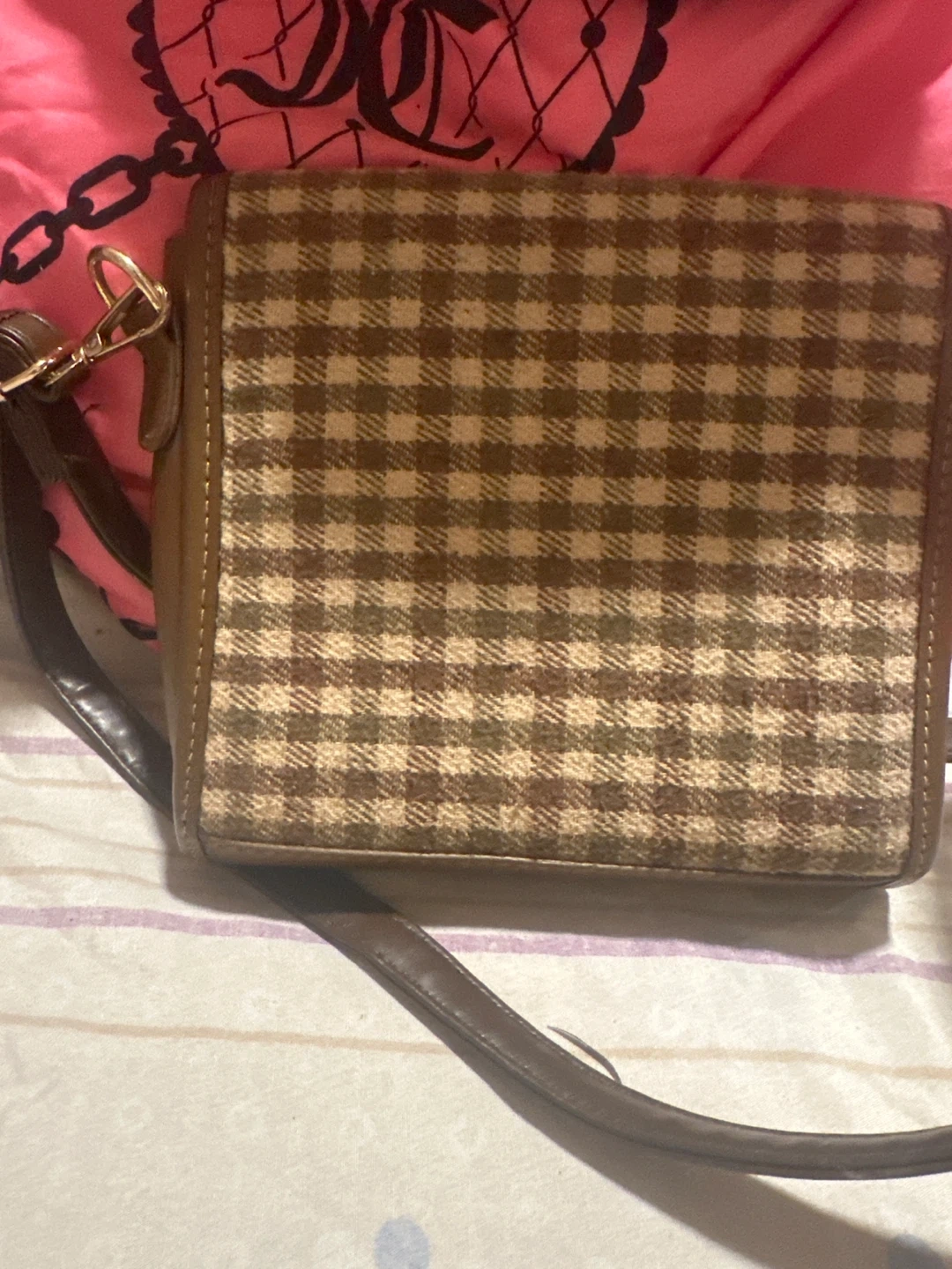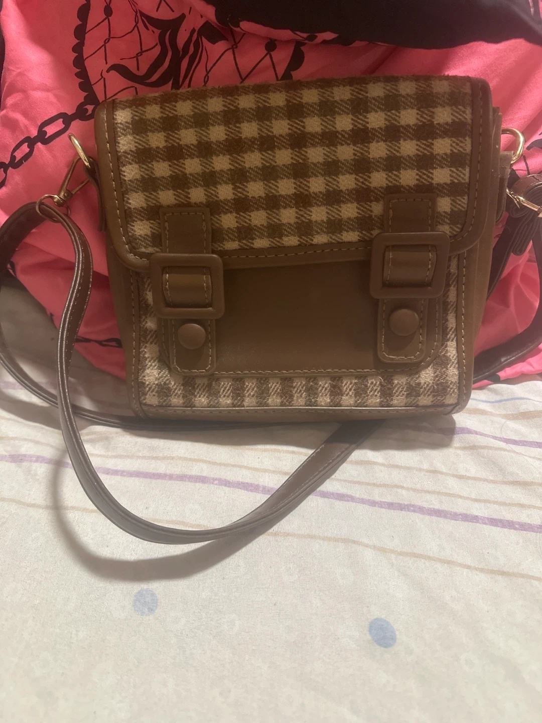 10Here's a cute brown plaid crossbody bag! It's perfect for adding a touch of vintage charm to any outfit. The bag features a classic plaid pattern in shades of brown, and it has a crossbody strap for easy carrying