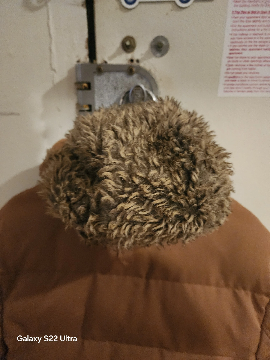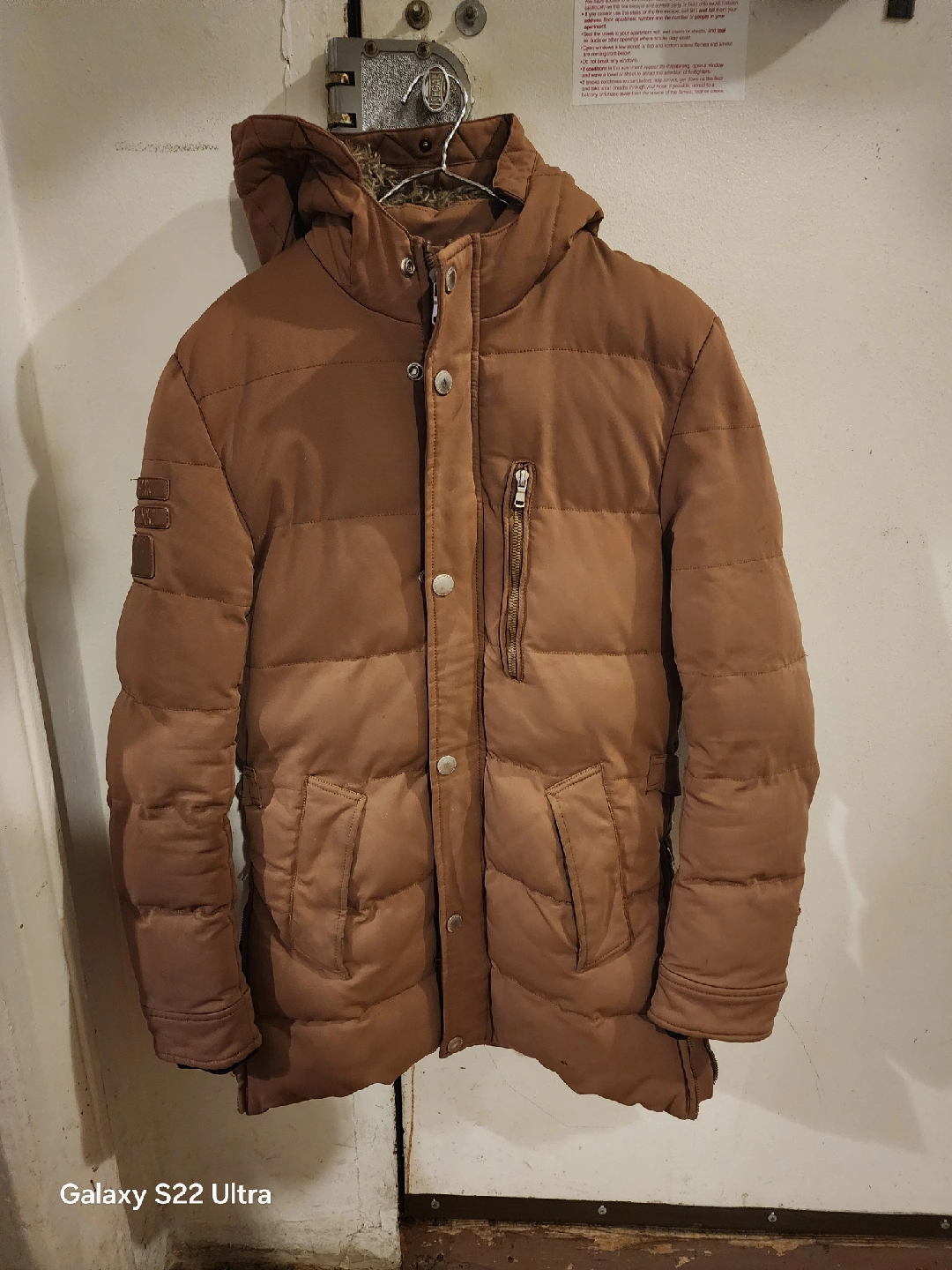 10Selling a brown puffer jacket. It has some wear and tear, including some damage to the sleeve and a small hole near the bottom. Still a warm and functional jacket for colder weather! very thick and heavy duty winter jacket. size is large for boys. 17 inch from shoulder to shoulder. length 75 inch. arms 21 inch long.