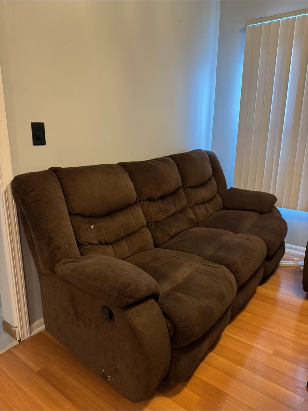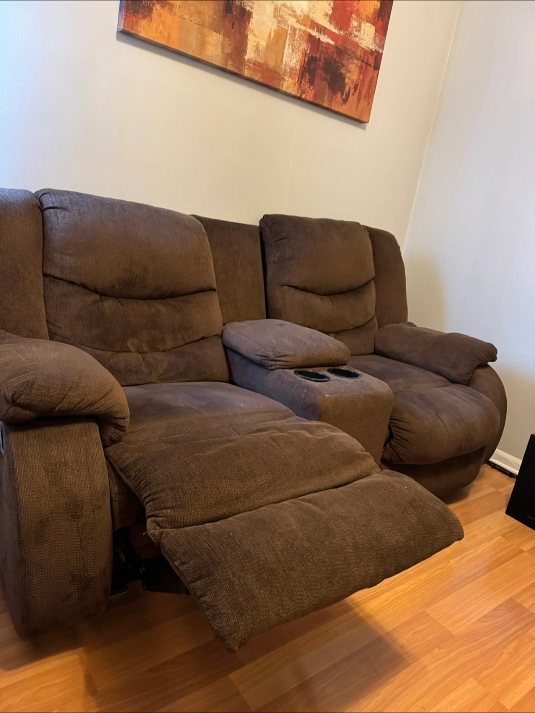 Selling a 2 piece reclining sofa. All the reclining still works and is in good condition. There is a cup holder and storage area. There are a couple small tears that can be fixed. (They are pictured). Open to offers, want it out ASAP!