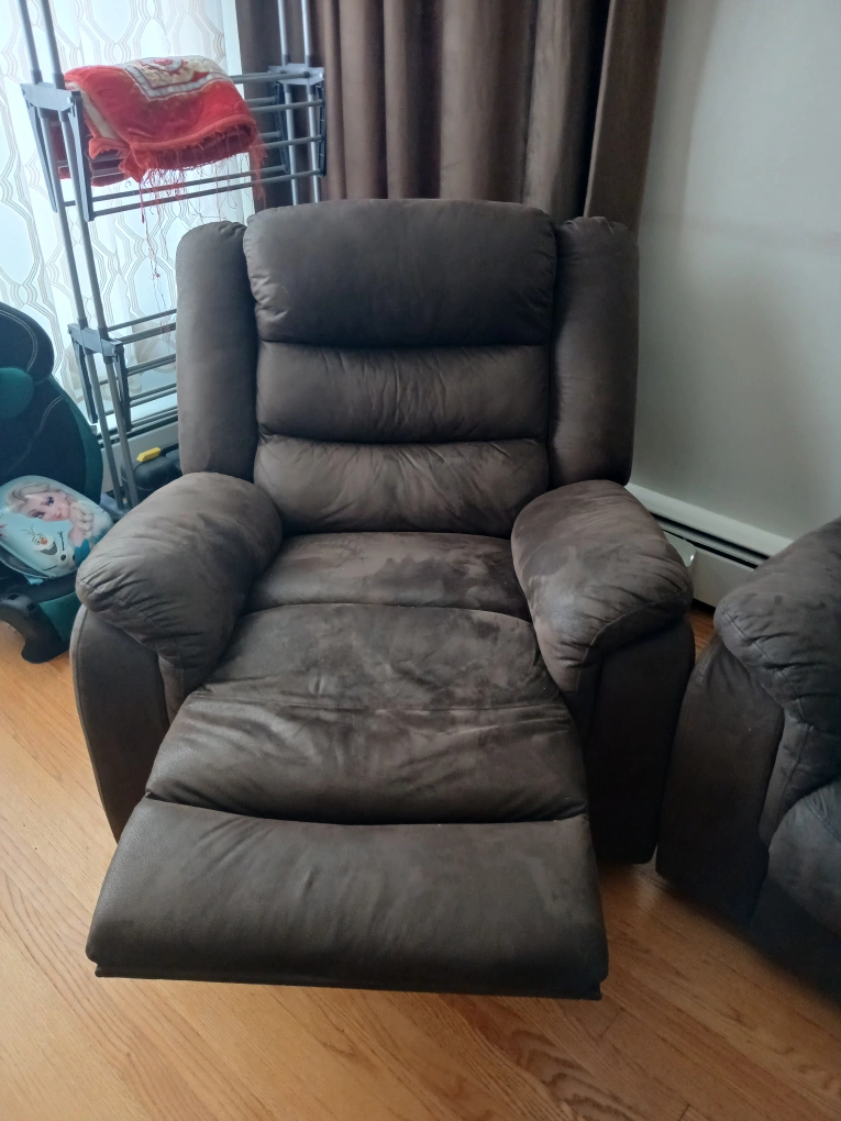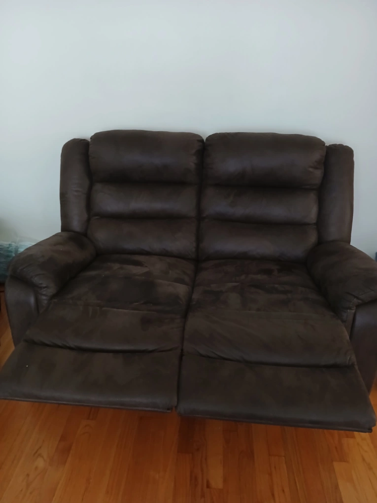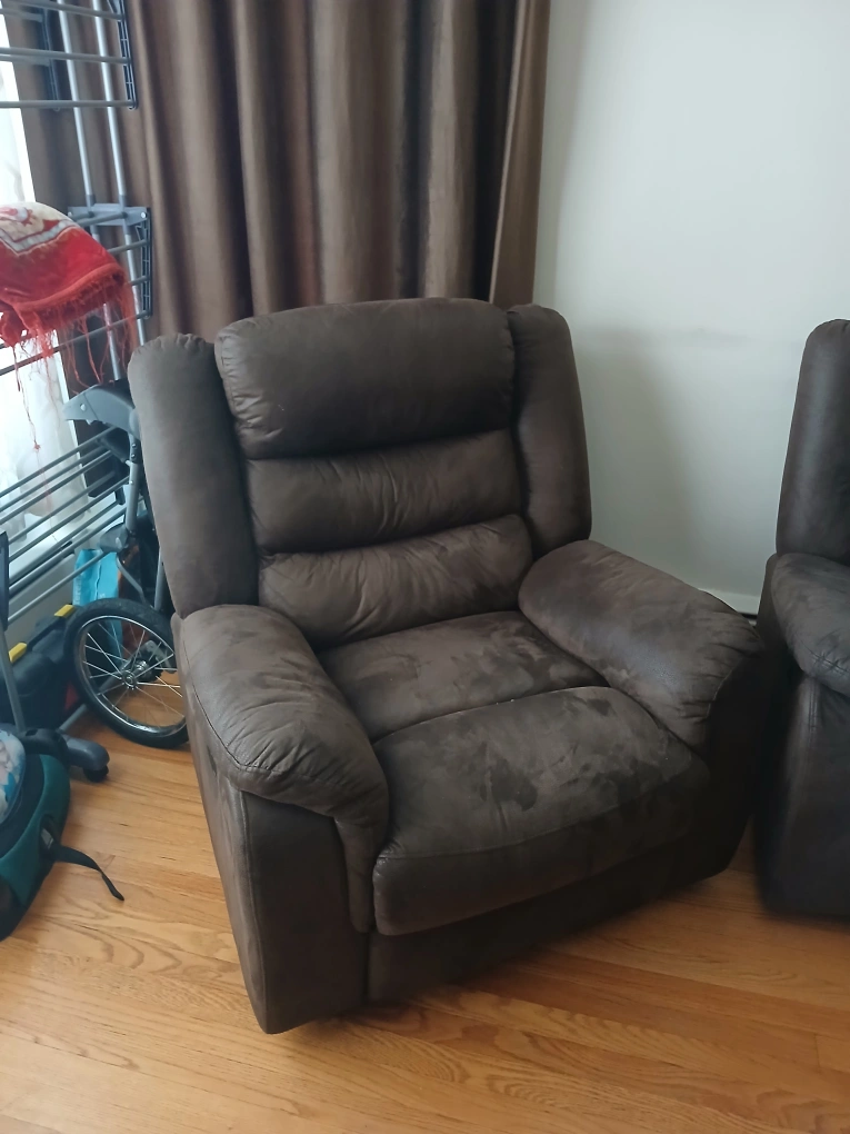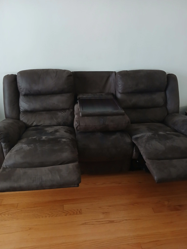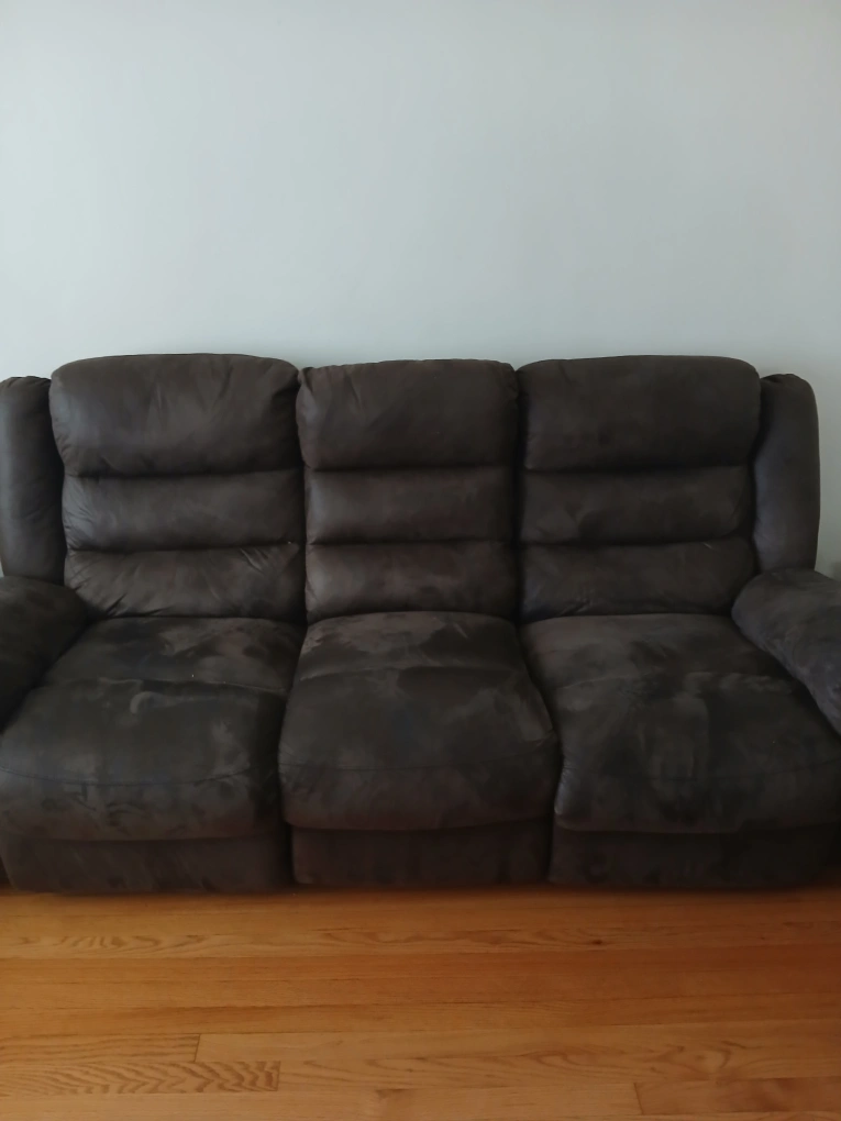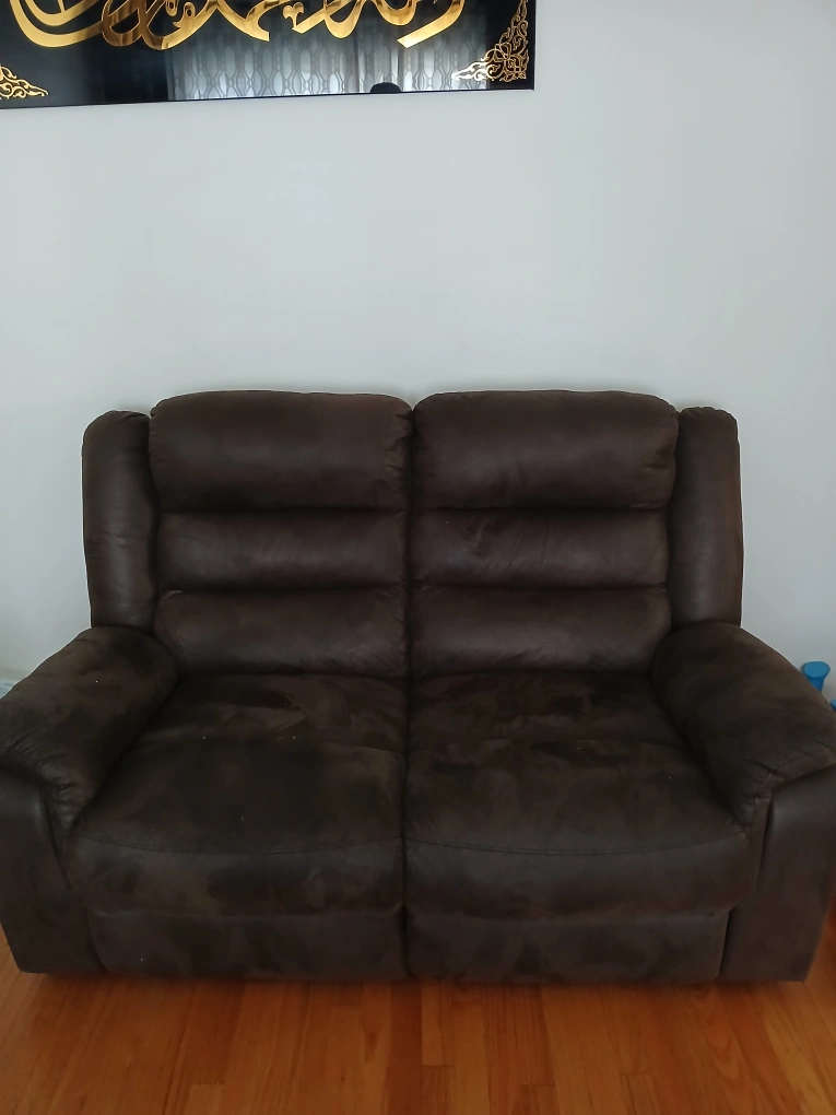 Selling a reclining sofa set in brown. Includes a reclining chair, a two-seater recliner, and a three-seater recliner. Great for a living room or entertainment space it's like new with no rest or scratch purchase price 1600