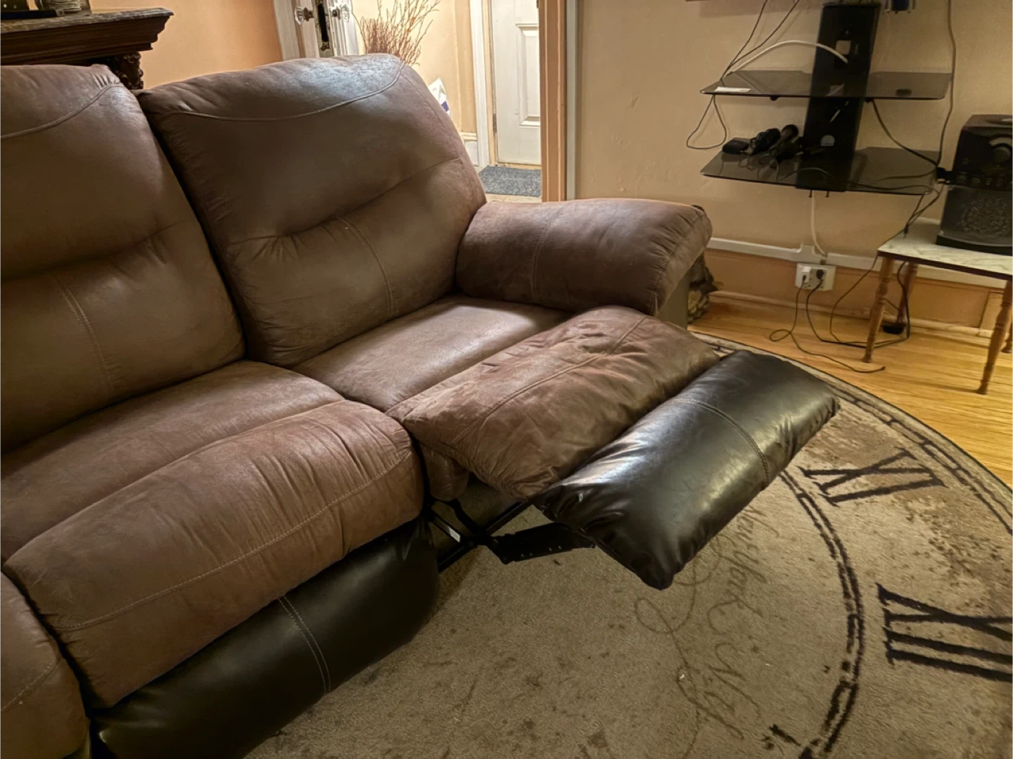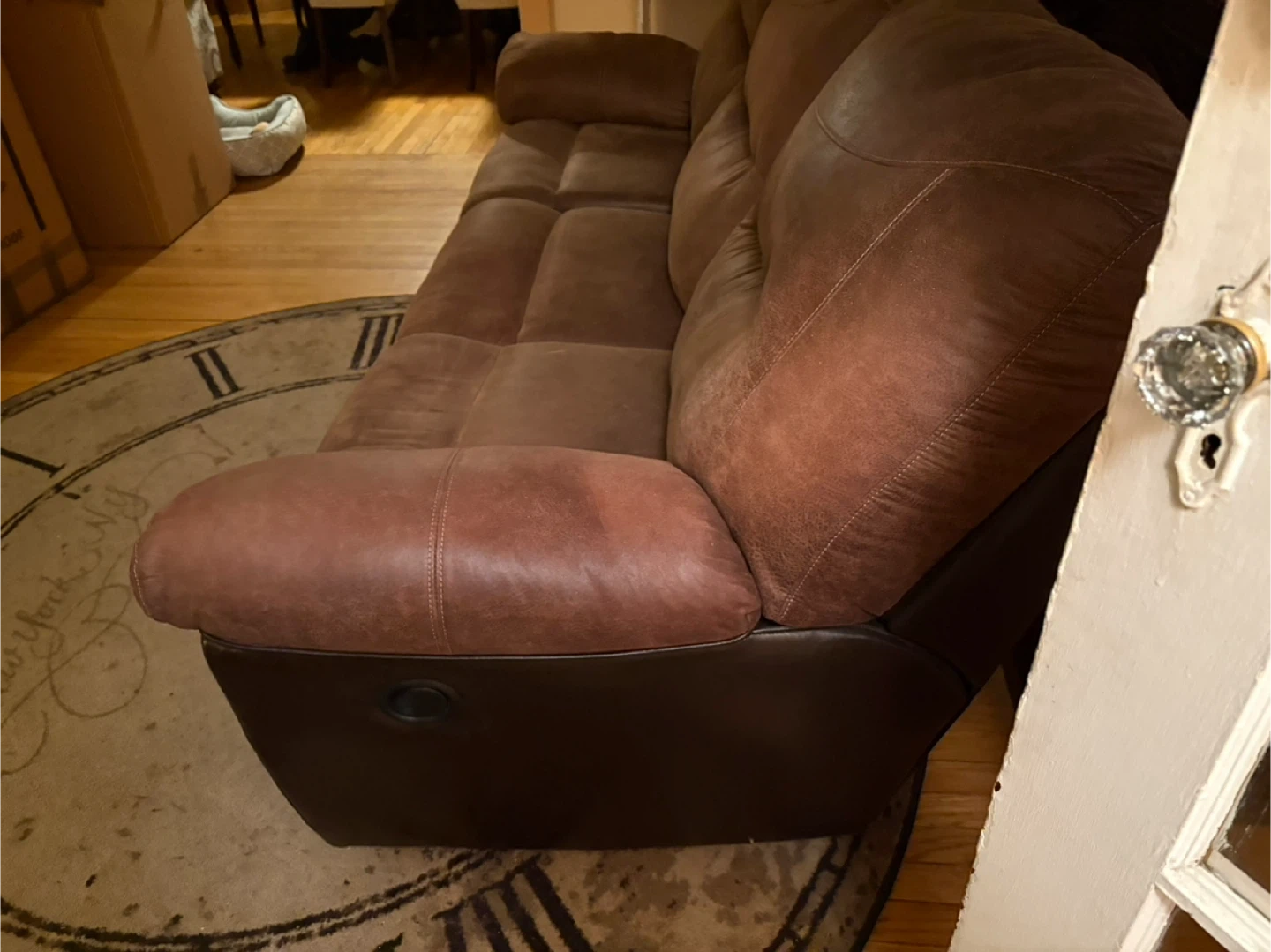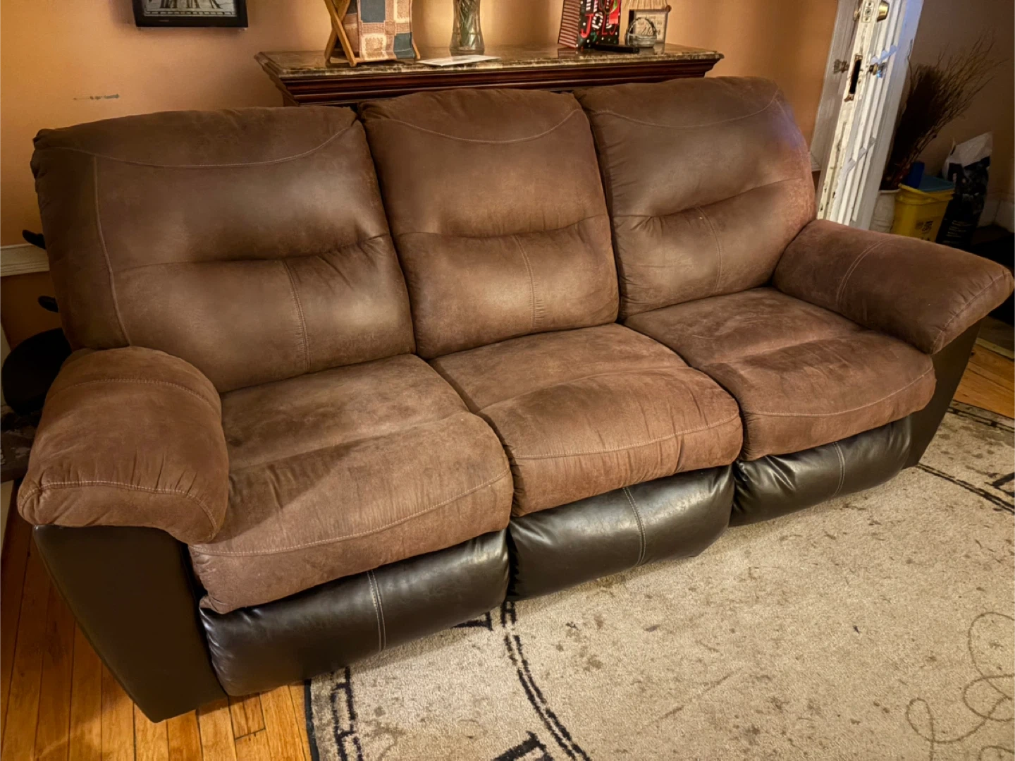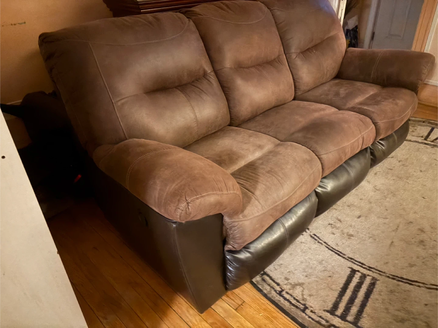 Selling a comfortable brown reclining sofa! It's a great piece for any living room. The sofa features reclining seats, perfect for relaxing after a long day. It is in good condition and ready for a new home!