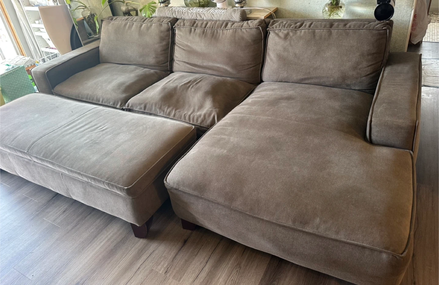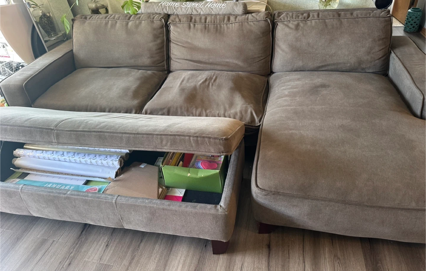 Selling a comfortable brown sectional sofa that includes an ottoman with storage. It's in great condition and perfect for a living room or den. The ottoman provides extra seating or a place to kick up your feet, plus convenient storage for blankets, pillows, or other items. This sectional is ready to add comfort and style to your home!