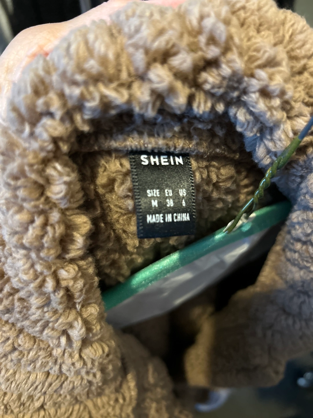 Fuzzy brown jacket with button closure. Two front pockets. Long sleeves. New