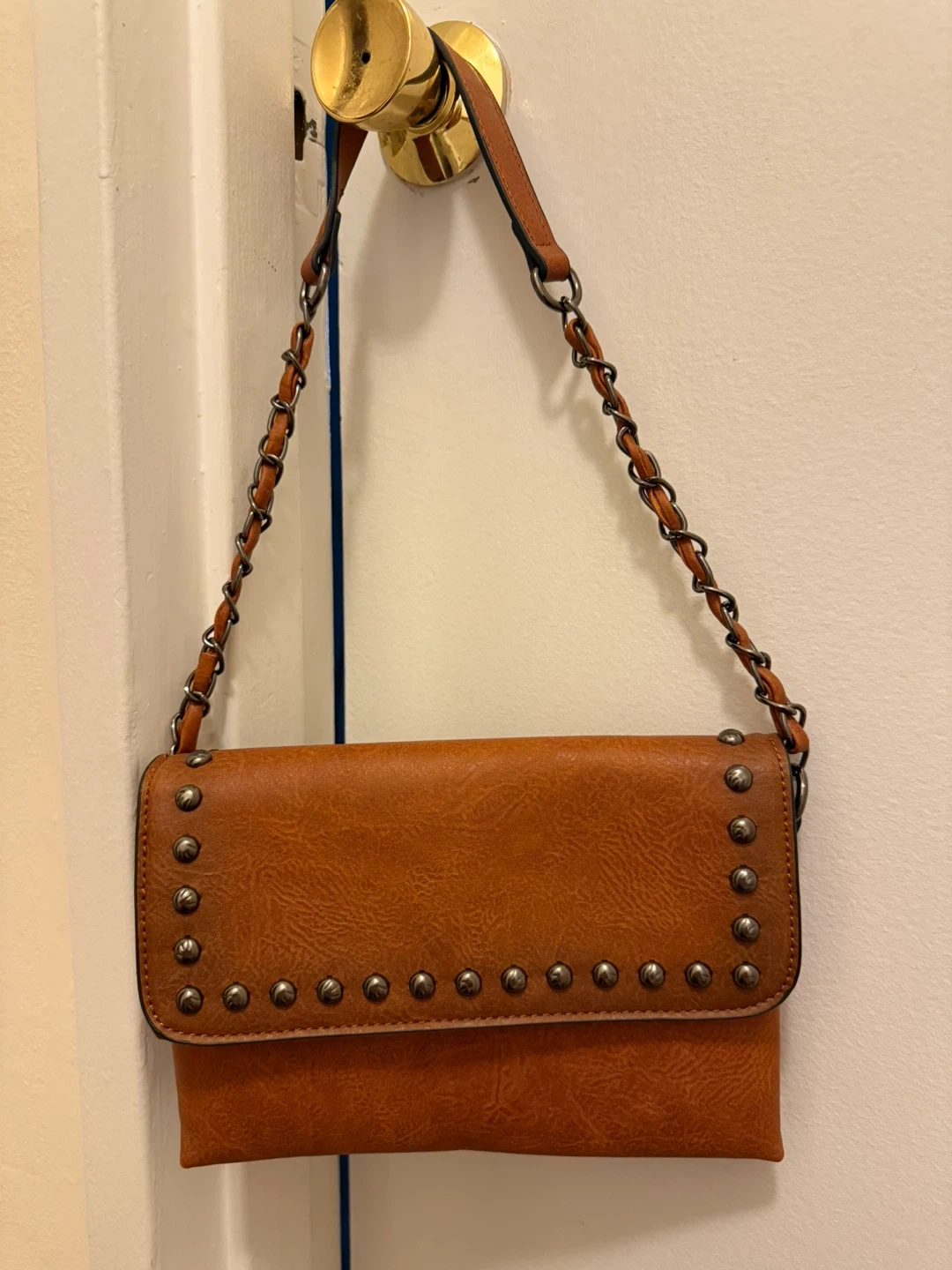 This is a stylish brown clutch purse featuring a chain strap and studded detailing. It's perfect for adding a bit of edge to any outfit. The purse has a magnetic snap closure and interior pockets to keep your belongings organized